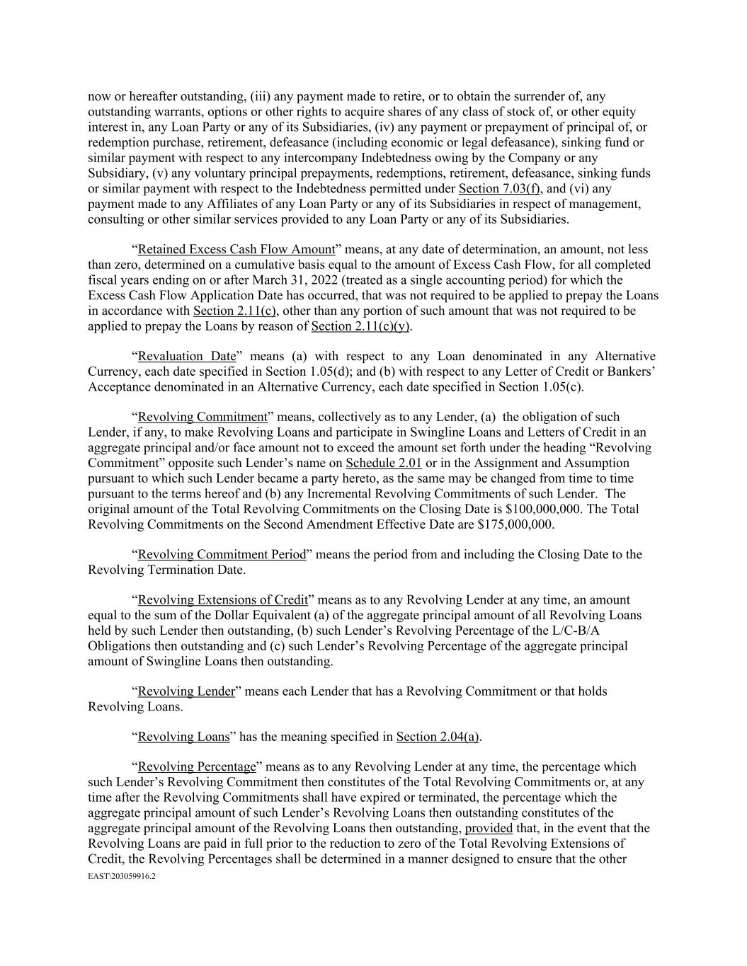 now or hereafter outstanding, (iii) any payment made to retire, or to obtain the surrender of, any outstanding warrants, options or other rights to acquire shares of any class of stock of, or other equity interest in, any Loan Party or any of its Subsidiaries, (iv) any payment or prepayment of principal of, or redemption purchase, retirement, defeasance (including economic or legal defeasance), sinking fund or similar payment with respect to any intercompany Indebtedness owing by the Company or any Subsidiary, (v) any voluntary principal prepayments, redemptions, retirement, defeasance, sinking funds or similar payment with respect to the Indebtedness permitted under Section 7.03(f), and (vi) any payment made to any Affiliates of any Loan Party or any of its Subsidiaries in respect of management, consulting or other similar services provided to any Loan Party or any of its Subsidiaries. “Retained Excess Cash Flow Amount” means, at any date of determination, an amount, not less than zero, determined on a cumulative basis equal to the amount of Excess Cash Flow, for all completed fiscal years ending on or after March 31, 2022 (treated as a single accounting period) for which the Excess Cash Flow Application Date has occurred, that was not required to be applied to prepay the Loans in accordance with Section 2.11(c), other than any portion of such amount that was not required to be applied to prepay the Loans by reason of Section 2.11(c)(y). “Revaluation Date” means (a) with respect to any Loan denominated in any Alternative Currency, each date specified in Section 1.05(d); and (b) with respect to any Letter of Credit or Bankers’ Acceptance denominated in an Alternative Currency, each date specified in Section 1.05(c). “Revolving Commitment” means, collectively as to any Lender, (a) the obligation of such Lender, if any, to make Revolving Loans and participate in Swingline Loans and Letters of Credit in an aggregate principal and/or face amount not to exceed the amount set forth under the heading “Revolving Commitment” opposite such Lender’s name on Schedule 2.01 or in the Assignment and Assumption pursuant to which such Lender became a party hereto, as the same may be changed from time to time pursuant to the terms hereof and (b) any Incremental Revolving Commitments of such Lender. The original amount of the Total Revolving Commitments on the Closing Date is $100,000,000. The Total Revolving Commitments on the Second Amendment Effective Date are $175,000,000. “Revolving Commitment Period” means the period from and including the Closing Date to the Revolving Termination Date. “Revolving Extensions of Credit” means as to any Revolving Lender at any time, an amount equal to the sum of the Dollar Equivalent (a) of the aggregate principal amount of all Revolving Loans held by such Lender then outstanding, (b) such Lender’s Revolving Percentage of the L/C-B/A Obligations then outstanding and (c) such Lender’s Revolving Percentage of the aggregate principal amount of Swingline Loans then outstanding. “Revolving Lender” means each Lender that has a Revolving Commitment or that holds Revolving Loans. “Revolving Loans” has the meaning specified in Section 2.04(a). “Revolving Percentage” means as to any Revolving Lender at any time, the percentage which such Lender’s Revolving Commitment then constitutes of the Total Revolving Commitments or, at any time after the Revolving Commitments shall have expired or terminated, the percentage which the aggregate principal amount of such Lender’s Revolving Loans then outstanding constitutes of the aggregate principal amount of the Revolving Loans then outstanding, provided that, in the event that the Revolving Loans are paid in full prior to the reduction to zero of the Total Revolving Extensions of Credit, the Revolving Percentages shall be determined in a manner designed to ensure that the other EAST\203059916.2