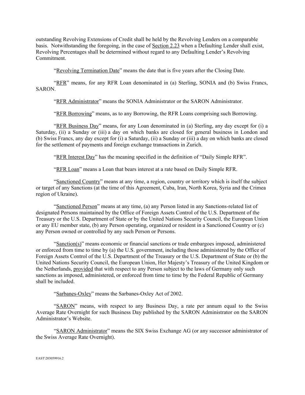 outstanding Revolving Extensions of Credit shall be held by the Revolving Lenders on a comparable basis. Notwithstanding the foregoing, in the case of Section 2.23 when a Defaulting Lender shall exist, Revolving Percentages shall be determined without regard to any Defaulting Lender’s Revolving Commitment. “Revolving Termination Date” means the date that is five years after the Closing Date. “RFR” means, for any RFR Loan denominated in (a) Sterling, SONIA and (b) Swiss Francs, SARON. “RFR Administrator” means the SONIA Administrator or the SARON Administrator. “RFR Borrowing” means, as to any Borrowing, the RFR Loans comprising such Borrowing. “RFR Business Day” means, for any Loan denominated in (a) Sterling, any day except for (i) a Saturday, (ii) a Sunday or (iii) a day on which banks are closed for general business in London and (b) Swiss Francs, any day except for (i) a Saturday, (ii) a Sunday or (iii) a day on which banks are closed for the settlement of payments and foreign exchange transactions in Zurich. “RFR Interest Day” has the meaning specified in the definition of “Daily Simple RFR”. “RFR Loan” means a Loan that bears interest at a rate based on Daily Simple RFR. “Sanctioned Country” means at any time, a region, country or territory which is itself the subject or target of any Sanctions (at the time of this Agreement, Cuba, Iran, North Korea, Syria and the Crimea region of Ukraine). “Sanctioned Person” means at any time, (a) any Person listed in any Sanctions-related list of designated Persons maintained by the Office of Foreign Assets Control of the U.S. Department of the Treasury or the U.S. Department of State or by the United Nations Security Council, the European Union or any EU member state, (b) any Person operating, organized or resident in a Sanctioned Country or (c) any Person owned or controlled by any such Person or Persons. “Sanction(s)” means economic or financial sanctions or trade embargoes imposed, administered or enforced from time to time by (a) the U.S. government, including those administered by the Office of Foreign Assets Control of the U.S. Department of the Treasury or the U.S. Department of State or (b) the United Nations Security Council, the European Union, Her Majesty’s Treasury of the United Kingdom or the Netherlands, provided that with respect to any Person subject to the laws of Germany only such sanctions as imposed, administered, or enforced from time to time by the Federal Republic of Germany shall be included. “Sarbanes-Oxley” means the Sarbanes-Oxley Act of 2002. “SARON” means, with respect to any Business Day, a rate per annum equal to the Swiss Average Rate Overnight for such Business Day published by the SARON Administrator on the SARON Administrator’s Website. “SARON Administrator” means the SIX Swiss Exchange AG (or any successor administrator of the Swiss Average Rate Overnight). EAST\203059916.2