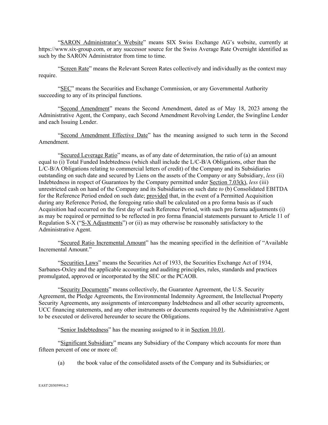 “SARON Administrator’s Website” means SIX Swiss Exchange AG’s website, currently at https://www.six-group.com, or any successor source for the Swiss Average Rate Overnight identified as such by the SARON Administrator from time to time. “Screen Rate” means the Relevant Screen Rates collectively and individually as the context may require. “SEC” means the Securities and Exchange Commission, or any Governmental Authority succeeding to any of its principal functions. “Second Amendment” means the Second Amendment, dated as of May 18, 2023 among the Administrative Agent, the Company, each Second Amendment Revolving Lender, the Swingline Lender and each Issuing Lender. “Second Amendment Effective Date” has the meaning assigned to such term in the Second Amendment. “Secured Leverage Ratio” means, as of any date of determination, the ratio of (a) an amount equal to (i) Total Funded Indebtedness (which shall include the L/C-B/A Obligations, other than the L/C-B/A Obligations relating to commercial letters of credit) of the Company and its Subsidiaries outstanding on such date and secured by Liens on the assets of the Company or any Subsidiary, less (ii) Indebtedness in respect of Guarantees by the Company permitted under Section 7.03(k), less (iii) unrestricted cash on hand of the Company and its Subsidiaries on such date to (b) Consolidated EBITDA for the Reference Period ended on such date; provided that, in the event of a Permitted Acquisition during any Reference Period, the foregoing ratio shall be calculated on a pro forma basis as if such Acquisition had occurred on the first day of such Reference Period, with such pro forma adjustments (i) as may be required or permitted to be reflected in pro forma financial statements pursuant to Article 11 of Regulation S-X (“S-X Adjustments”) or (ii) as may otherwise be reasonably satisfactory to the Administrative Agent. “Secured Ratio Incremental Amount” has the meaning specified in the definition of “Available Incremental Amount.” “Securities Laws” means the Securities Act of 1933, the Securities Exchange Act of 1934, Sarbanes-Oxley and the applicable accounting and auditing principles, rules, standards and practices promulgated, approved or incorporated by the SEC or the PCAOB. “Security Documents” means collectively, the Guarantee Agreement, the U.S. Security Agreement, the Pledge Agreements, the Environmental Indemnity Agreement, the Intellectual Property Security Agreements, any assignments of intercompany Indebtedness and all other security agreements, UCC financing statements, and any other instruments or documents required by the Administrative Agent to be executed or delivered hereunder to secure the Obligations. “Senior Indebtedness” has the meaning assigned to it in Section 10.01. “Significant Subsidiary” means any Subsidiary of the Company which accounts for more than fifteen percent of one or more of: (a) the book value of the consolidated assets of the Company and its Subsidiaries; or EAST\203059916.2