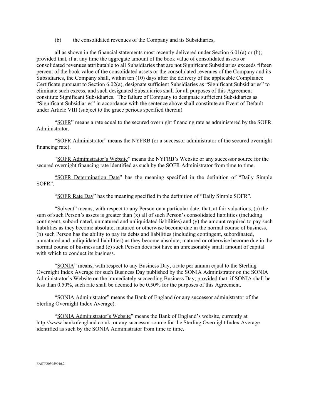 (b) the consolidated revenues of the Company and its Subsidiaries, all as shown in the financial statements most recently delivered under Section 6.01(a) or (b); provided that, if at any time the aggregate amount of the book value of consolidated assets or consolidated revenues attributable to all Subsidiaries that are not Significant Subsidiaries exceeds fifteen percent of the book value of the consolidated assets or the consolidated revenues of the Company and its Subsidiaries, the Company shall, within ten (10) days after the delivery of the applicable Compliance Certificate pursuant to Section 6.02(a), designate sufficient Subsidiaries as “Significant Subsidiaries” to eliminate such excess, and such designated Subsidiaries shall for all purposes of this Agreement constitute Significant Subsidiaries. The failure of Company to designate sufficient Subsidiaries as “Significant Subsidiaries” in accordance with the sentence above shall constitute an Event of Default under Article VIII (subject to the grace periods specified therein). “SOFR” means a rate equal to the secured overnight financing rate as administered by the SOFR Administrator. “SOFR Administrator” means the NYFRB (or a successor administrator of the secured overnight financing rate). “SOFR Administrator’s Website” means the NYFRB’s Website or any successor source for the secured overnight financing rate identified as such by the SOFR Administrator from time to time. “SOFR Determination Date” has the meaning specified in the definition of “Daily Simple SOFR”. “SOFR Rate Day” has the meaning specified in the definition of “Daily Simple SOFR”. “Solvent” means, with respect to any Person on a particular date, that, at fair valuations, (a) the sum of such Person’s assets is greater than (x) all of such Person’s consolidated liabilities (including contingent, subordinated, unmatured and unliquidated liabilities) and (y) the amount required to pay such liabilities as they become absolute, matured or otherwise become due in the normal course of business, (b) such Person has the ability to pay its debts and liabilities (including contingent, subordinated, unmatured and unliquidated liabilities) as they become absolute, matured or otherwise become due in the normal course of business and (c) such Person does not have an unreasonably small amount of capital with which to conduct its business. “SONIA” means, with respect to any Business Day, a rate per annum equal to the Sterling Overnight Index Average for such Business Day published by the SONIA Administrator on the SONIA Administrator’s Website on the immediately succeeding Business Day; provided that, if SONIA shall be less than 0.50%, such rate shall be deemed to be 0.50% for the purposes of this Agreement. “SONIA Administrator” means the Bank of England (or any successor administrator of the Sterling Overnight Index Average). “SONIA Administrator’s Website” means the Bank of England’s website, currently at http://www.bankofengland.co.uk, or any successor source for the Sterling Overnight Index Average identified as such by the SONIA Administrator from time to time. EAST\203059916.2