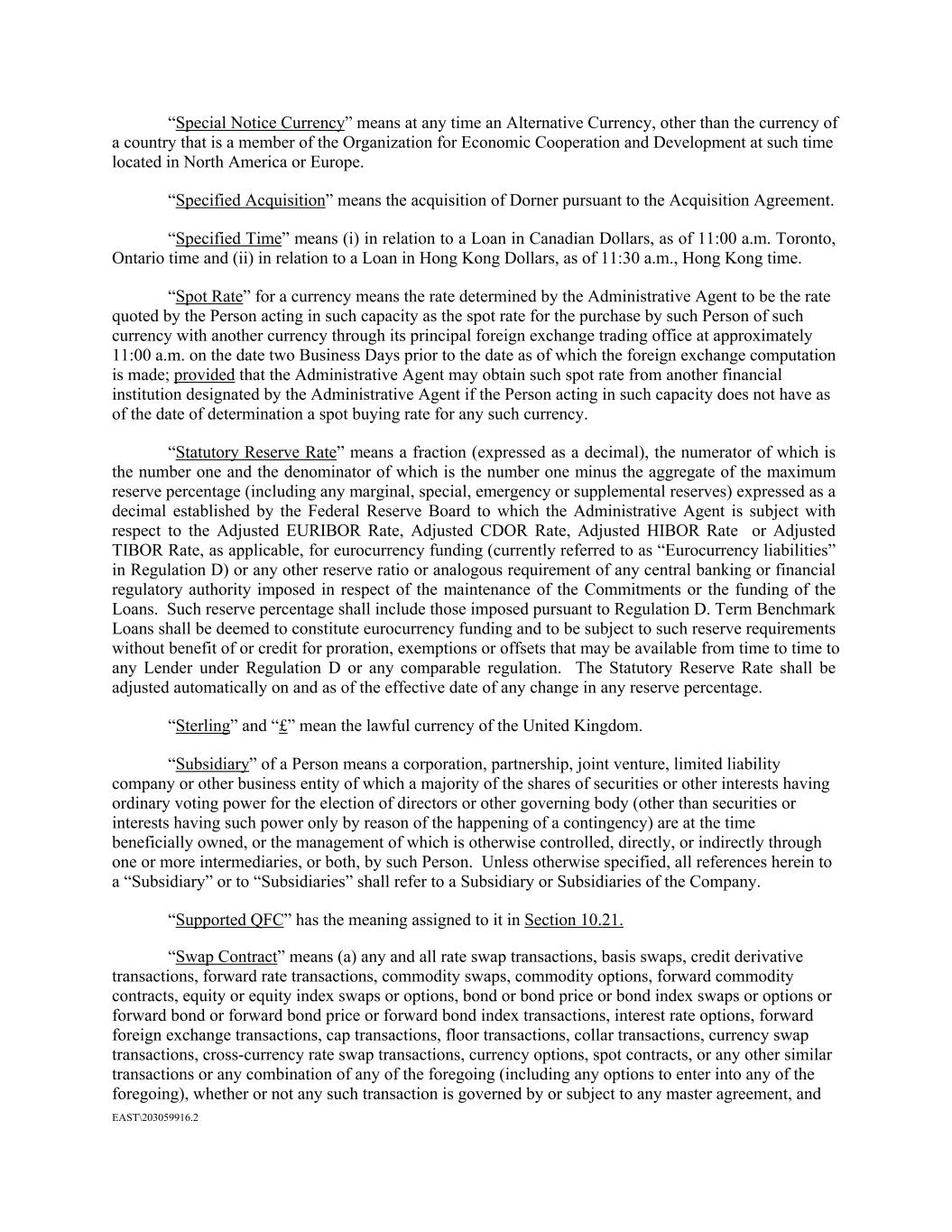 “Special Notice Currency” means at any time an Alternative Currency, other than the currency of a country that is a member of the Organization for Economic Cooperation and Development at such time located in North America or Europe. “Specified Acquisition” means the acquisition of Dorner pursuant to the Acquisition Agreement. “Specified Time” means (i) in relation to a Loan in Canadian Dollars, as of 11:00 a.m. Toronto, Ontario time and (ii) in relation to a Loan in Hong Kong Dollars, as of 11:30 a.m., Hong Kong time. “Spot Rate” for a currency means the rate determined by the Administrative Agent to be the rate quoted by the Person acting in such capacity as the spot rate for the purchase by such Person of such currency with another currency through its principal foreign exchange trading office at approximately 11:00 a.m. on the date two Business Days prior to the date as of which the foreign exchange computation is made; provided that the Administrative Agent may obtain such spot rate from another financial institution designated by the Administrative Agent if the Person acting in such capacity does not have as of the date of determination a spot buying rate for any such currency. “Statutory Reserve Rate” means a fraction (expressed as a decimal), the numerator of which is the number one and the denominator of which is the number one minus the aggregate of the maximum reserve percentage (including any marginal, special, emergency or supplemental reserves) expressed as a decimal established by the Federal Reserve Board to which the Administrative Agent is subject with respect to the Adjusted EURIBOR Rate, Adjusted CDOR Rate, Adjusted HIBOR Rate or Adjusted TIBOR Rate, as applicable, for eurocurrency funding (currently referred to as “Eurocurrency liabilities” in Regulation D) or any other reserve ratio or analogous requirement of any central banking or financial regulatory authority imposed in respect of the maintenance of the Commitments or the funding of the Loans. Such reserve percentage shall include those imposed pursuant to Regulation D. Term Benchmark Loans shall be deemed to constitute eurocurrency funding and to be subject to such reserve requirements without benefit of or credit for proration, exemptions or offsets that may be available from time to time to any Lender under Regulation D or any comparable regulation. The Statutory Reserve Rate shall be adjusted automatically on and as of the effective date of any change in any reserve percentage. “Sterling” and “£” mean the lawful currency of the United Kingdom. “Subsidiary” of a Person means a corporation, partnership, joint venture, limited liability company or other business entity of which a majority of the shares of securities or other interests having ordinary voting power for the election of directors or other governing body (other than securities or interests having such power only by reason of the happening of a contingency) are at the time beneficially owned, or the management of which is otherwise controlled, directly, or indirectly through one or more intermediaries, or both, by such Person. Unless otherwise specified, all references herein to a “Subsidiary” or to “Subsidiaries” shall refer to a Subsidiary or Subsidiaries of the Company. “Supported QFC” has the meaning assigned to it in Section 10.21. “Swap Contract” means (a) any and all rate swap transactions, basis swaps, credit derivative transactions, forward rate transactions, commodity swaps, commodity options, forward commodity contracts, equity or equity index swaps or options, bond or bond price or bond index swaps or options or forward bond or forward bond price or forward bond index transactions, interest rate options, forward foreign exchange transactions, cap transactions, floor transactions, collar transactions, currency swap transactions, cross-currency rate swap transactions, currency options, spot contracts, or any other similar transactions or any combination of any of the foregoing (including any options to enter into any of the foregoing), whether or not any such transaction is governed by or subject to any master agreement, and EAST\203059916.2