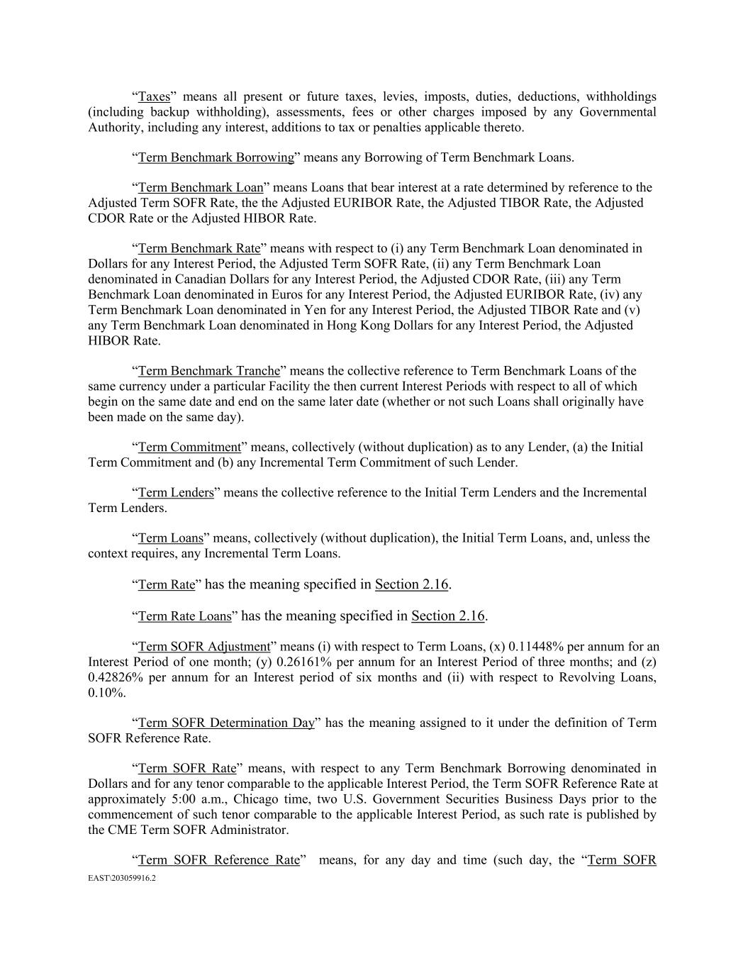 “Taxes” means all present or future taxes, levies, imposts, duties, deductions, withholdings (including backup withholding), assessments, fees or other charges imposed by any Governmental Authority, including any interest, additions to tax or penalties applicable thereto. “Term Benchmark Borrowing” means any Borrowing of Term Benchmark Loans. “Term Benchmark Loan” means Loans that bear interest at a rate determined by reference to the Adjusted Term SOFR Rate, the the Adjusted EURIBOR Rate, the Adjusted TIBOR Rate, the Adjusted CDOR Rate or the Adjusted HIBOR Rate. “Term Benchmark Rate” means with respect to (i) any Term Benchmark Loan denominated in Dollars for any Interest Period, the Adjusted Term SOFR Rate, (ii) any Term Benchmark Loan denominated in Canadian Dollars for any Interest Period, the Adjusted CDOR Rate, (iii) any Term Benchmark Loan denominated in Euros for any Interest Period, the Adjusted EURIBOR Rate, (iv) any Term Benchmark Loan denominated in Yen for any Interest Period, the Adjusted TIBOR Rate and (v) any Term Benchmark Loan denominated in Hong Kong Dollars for any Interest Period, the Adjusted HIBOR Rate. “Term Benchmark Tranche” means the collective reference to Term Benchmark Loans of the same currency under a particular Facility the then current Interest Periods with respect to all of which begin on the same date and end on the same later date (whether or not such Loans shall originally have been made on the same day). “Term Commitment” means, collectively (without duplication) as to any Lender, (a) the Initial Term Commitment and (b) any Incremental Term Commitment of such Lender. “Term Lenders” means the collective reference to the Initial Term Lenders and the Incremental Term Lenders. “Term Loans” means, collectively (without duplication), the Initial Term Loans, and, unless the context requires, any Incremental Term Loans. “Term Rate” has the meaning specified in Section 2.16. “Term Rate Loans” has the meaning specified in Section 2.16. “Term SOFR Adjustment” means (i) with respect to Term Loans, (x) 0.11448% per annum for an Interest Period of one month; (y) 0.26161% per annum for an Interest Period of three months; and (z) 0.42826% per annum for an Interest period of six months and (ii) with respect to Revolving Loans, 0.10%. “Term SOFR Determination Day” has the meaning assigned to it under the definition of Term SOFR Reference Rate. “Term SOFR Rate” means, with respect to any Term Benchmark Borrowing denominated in Dollars and for any tenor comparable to the applicable Interest Period, the Term SOFR Reference Rate at approximately 5:00 a.m., Chicago time, two U.S. Government Securities Business Days prior to the commencement of such tenor comparable to the applicable Interest Period, as such rate is published by the CME Term SOFR Administrator. “Term SOFR Reference Rate” means, for any day and time (such day, the “Term SOFR EAST\203059916.2