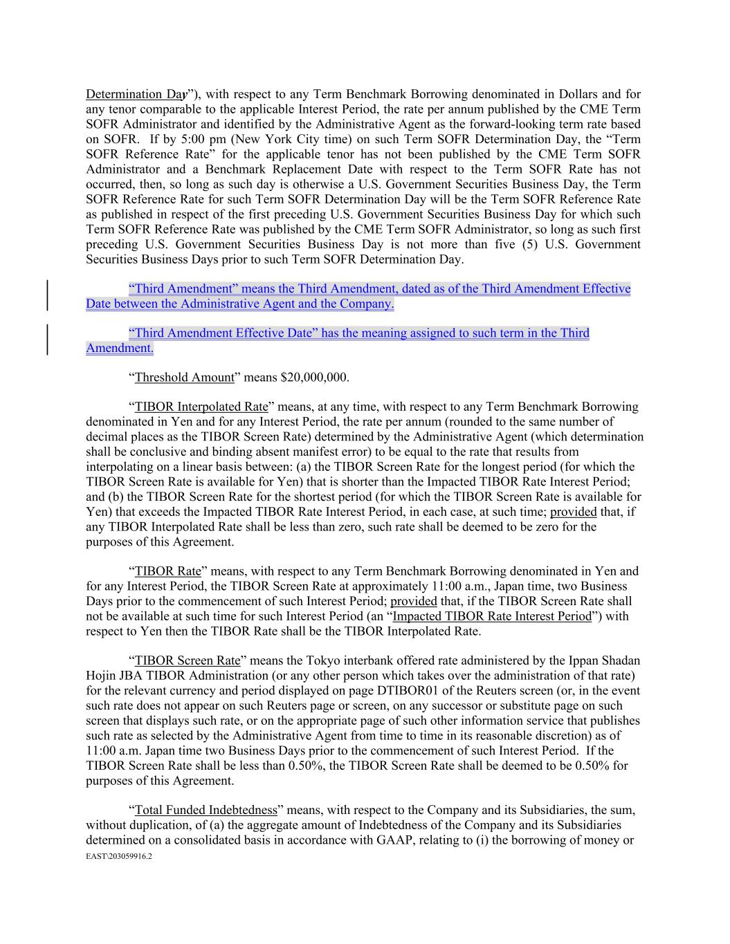 Determination Day”), with respect to any Term Benchmark Borrowing denominated in Dollars and for any tenor comparable to the applicable Interest Period, the rate per annum published by the CME Term SOFR Administrator and identified by the Administrative Agent as the forward-looking term rate based on SOFR. If by 5:00 pm (New York City time) on such Term SOFR Determination Day, the “Term SOFR Reference Rate” for the applicable tenor has not been published by the CME Term SOFR Administrator and a Benchmark Replacement Date with respect to the Term SOFR Rate has not occurred, then, so long as such day is otherwise a U.S. Government Securities Business Day, the Term SOFR Reference Rate for such Term SOFR Determination Day will be the Term SOFR Reference Rate as published in respect of the first preceding U.S. Government Securities Business Day for which such Term SOFR Reference Rate was published by the CME Term SOFR Administrator, so long as such first preceding U.S. Government Securities Business Day is not more than five (5) U.S. Government Securities Business Days prior to such Term SOFR Determination Day. “Third Amendment” means the Third Amendment, dated as of the Third Amendment Effective Date between the Administrative Agent and the Company. “Third Amendment Effective Date” has the meaning assigned to such term in the Third Amendment. “Threshold Amount” means $20,000,000. “TIBOR Interpolated Rate” means, at any time, with respect to any Term Benchmark Borrowing denominated in Yen and for any Interest Period, the rate per annum (rounded to the same number of decimal places as the TIBOR Screen Rate) determined by the Administrative Agent (which determination shall be conclusive and binding absent manifest error) to be equal to the rate that results from interpolating on a linear basis between: (a) the TIBOR Screen Rate for the longest period (for which the TIBOR Screen Rate is available for Yen) that is shorter than the Impacted TIBOR Rate Interest Period; and (b) the TIBOR Screen Rate for the shortest period (for which the TIBOR Screen Rate is available for Yen) that exceeds the Impacted TIBOR Rate Interest Period, in each case, at such time; provided that, if any TIBOR Interpolated Rate shall be less than zero, such rate shall be deemed to be zero for the purposes of this Agreement. “TIBOR Rate” means, with respect to any Term Benchmark Borrowing denominated in Yen and for any Interest Period, the TIBOR Screen Rate at approximately 11:00 a.m., Japan time, two Business Days prior to the commencement of such Interest Period; provided that, if the TIBOR Screen Rate shall not be available at such time for such Interest Period (an “Impacted TIBOR Rate Interest Period”) with respect to Yen then the TIBOR Rate shall be the TIBOR Interpolated Rate. “TIBOR Screen Rate” means the Tokyo interbank offered rate administered by the Ippan Shadan Hojin JBA TIBOR Administration (or any other person which takes over the administration of that rate) for the relevant currency and period displayed on page DTIBOR01 of the Reuters screen (or, in the event such rate does not appear on such Reuters page or screen, on any successor or substitute page on such screen that displays such rate, or on the appropriate page of such other information service that publishes such rate as selected by the Administrative Agent from time to time in its reasonable discretion) as of 11:00 a.m. Japan time two Business Days prior to the commencement of such Interest Period. If the TIBOR Screen Rate shall be less than 0.50%, the TIBOR Screen Rate shall be deemed to be 0.50% for purposes of this Agreement. “Total Funded Indebtedness” means, with respect to the Company and its Subsidiaries, the sum, without duplication, of (a) the aggregate amount of Indebtedness of the Company and its Subsidiaries determined on a consolidated basis in accordance with GAAP, relating to (i) the borrowing of money or EAST\203059916.2