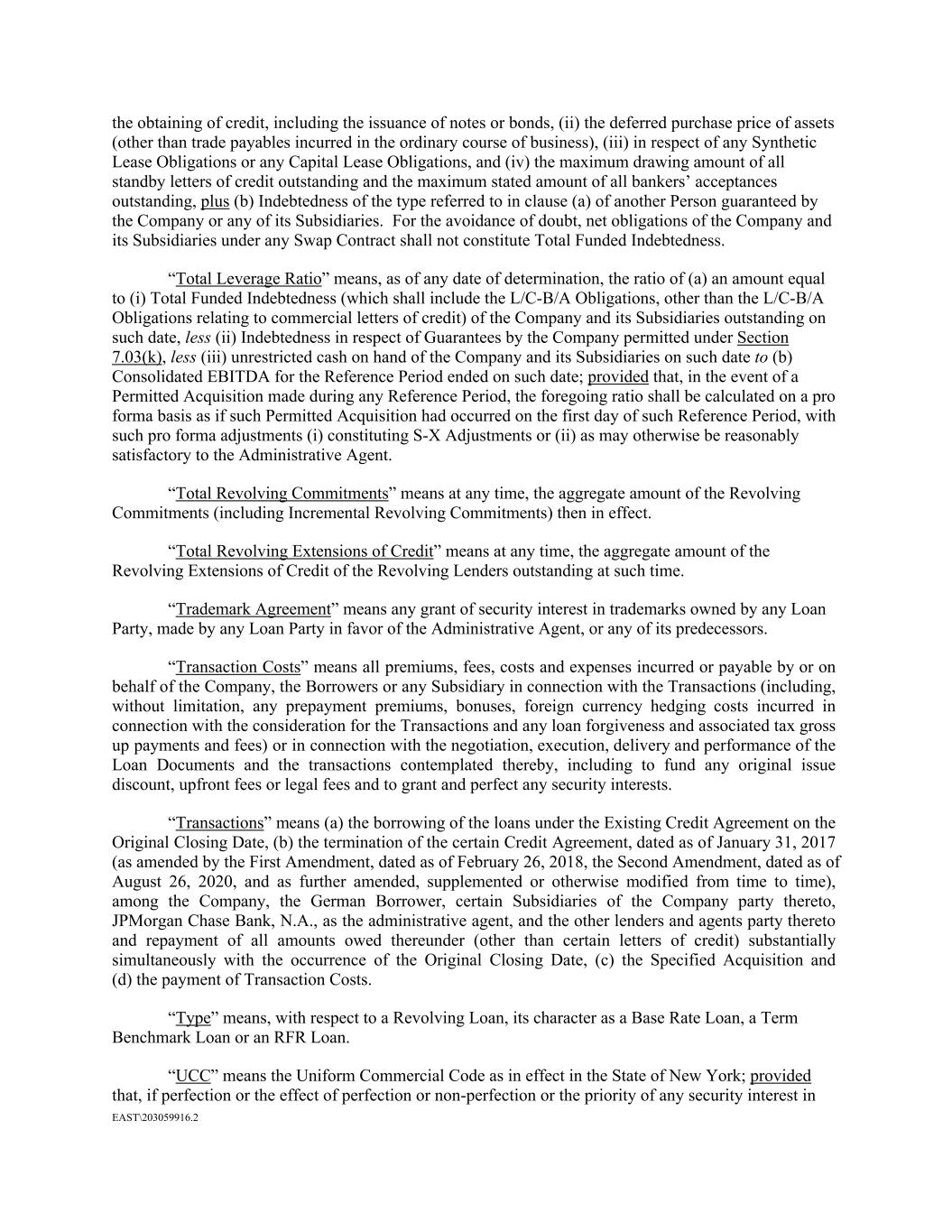 the obtaining of credit, including the issuance of notes or bonds, (ii) the deferred purchase price of assets (other than trade payables incurred in the ordinary course of business), (iii) in respect of any Synthetic Lease Obligations or any Capital Lease Obligations, and (iv) the maximum drawing amount of all standby letters of credit outstanding and the maximum stated amount of all bankers’ acceptances outstanding, plus (b) Indebtedness of the type referred to in clause (a) of another Person guaranteed by the Company or any of its Subsidiaries. For the avoidance of doubt, net obligations of the Company and its Subsidiaries under any Swap Contract shall not constitute Total Funded Indebtedness. “Total Leverage Ratio” means, as of any date of determination, the ratio of (a) an amount equal to (i) Total Funded Indebtedness (which shall include the L/C-B/A Obligations, other than the L/C-B/A Obligations relating to commercial letters of credit) of the Company and its Subsidiaries outstanding on such date, less (ii) Indebtedness in respect of Guarantees by the Company permitted under Section 7.03(k), less (iii) unrestricted cash on hand of the Company and its Subsidiaries on such date to (b) Consolidated EBITDA for the Reference Period ended on such date; provided that, in the event of a Permitted Acquisition made during any Reference Period, the foregoing ratio shall be calculated on a pro forma basis as if such Permitted Acquisition had occurred on the first day of such Reference Period, with such pro forma adjustments (i) constituting S-X Adjustments or (ii) as may otherwise be reasonably satisfactory to the Administrative Agent. “Total Revolving Commitments” means at any time, the aggregate amount of the Revolving Commitments (including Incremental Revolving Commitments) then in effect. “Total Revolving Extensions of Credit” means at any time, the aggregate amount of the Revolving Extensions of Credit of the Revolving Lenders outstanding at such time. “Trademark Agreement” means any grant of security interest in trademarks owned by any Loan Party, made by any Loan Party in favor of the Administrative Agent, or any of its predecessors. “Transaction Costs” means all premiums, fees, costs and expenses incurred or payable by or on behalf of the Company, the Borrowers or any Subsidiary in connection with the Transactions (including, without limitation, any prepayment premiums, bonuses, foreign currency hedging costs incurred in connection with the consideration for the Transactions and any loan forgiveness and associated tax gross up payments and fees) or in connection with the negotiation, execution, delivery and performance of the Loan Documents and the transactions contemplated thereby, including to fund any original issue discount, upfront fees or legal fees and to grant and perfect any security interests. “Transactions” means (a) the borrowing of the loans under the Existing Credit Agreement on the Original Closing Date, (b) the termination of the certain Credit Agreement, dated as of January 31, 2017 (as amended by the First Amendment, dated as of February 26, 2018, the Second Amendment, dated as of August 26, 2020, and as further amended, supplemented or otherwise modified from time to time), among the Company, the German Borrower, certain Subsidiaries of the Company party thereto, JPMorgan Chase Bank, N.A., as the administrative agent, and the other lenders and agents party thereto and repayment of all amounts owed thereunder (other than certain letters of credit) substantially simultaneously with the occurrence of the Original Closing Date, (c) the Specified Acquisition and (d) the payment of Transaction Costs. “Type” means, with respect to a Revolving Loan, its character as a Base Rate Loan, a Term Benchmark Loan or an RFR Loan. “UCC” means the Uniform Commercial Code as in effect in the State of New York; provided that, if perfection or the effect of perfection or non-perfection or the priority of any security interest in EAST\203059916.2