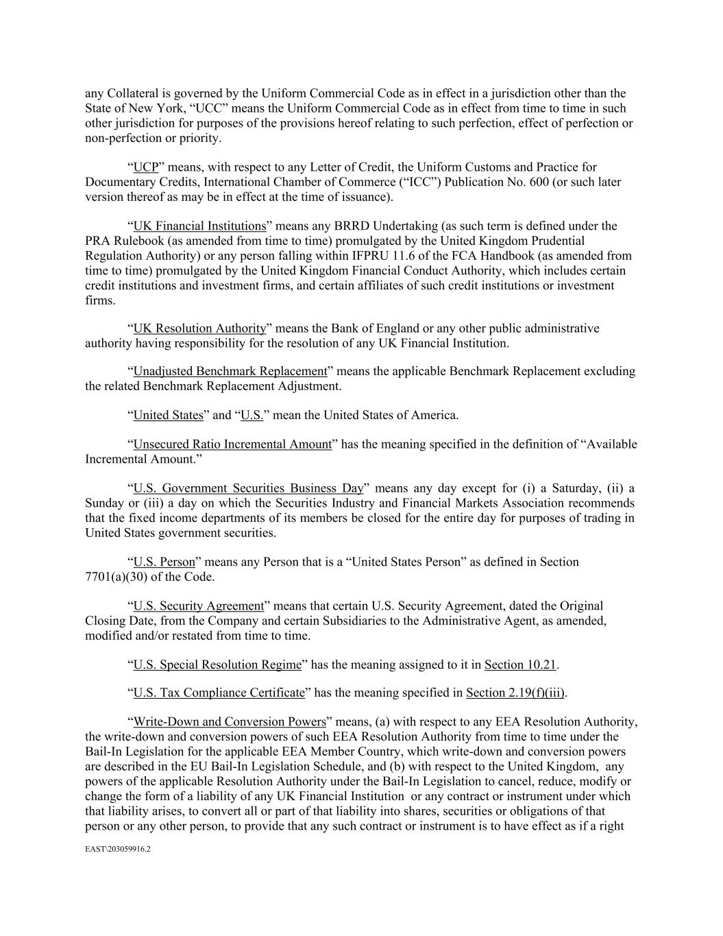 any Collateral is governed by the Uniform Commercial Code as in effect in a jurisdiction other than the State of New York, “UCC” means the Uniform Commercial Code as in effect from time to time in such other jurisdiction for purposes of the provisions hereof relating to such perfection, effect of perfection or non-perfection or priority. “UCP” means, with respect to any Letter of Credit, the Uniform Customs and Practice for Documentary Credits, International Chamber of Commerce (“ICC”) Publication No. 600 (or such later version thereof as may be in effect at the time of issuance). “UK Financial Institutions” means any BRRD Undertaking (as such term is defined under the PRA Rulebook (as amended from time to time) promulgated by the United Kingdom Prudential Regulation Authority) or any person falling within IFPRU 11.6 of the FCA Handbook (as amended from time to time) promulgated by the United Kingdom Financial Conduct Authority, which includes certain credit institutions and investment firms, and certain affiliates of such credit institutions or investment firms. “UK Resolution Authority” means the Bank of England or any other public administrative authority having responsibility for the resolution of any UK Financial Institution. “Unadjusted Benchmark Replacement” means the applicable Benchmark Replacement excluding the related Benchmark Replacement Adjustment. “United States” and “U.S.” mean the United States of America. “Unsecured Ratio Incremental Amount” has the meaning specified in the definition of “Available Incremental Amount.” “U.S. Government Securities Business Day” means any day except for (i) a Saturday, (ii) a Sunday or (iii) a day on which the Securities Industry and Financial Markets Association recommends that the fixed income departments of its members be closed for the entire day for purposes of trading in United States government securities. “U.S. Person” means any Person that is a “United States Person” as defined in Section 7701(a)(30) of the Code. “U.S. Security Agreement” means that certain U.S. Security Agreement, dated the Original Closing Date, from the Company and certain Subsidiaries to the Administrative Agent, as amended, modified and/or restated from time to time. “U.S. Special Resolution Regime” has the meaning assigned to it in Section 10.21. “U.S. Tax Compliance Certificate” has the meaning specified in Section 2.19(f)(iii). “Write-Down and Conversion Powers” means, (a) with respect to any EEA Resolution Authority, the write-down and conversion powers of such EEA Resolution Authority from time to time under the Bail-In Legislation for the applicable EEA Member Country, which write-down and conversion powers are described in the EU Bail-In Legislation Schedule, and (b) with respect to the United Kingdom, any powers of the applicable Resolution Authority under the Bail-In Legislation to cancel, reduce, modify or change the form of a liability of any UK Financial Institution or any contract or instrument under which that liability arises, to convert all or part of that liability into shares, securities or obligations of that person or any other person, to provide that any such contract or instrument is to have effect as if a right EAST\203059916.2