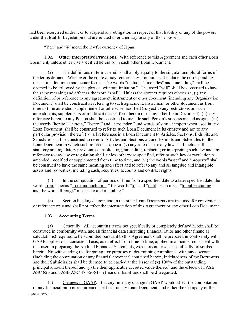had been exercised under it or to suspend any obligation in respect of that liability or any of the powers under that Bail-In Legislation that are related to or ancillary to any of those powers. “Yen” and “¥” mean the lawful currency of Japan. 1.02. Other Interpretive Provisions. With reference to this Agreement and each other Loan Document, unless otherwise specified herein or in such other Loan Document: (a) The definitions of terms herein shall apply equally to the singular and plural forms of the terms defined. Whenever the context may require, any pronoun shall include the corresponding masculine, feminine and neuter forms. The words “include,” “includes” and “including” shall be deemed to be followed by the phrase “without limitation.” The word “will” shall be construed to have the same meaning and effect as the word “shall.” Unless the context requires otherwise, (i) any definition of or reference to any agreement, instrument or other document (including any Organization Document) shall be construed as referring to such agreement, instrument or other document as from time to time amended, supplemented or otherwise modified (subject to any restrictions on such amendments, supplements or modifications set forth herein or in any other Loan Document), (ii) any reference herein to any Person shall be construed to include such Person’s successors and assigns, (iii) the words “hereto,” “herein,” “hereof” and “hereunder,” and words of similar import when used in any Loan Document, shall be construed to refer to such Loan Document in its entirety and not to any particular provision thereof, (iv) all references in a Loan Document to Articles, Sections, Exhibits and Schedules shall be construed to refer to Articles and Sections of, and Exhibits and Schedules to, the Loan Document in which such references appear, (v) any reference to any law shall include all statutory and regulatory provisions consolidating, amending, replacing or interpreting such law and any reference to any law or regulation shall, unless otherwise specified, refer to such law or regulation as amended, modified or supplemented from time to time, and (vi) the words “asset” and “property” shall be construed to have the same meaning and effect and to refer to any and all tangible and intangible assets and properties, including cash, securities, accounts and contract rights. (b) In the computation of periods of time from a specified date to a later specified date, the word “from” means “from and including;” the words “to” and “until” each mean “to but excluding;” and the word “through” means “to and including.” (c) Section headings herein and in the other Loan Documents are included for convenience of reference only and shall not affect the interpretation of this Agreement or any other Loan Document. 1.03. Accounting Terms. (a) Generally. All accounting terms not specifically or completely defined herein shall be construed in conformity with, and all financial data (including financial ratios and other financial calculations) required to be submitted pursuant to this Agreement shall be prepared in conformity with, GAAP applied on a consistent basis, as in effect from time to time, applied in a manner consistent with that used in preparing the Audited Financial Statements, except as otherwise specifically prescribed herein. Notwithstanding the foregoing, for purposes of determining compliance with any covenant (including the computation of any financial covenant) contained herein, Indebtedness of the Borrowers and their Subsidiaries shall be deemed to be carried at the lesser of (x) 100% of the outstanding principal amount thereof and (y) the then-applicable accreted value thereof, and the effects of FASB ASC 825 and FASB ASC 470-2064 on financial liabilities shall be disregarded. (b) Changes in GAAP. If at any time any change in GAAP would affect the computation of any financial ratio or requirement set forth in any Loan Document, and either the Company or the EAST\203059916.2