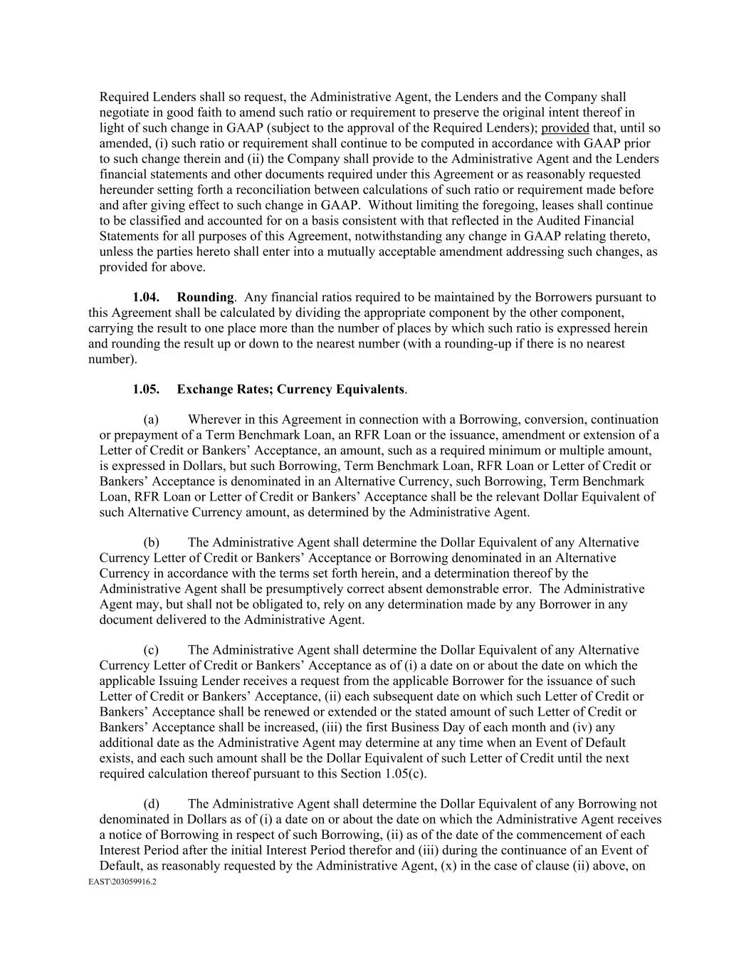 Required Lenders shall so request, the Administrative Agent, the Lenders and the Company shall negotiate in good faith to amend such ratio or requirement to preserve the original intent thereof in light of such change in GAAP (subject to the approval of the Required Lenders); provided that, until so amended, (i) such ratio or requirement shall continue to be computed in accordance with GAAP prior to such change therein and (ii) the Company shall provide to the Administrative Agent and the Lenders financial statements and other documents required under this Agreement or as reasonably requested hereunder setting forth a reconciliation between calculations of such ratio or requirement made before and after giving effect to such change in GAAP. Without limiting the foregoing, leases shall continue to be classified and accounted for on a basis consistent with that reflected in the Audited Financial Statements for all purposes of this Agreement, notwithstanding any change in GAAP relating thereto, unless the parties hereto shall enter into a mutually acceptable amendment addressing such changes, as provided for above. 1.04. Rounding. Any financial ratios required to be maintained by the Borrowers pursuant to this Agreement shall be calculated by dividing the appropriate component by the other component, carrying the result to one place more than the number of places by which such ratio is expressed herein and rounding the result up or down to the nearest number (with a rounding-up if there is no nearest number). 1.05. Exchange Rates; Currency Equivalents. (a) Wherever in this Agreement in connection with a Borrowing, conversion, continuation or prepayment of a Term Benchmark Loan, an RFR Loan or the issuance, amendment or extension of a Letter of Credit or Bankers’ Acceptance, an amount, such as a required minimum or multiple amount, is expressed in Dollars, but such Borrowing, Term Benchmark Loan, RFR Loan or Letter of Credit or Bankers’ Acceptance is denominated in an Alternative Currency, such Borrowing, Term Benchmark Loan, RFR Loan or Letter of Credit or Bankers’ Acceptance shall be the relevant Dollar Equivalent of such Alternative Currency amount, as determined by the Administrative Agent. (b) The Administrative Agent shall determine the Dollar Equivalent of any Alternative Currency Letter of Credit or Bankers’ Acceptance or Borrowing denominated in an Alternative Currency in accordance with the terms set forth herein, and a determination thereof by the Administrative Agent shall be presumptively correct absent demonstrable error. The Administrative Agent may, but shall not be obligated to, rely on any determination made by any Borrower in any document delivered to the Administrative Agent. (c) The Administrative Agent shall determine the Dollar Equivalent of any Alternative Currency Letter of Credit or Bankers’ Acceptance as of (i) a date on or about the date on which the applicable Issuing Lender receives a request from the applicable Borrower for the issuance of such Letter of Credit or Bankers’ Acceptance, (ii) each subsequent date on which such Letter of Credit or Bankers’ Acceptance shall be renewed or extended or the stated amount of such Letter of Credit or Bankers’ Acceptance shall be increased, (iii) the first Business Day of each month and (iv) any additional date as the Administrative Agent may determine at any time when an Event of Default exists, and each such amount shall be the Dollar Equivalent of such Letter of Credit until the next required calculation thereof pursuant to this Section 1.05(c). (d) The Administrative Agent shall determine the Dollar Equivalent of any Borrowing not denominated in Dollars as of (i) a date on or about the date on which the Administrative Agent receives a notice of Borrowing in respect of such Borrowing, (ii) as of the date of the commencement of each Interest Period after the initial Interest Period therefor and (iii) during the continuance of an Event of Default, as reasonably requested by the Administrative Agent, (x) in the case of clause (ii) above, on EAST\203059916.2