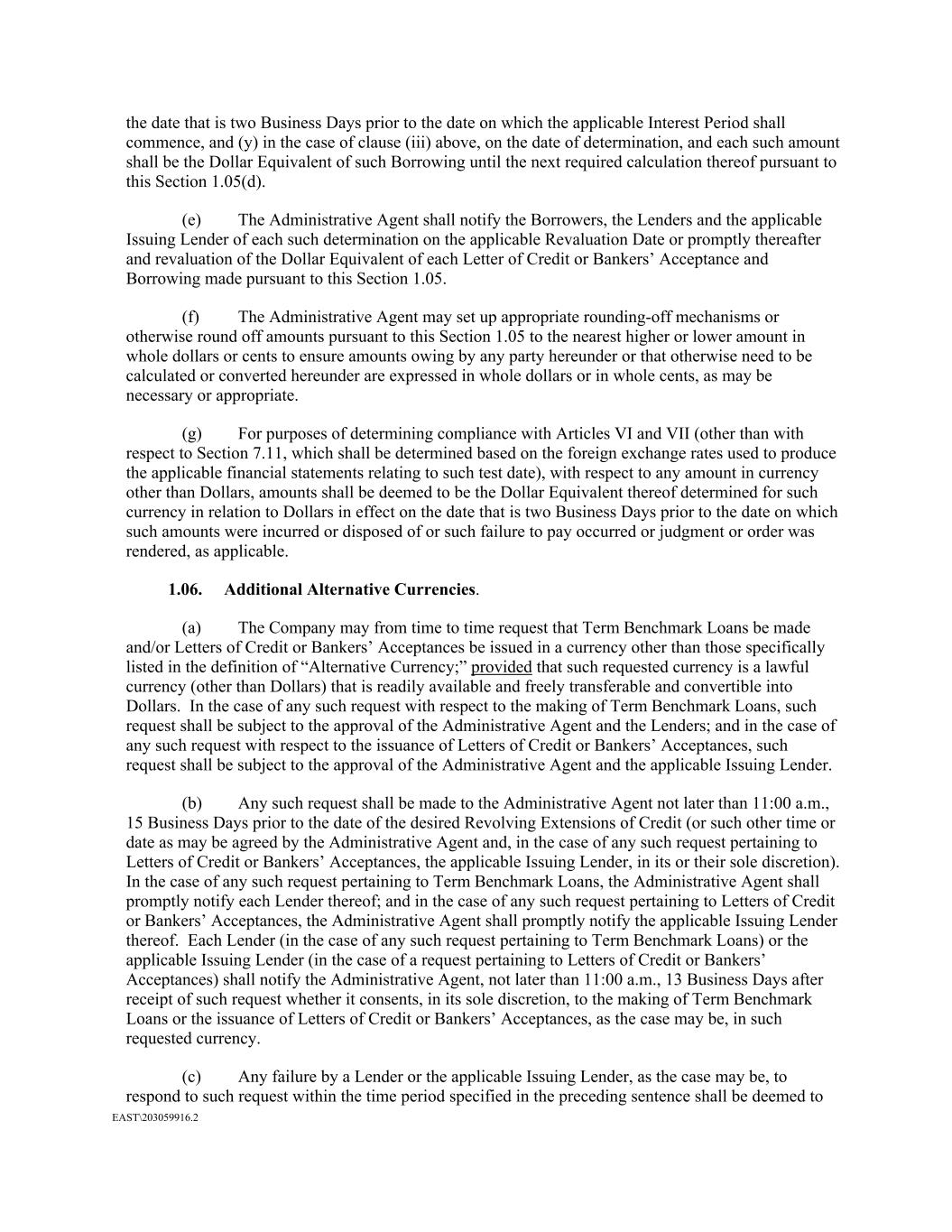 the date that is two Business Days prior to the date on which the applicable Interest Period shall commence, and (y) in the case of clause (iii) above, on the date of determination, and each such amount shall be the Dollar Equivalent of such Borrowing until the next required calculation thereof pursuant to this Section 1.05(d). (e) The Administrative Agent shall notify the Borrowers, the Lenders and the applicable Issuing Lender of each such determination on the applicable Revaluation Date or promptly thereafter and revaluation of the Dollar Equivalent of each Letter of Credit or Bankers’ Acceptance and Borrowing made pursuant to this Section 1.05. (f) The Administrative Agent may set up appropriate rounding-off mechanisms or otherwise round off amounts pursuant to this Section 1.05 to the nearest higher or lower amount in whole dollars or cents to ensure amounts owing by any party hereunder or that otherwise need to be calculated or converted hereunder are expressed in whole dollars or in whole cents, as may be necessary or appropriate. (g) For purposes of determining compliance with Articles VI and VII (other than with respect to Section 7.11, which shall be determined based on the foreign exchange rates used to produce the applicable financial statements relating to such test date), with respect to any amount in currency other than Dollars, amounts shall be deemed to be the Dollar Equivalent thereof determined for such currency in relation to Dollars in effect on the date that is two Business Days prior to the date on which such amounts were incurred or disposed of or such failure to pay occurred or judgment or order was rendered, as applicable. 1.06. Additional Alternative Currencies. (a) The Company may from time to time request that Term Benchmark Loans be made and/or Letters of Credit or Bankers’ Acceptances be issued in a currency other than those specifically listed in the definition of “Alternative Currency;” provided that such requested currency is a lawful currency (other than Dollars) that is readily available and freely transferable and convertible into Dollars. In the case of any such request with respect to the making of Term Benchmark Loans, such request shall be subject to the approval of the Administrative Agent and the Lenders; and in the case of any such request with respect to the issuance of Letters of Credit or Bankers’ Acceptances, such request shall be subject to the approval of the Administrative Agent and the applicable Issuing Lender. (b) Any such request shall be made to the Administrative Agent not later than 11:00 a.m., 15 Business Days prior to the date of the desired Revolving Extensions of Credit (or such other time or date as may be agreed by the Administrative Agent and, in the case of any such request pertaining to Letters of Credit or Bankers’ Acceptances, the applicable Issuing Lender, in its or their sole discretion). In the case of any such request pertaining to Term Benchmark Loans, the Administrative Agent shall promptly notify each Lender thereof; and in the case of any such request pertaining to Letters of Credit or Bankers’ Acceptances, the Administrative Agent shall promptly notify the applicable Issuing Lender thereof. Each Lender (in the case of any such request pertaining to Term Benchmark Loans) or the applicable Issuing Lender (in the case of a request pertaining to Letters of Credit or Bankers’ Acceptances) shall notify the Administrative Agent, not later than 11:00 a.m., 13 Business Days after receipt of such request whether it consents, in its sole discretion, to the making of Term Benchmark Loans or the issuance of Letters of Credit or Bankers’ Acceptances, as the case may be, in such requested currency. (c) Any failure by a Lender or the applicable Issuing Lender, as the case may be, to respond to such request within the time period specified in the preceding sentence shall be deemed to EAST\203059916.2