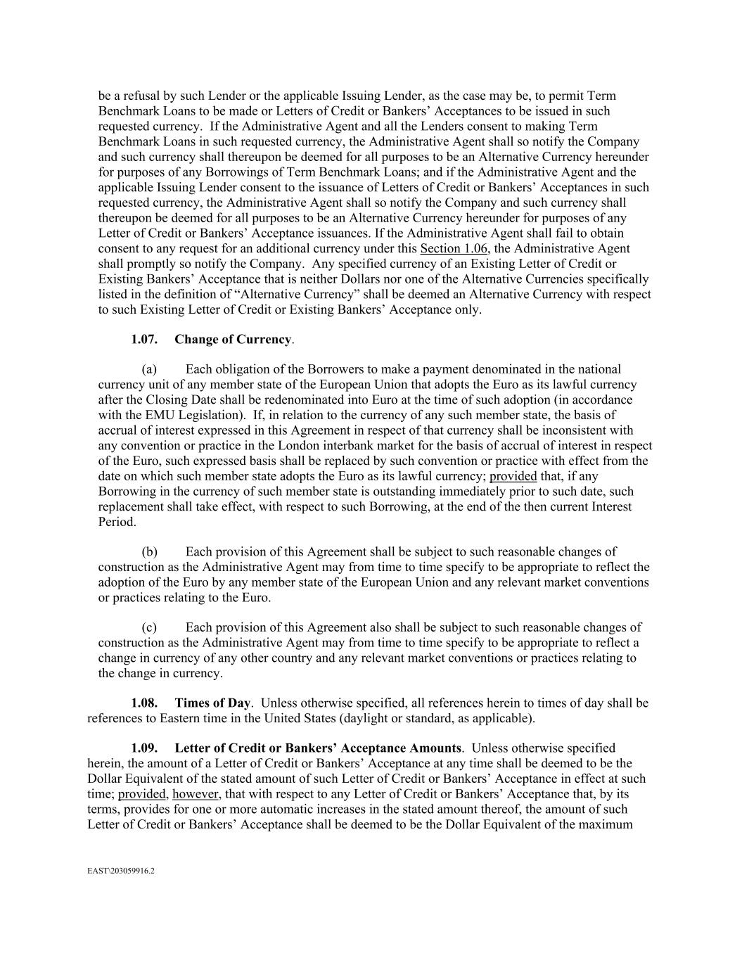 be a refusal by such Lender or the applicable Issuing Lender, as the case may be, to permit Term Benchmark Loans to be made or Letters of Credit or Bankers’ Acceptances to be issued in such requested currency. If the Administrative Agent and all the Lenders consent to making Term Benchmark Loans in such requested currency, the Administrative Agent shall so notify the Company and such currency shall thereupon be deemed for all purposes to be an Alternative Currency hereunder for purposes of any Borrowings of Term Benchmark Loans; and if the Administrative Agent and the applicable Issuing Lender consent to the issuance of Letters of Credit or Bankers’ Acceptances in such requested currency, the Administrative Agent shall so notify the Company and such currency shall thereupon be deemed for all purposes to be an Alternative Currency hereunder for purposes of any Letter of Credit or Bankers’ Acceptance issuances. If the Administrative Agent shall fail to obtain consent to any request for an additional currency under this Section 1.06, the Administrative Agent shall promptly so notify the Company. Any specified currency of an Existing Letter of Credit or Existing Bankers’ Acceptance that is neither Dollars nor one of the Alternative Currencies specifically listed in the definition of “Alternative Currency” shall be deemed an Alternative Currency with respect to such Existing Letter of Credit or Existing Bankers’ Acceptance only. 1.07. Change of Currency. (a) Each obligation of the Borrowers to make a payment denominated in the national currency unit of any member state of the European Union that adopts the Euro as its lawful currency after the Closing Date shall be redenominated into Euro at the time of such adoption (in accordance with the EMU Legislation). If, in relation to the currency of any such member state, the basis of accrual of interest expressed in this Agreement in respect of that currency shall be inconsistent with any convention or practice in the London interbank market for the basis of accrual of interest in respect of the Euro, such expressed basis shall be replaced by such convention or practice with effect from the date on which such member state adopts the Euro as its lawful currency; provided that, if any Borrowing in the currency of such member state is outstanding immediately prior to such date, such replacement shall take effect, with respect to such Borrowing, at the end of the then current Interest Period. (b) Each provision of this Agreement shall be subject to such reasonable changes of construction as the Administrative Agent may from time to time specify to be appropriate to reflect the adoption of the Euro by any member state of the European Union and any relevant market conventions or practices relating to the Euro. (c) Each provision of this Agreement also shall be subject to such reasonable changes of construction as the Administrative Agent may from time to time specify to be appropriate to reflect a change in currency of any other country and any relevant market conventions or practices relating to the change in currency. 1.08. Times of Day. Unless otherwise specified, all references herein to times of day shall be references to Eastern time in the United States (daylight or standard, as applicable). 1.09. Letter of Credit or Bankers’ Acceptance Amounts. Unless otherwise specified herein, the amount of a Letter of Credit or Bankers’ Acceptance at any time shall be deemed to be the Dollar Equivalent of the stated amount of such Letter of Credit or Bankers’ Acceptance in effect at such time; provided, however, that with respect to any Letter of Credit or Bankers’ Acceptance that, by its terms, provides for one or more automatic increases in the stated amount thereof, the amount of such Letter of Credit or Bankers’ Acceptance shall be deemed to be the Dollar Equivalent of the maximum EAST\203059916.2