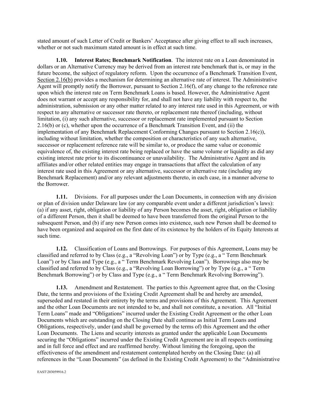 stated amount of such Letter of Credit or Bankers’ Acceptance after giving effect to all such increases, whether or not such maximum stated amount is in effect at such time. 1.10. Interest Rates; Benchmark Notification. The interest rate on a Loan denominated in dollars or an Alternative Currency may be derived from an interest rate benchmark that is, or may in the future become, the subject of regulatory reform. Upon the occurrence of a Benchmark Transition Event, Section 2.16(b) provides a mechanism for determining an alternative rate of interest. The Administrative Agent will promptly notify the Borrower, pursuant to Section 2.16(f), of any change to the reference rate upon which the interest rate on Term Benchmark Loans is based. However, the Administrative Agent does not warrant or accept any responsibility for, and shall not have any liability with respect to, the administration, submission or any other matter related to any interest rate used in this Agreement, or with respect to any alternative or successor rate thereto, or replacement rate thereof (including, without limitation, (i) any such alternative, successor or replacement rate implemented pursuant to Section 2.16(b) or (c), whether upon the occurrence of a Benchmark Transition Event, and (ii) the implementation of any Benchmark Replacement Conforming Changes pursuant to Section 2.16(c)), including without limitation, whether the composition or characteristics of any such alternative, successor or replacement reference rate will be similar to, or produce the same value or economic equivalence of, the existing interest rate being replaced or have the same volume or liquidity as did any existing interest rate prior to its discontinuance or unavailability. The Administrative Agent and its affiliates and/or other related entities may engage in transactions that affect the calculation of any interest rate used in this Agreement or any alternative, successor or alternative rate (including any Benchmark Replacement) and/or any relevant adjustments thereto, in each case, in a manner adverse to the Borrower. 1.11. Divisions. For all purposes under the Loan Documents, in connection with any division or plan of division under Delaware law (or any comparable event under a different jurisdiction’s laws): (a) if any asset, right, obligation or liability of any Person becomes the asset, right, obligation or liability of a different Person, then it shall be deemed to have been transferred from the original Person to the subsequent Person, and (b) if any new Person comes into existence, such new Person shall be deemed to have been organized and acquired on the first date of its existence by the holders of its Equity Interests at such time. 1.12. Classification of Loans and Borrowings. For purposes of this Agreement, Loans may be classified and referred to by Class (e.g., a “Revolving Loan”) or by Type (e.g., a “ Term Benchmark Loan”) or by Class and Type (e.g., a “ Term Benchmark Revolving Loan”). Borrowings also may be classified and referred to by Class (e.g., a “Revolving Loan Borrowing”) or by Type (e.g., a “ Term Benchmark Borrowing”) or by Class and Type (e.g., a “ Term Benchmark Revolving Borrowing”). 1.13. Amendment and Restatement. The parties to this Agreement agree that, on the Closing Date, the terms and provisions of the Existing Credit Agreement shall be and hereby are amended, superseded and restated in their entirety by the terms and provisions of this Agreement. This Agreement and the other Loan Documents are not intended to be, and shall not constitute, a novation. All “Initial Term Loans” made and “Obligations” incurred under the Existing Credit Agreement or the other Loan Documents which are outstanding on the Closing Date shall continue as Initial Term Loans and Obligations, respectively, under (and shall be governed by the terms of) this Agreement and the other Loan Documents. The Liens and security interests as granted under the applicable Loan Documents securing the “Obligations” incurred under the Existing Credit Agreement are in all respects continuing and in full force and effect and are reaffirmed hereby. Without limiting the foregoing, upon the effectiveness of the amendment and restatement contemplated hereby on the Closing Date: (a) all references in the “Loan Documents” (as defined in the Existing Credit Agreement) to the “Administrative EAST\203059916.2