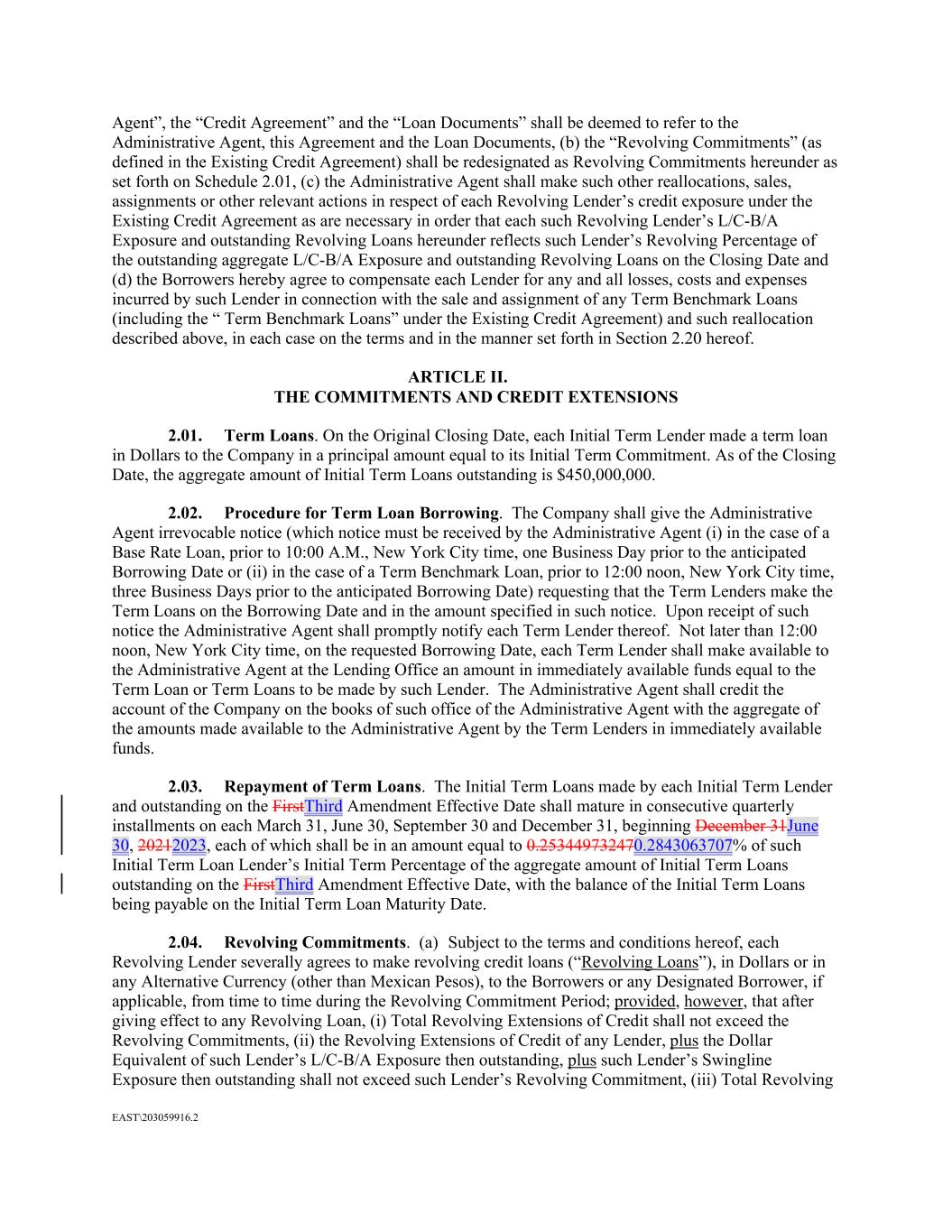 Agent”, the “Credit Agreement” and the “Loan Documents” shall be deemed to refer to the Administrative Agent, this Agreement and the Loan Documents, (b) the “Revolving Commitments” (as defined in the Existing Credit Agreement) shall be redesignated as Revolving Commitments hereunder as set forth on Schedule 2.01, (c) the Administrative Agent shall make such other reallocations, sales, assignments or other relevant actions in respect of each Revolving Lender’s credit exposure under the Existing Credit Agreement as are necessary in order that each such Revolving Lender’s L/C-B/A Exposure and outstanding Revolving Loans hereunder reflects such Lender’s Revolving Percentage of the outstanding aggregate L/C-B/A Exposure and outstanding Revolving Loans on the Closing Date and (d) the Borrowers hereby agree to compensate each Lender for any and all losses, costs and expenses incurred by such Lender in connection with the sale and assignment of any Term Benchmark Loans (including the “ Term Benchmark Loans” under the Existing Credit Agreement) and such reallocation described above, in each case on the terms and in the manner set forth in Section 2.20 hereof. ARTICLE II. THE COMMITMENTS AND CREDIT EXTENSIONS 2.01. Term Loans. On the Original Closing Date, each Initial Term Lender made a term loan in Dollars to the Company in a principal amount equal to its Initial Term Commitment. As of the Closing Date, the aggregate amount of Initial Term Loans outstanding is $450,000,000. 2.02. Procedure for Term Loan Borrowing. The Company shall give the Administrative Agent irrevocable notice (which notice must be received by the Administrative Agent (i) in the case of a Base Rate Loan, prior to 10:00 A.M., New York City time, one Business Day prior to the anticipated Borrowing Date or (ii) in the case of a Term Benchmark Loan, prior to 12:00 noon, New York City time, three Business Days prior to the anticipated Borrowing Date) requesting that the Term Lenders make the Term Loans on the Borrowing Date and in the amount specified in such notice. Upon receipt of such notice the Administrative Agent shall promptly notify each Term Lender thereof. Not later than 12:00 noon, New York City time, on the requested Borrowing Date, each Term Lender shall make available to the Administrative Agent at the Lending Office an amount in immediately available funds equal to the Term Loan or Term Loans to be made by such Lender. The Administrative Agent shall credit the account of the Company on the books of such office of the Administrative Agent with the aggregate of the amounts made available to the Administrative Agent by the Term Lenders in immediately available funds. 2.03. Repayment of Term Loans. The Initial Term Loans made by each Initial Term Lender and outstanding on the FirstThird Amendment Effective Date shall mature in consecutive quarterly installments on each March 31, June 30, September 30 and December 31, beginning December 31June 30, 20212023, each of which shall be in an amount equal to 0.253449732470.2843063707% of such Initial Term Loan Lender’s Initial Term Percentage of the aggregate amount of Initial Term Loans outstanding on the FirstThird Amendment Effective Date, with the balance of the Initial Term Loans being payable on the Initial Term Loan Maturity Date. 2.04. Revolving Commitments. (a) Subject to the terms and conditions hereof, each Revolving Lender severally agrees to make revolving credit loans (“Revolving Loans”), in Dollars or in any Alternative Currency (other than Mexican Pesos), to the Borrowers or any Designated Borrower, if applicable, from time to time during the Revolving Commitment Period; provided, however, that after giving effect to any Revolving Loan, (i) Total Revolving Extensions of Credit shall not exceed the Revolving Commitments, (ii) the Revolving Extensions of Credit of any Lender, plus the Dollar Equivalent of such Lender’s L/C-B/A Exposure then outstanding, plus such Lender’s Swingline Exposure then outstanding shall not exceed such Lender’s Revolving Commitment, (iii) Total Revolving EAST\203059916.2