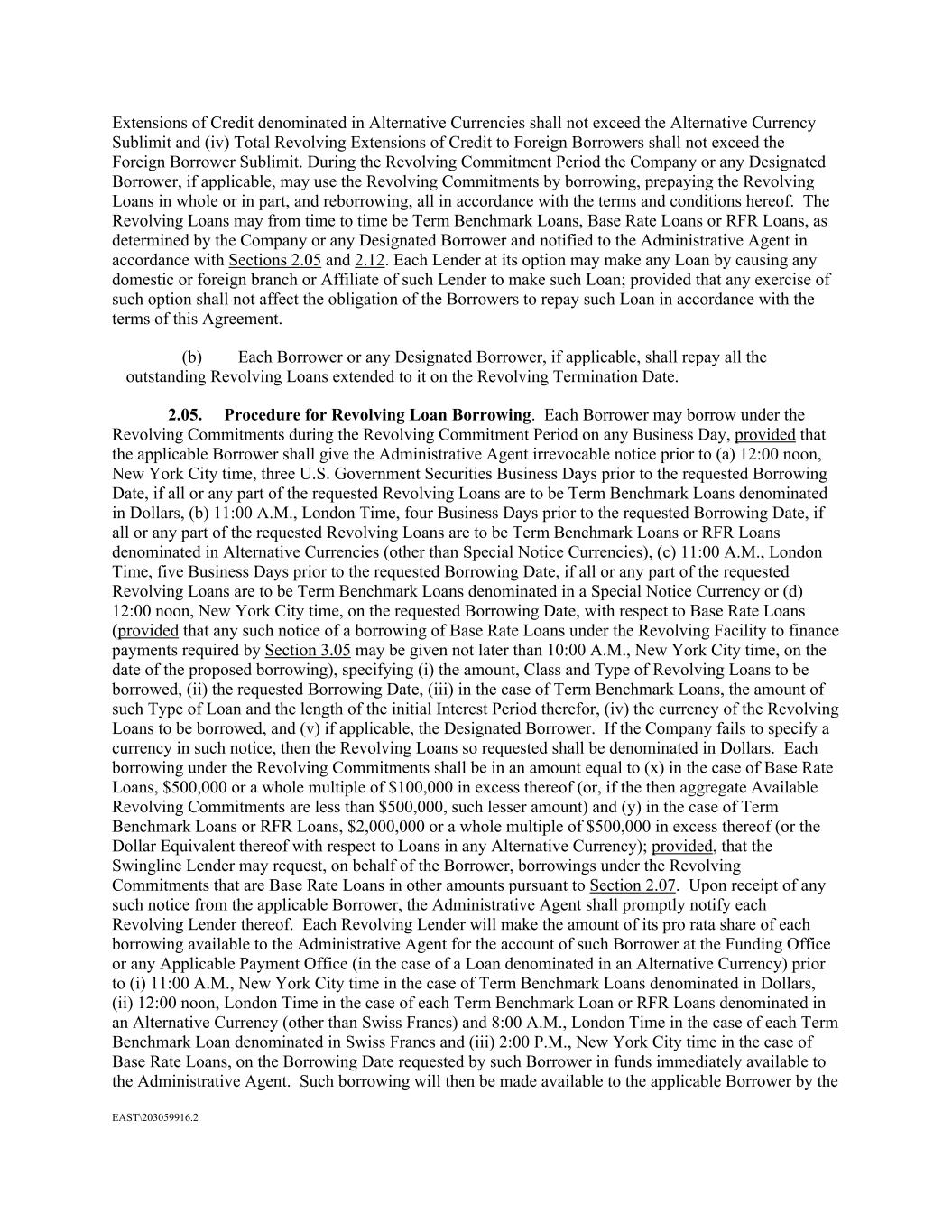 Extensions of Credit denominated in Alternative Currencies shall not exceed the Alternative Currency Sublimit and (iv) Total Revolving Extensions of Credit to Foreign Borrowers shall not exceed the Foreign Borrower Sublimit. During the Revolving Commitment Period the Company or any Designated Borrower, if applicable, may use the Revolving Commitments by borrowing, prepaying the Revolving Loans in whole or in part, and reborrowing, all in accordance with the terms and conditions hereof. The Revolving Loans may from time to time be Term Benchmark Loans, Base Rate Loans or RFR Loans, as determined by the Company or any Designated Borrower and notified to the Administrative Agent in accordance with Sections 2.05 and 2.12. Each Lender at its option may make any Loan by causing any domestic or foreign branch or Affiliate of such Lender to make such Loan; provided that any exercise of such option shall not affect the obligation of the Borrowers to repay such Loan in accordance with the terms of this Agreement. (b) Each Borrower or any Designated Borrower, if applicable, shall repay all the outstanding Revolving Loans extended to it on the Revolving Termination Date. 2.05. Procedure for Revolving Loan Borrowing. Each Borrower may borrow under the Revolving Commitments during the Revolving Commitment Period on any Business Day, provided that the applicable Borrower shall give the Administrative Agent irrevocable notice prior to (a) 12:00 noon, New York City time, three U.S. Government Securities Business Days prior to the requested Borrowing Date, if all or any part of the requested Revolving Loans are to be Term Benchmark Loans denominated in Dollars, (b) 11:00 A.M., London Time, four Business Days prior to the requested Borrowing Date, if all or any part of the requested Revolving Loans are to be Term Benchmark Loans or RFR Loans denominated in Alternative Currencies (other than Special Notice Currencies), (c) 11:00 A.M., London Time, five Business Days prior to the requested Borrowing Date, if all or any part of the requested Revolving Loans are to be Term Benchmark Loans denominated in a Special Notice Currency or (d) 12:00 noon, New York City time, on the requested Borrowing Date, with respect to Base Rate Loans (provided that any such notice of a borrowing of Base Rate Loans under the Revolving Facility to finance payments required by Section 3.05 may be given not later than 10:00 A.M., New York City time, on the date of the proposed borrowing), specifying (i) the amount, Class and Type of Revolving Loans to be borrowed, (ii) the requested Borrowing Date, (iii) in the case of Term Benchmark Loans, the amount of such Type of Loan and the length of the initial Interest Period therefor, (iv) the currency of the Revolving Loans to be borrowed, and (v) if applicable, the Designated Borrower. If the Company fails to specify a currency in such notice, then the Revolving Loans so requested shall be denominated in Dollars. Each borrowing under the Revolving Commitments shall be in an amount equal to (x) in the case of Base Rate Loans, $500,000 or a whole multiple of $100,000 in excess thereof (or, if the then aggregate Available Revolving Commitments are less than $500,000, such lesser amount) and (y) in the case of Term Benchmark Loans or RFR Loans, $2,000,000 or a whole multiple of $500,000 in excess thereof (or the Dollar Equivalent thereof with respect to Loans in any Alternative Currency); provided, that the Swingline Lender may request, on behalf of the Borrower, borrowings under the Revolving Commitments that are Base Rate Loans in other amounts pursuant to Section 2.07. Upon receipt of any such notice from the applicable Borrower, the Administrative Agent shall promptly notify each Revolving Lender thereof. Each Revolving Lender will make the amount of its pro rata share of each borrowing available to the Administrative Agent for the account of such Borrower at the Funding Office or any Applicable Payment Office (in the case of a Loan denominated in an Alternative Currency) prior to (i) 11:00 A.M., New York City time in the case of Term Benchmark Loans denominated in Dollars, (ii) 12:00 noon, London Time in the case of each Term Benchmark Loan or RFR Loans denominated in an Alternative Currency (other than Swiss Francs) and 8:00 A.M., London Time in the case of each Term Benchmark Loan denominated in Swiss Francs and (iii) 2:00 P.M., New York City time in the case of Base Rate Loans, on the Borrowing Date requested by such Borrower in funds immediately available to the Administrative Agent. Such borrowing will then be made available to the applicable Borrower by the EAST\203059916.2