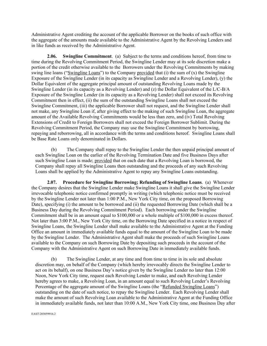 Administrative Agent crediting the account of the applicable Borrower on the books of such office with the aggregate of the amounts made available to the Administrative Agent by the Revolving Lenders and in like funds as received by the Administrative Agent. 2.06. Swingline Commitment. (a) Subject to the terms and conditions hereof, from time to time during the Revolving Commitment Period, the Swingline Lender may at its sole discretion make a portion of the credit otherwise available to the Borrowers under the Revolving Commitments by making swing line loans (“Swingline Loans”) to the Company provided that (i) the sum of (x) the Swingline Exposure of the Swingline Lender (in its capacity as Swingline Lender and a Revolving Lender), (y) the Dollar Equivalent of the aggregate principal amount of outstanding Revolving Loans made by the Swingline Lender (in its capacity as a Revolving Lender) and (z) the Dollar Equivalent of the L/C-B/A Exposure of the Swingline Lender (in its capacity as a Revolving Lender) shall not exceed its Revolving Commitment then in effect, (ii) the sum of the outstanding Swingline Loans shall not exceed the Swingline Commitment, (iii) the applicable Borrower shall not request, and the Swingline Lender shall not make, any Swingline Loan if, after giving effect to the making of such Swingline Loan, the aggregate amount of the Available Revolving Commitments would be less than zero, and (iv) Total Revolving Extensions of Credit to Foreign Borrowers shall not exceed the Foreign Borrower Sublimit. During the Revolving Commitment Period, the Company may use the Swingline Commitment by borrowing, repaying and reborrowing, all in accordance with the terms and conditions hereof. Swingline Loans shall be Base Rate Loans only denominated in Dollars. (b) The Company shall repay to the Swingline Lender the then unpaid principal amount of each Swingline Loan on the earlier of the Revolving Termination Date and five Business Days after such Swingline Loan is made; provided that on each date that a Revolving Loan is borrowed, the Company shall repay all Swingline Loans then outstanding and the proceeds of any such Revolving Loans shall be applied by the Administrative Agent to repay any Swingline Loans outstanding. 2.07. Procedure for Swingline Borrowing; Refunding of Swingline Loans. (a) Whenever the Company desires that the Swingline Lender make Swingline Loans it shall give the Swingline Lender irrevocable telephonic notice confirmed promptly in writing (which telephonic notice must be received by the Swingline Lender not later than 1:00 P.M., New York City time, on the proposed Borrowing Date), specifying (i) the amount to be borrowed and (ii) the requested Borrowing Date (which shall be a Business Day during the Revolving Commitment Period). Each borrowing under the Swingline Commitment shall be in an amount equal to $100,000 or a whole multiple of $100,000 in excess thereof. Not later than 3:00 P.M., New York City time, on the Borrowing Date specified in a notice in respect of Swingline Loans, the Swingline Lender shall make available to the Administrative Agent at the Funding Office an amount in immediately available funds equal to the amount of the Swingline Loan to be made by the Swingline Lender. The Administrative Agent shall make the proceeds of such Swingline Loans available to the Company on such Borrowing Date by depositing such proceeds in the account of the Company with the Administrative Agent on such Borrowing Date in immediately available funds. (b) The Swingline Lender, at any time and from time to time in its sole and absolute discretion may, on behalf of the Company (which hereby irrevocably directs the Swingline Lender to act on its behalf), on one Business Day’s notice given by the Swingline Lender no later than 12:00 Noon, New York City time, request each Revolving Lender to make, and each Revolving Lender hereby agrees to make, a Revolving Loan, in an amount equal to such Revolving Lender’s Revolving Percentage of the aggregate amount of the Swingline Loans (the “Refunded Swingline Loans”) outstanding on the date of such notice, to repay the Swingline Lender. Each Revolving Lender shall make the amount of such Revolving Loan available to the Administrative Agent at the Funding Office in immediately available funds, not later than 10:00 A.M., New York City time, one Business Day after EAST\203059916.2
