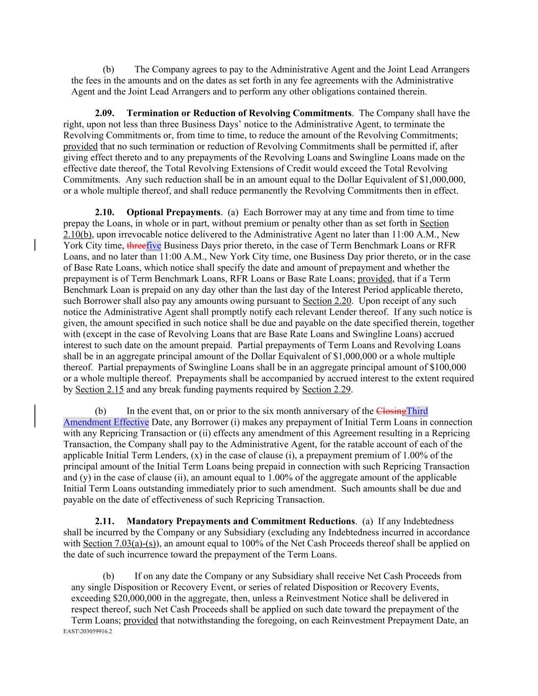 (b) The Company agrees to pay to the Administrative Agent and the Joint Lead Arrangers the fees in the amounts and on the dates as set forth in any fee agreements with the Administrative Agent and the Joint Lead Arrangers and to perform any other obligations contained therein. 2.09. Termination or Reduction of Revolving Commitments. The Company shall have the right, upon not less than three Business Days’ notice to the Administrative Agent, to terminate the Revolving Commitments or, from time to time, to reduce the amount of the Revolving Commitments; provided that no such termination or reduction of Revolving Commitments shall be permitted if, after giving effect thereto and to any prepayments of the Revolving Loans and Swingline Loans made on the effective date thereof, the Total Revolving Extensions of Credit would exceed the Total Revolving Commitments. Any such reduction shall be in an amount equal to the Dollar Equivalent of $1,000,000, or a whole multiple thereof, and shall reduce permanently the Revolving Commitments then in effect. 2.10. Optional Prepayments. (a) Each Borrower may at any time and from time to time prepay the Loans, in whole or in part, without premium or penalty other than as set forth in Section 2.10(b), upon irrevocable notice delivered to the Administrative Agent no later than 11:00 A.M., New York City time, threefive Business Days prior thereto, in the case of Term Benchmark Loans or RFR Loans, and no later than 11:00 A.M., New York City time, one Business Day prior thereto, or in the case of Base Rate Loans, which notice shall specify the date and amount of prepayment and whether the prepayment is of Term Benchmark Loans, RFR Loans or Base Rate Loans; provided, that if a Term Benchmark Loan is prepaid on any day other than the last day of the Interest Period applicable thereto, such Borrower shall also pay any amounts owing pursuant to Section 2.20. Upon receipt of any such notice the Administrative Agent shall promptly notify each relevant Lender thereof. If any such notice is given, the amount specified in such notice shall be due and payable on the date specified therein, together with (except in the case of Revolving Loans that are Base Rate Loans and Swingline Loans) accrued interest to such date on the amount prepaid. Partial prepayments of Term Loans and Revolving Loans shall be in an aggregate principal amount of the Dollar Equivalent of $1,000,000 or a whole multiple thereof. Partial prepayments of Swingline Loans shall be in an aggregate principal amount of $100,000 or a whole multiple thereof. Prepayments shall be accompanied by accrued interest to the extent required by Section 2.15 and any break funding payments required by Section 2.29. (b) In the event that, on or prior to the six month anniversary of the ClosingThird Amendment Effective Date, any Borrower (i) makes any prepayment of Initial Term Loans in connection with any Repricing Transaction or (ii) effects any amendment of this Agreement resulting in a Repricing Transaction, the Company shall pay to the Administrative Agent, for the ratable account of each of the applicable Initial Term Lenders, (x) in the case of clause (i), a prepayment premium of 1.00% of the principal amount of the Initial Term Loans being prepaid in connection with such Repricing Transaction and (y) in the case of clause (ii), an amount equal to 1.00% of the aggregate amount of the applicable Initial Term Loans outstanding immediately prior to such amendment. Such amounts shall be due and payable on the date of effectiveness of such Repricing Transaction. 2.11. Mandatory Prepayments and Commitment Reductions. (a) If any Indebtedness shall be incurred by the Company or any Subsidiary (excluding any Indebtedness incurred in accordance with Section 7.03(a)-(s)), an amount equal to 100% of the Net Cash Proceeds thereof shall be applied on the date of such incurrence toward the prepayment of the Term Loans. (b) If on any date the Company or any Subsidiary shall receive Net Cash Proceeds from any single Disposition or Recovery Event, or series of related Disposition or Recovery Events, exceeding $20,000,000 in the aggregate, then, unless a Reinvestment Notice shall be delivered in respect thereof, such Net Cash Proceeds shall be applied on such date toward the prepayment of the Term Loans; provided that notwithstanding the foregoing, on each Reinvestment Prepayment Date, an EAST\203059916.2