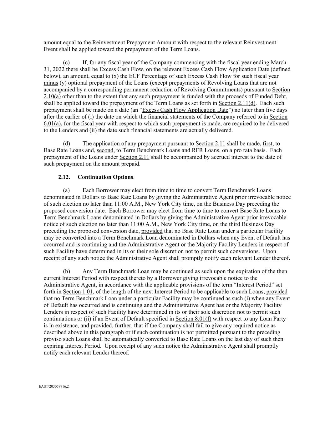 amount equal to the Reinvestment Prepayment Amount with respect to the relevant Reinvestment Event shall be applied toward the prepayment of the Term Loans. (c) If, for any fiscal year of the Company commencing with the fiscal year ending March 31, 2022 there shall be Excess Cash Flow, on the relevant Excess Cash Flow Application Date (defined below), an amount, equal to (x) the ECF Percentage of such Excess Cash Flow for such fiscal year minus (y) optional prepayment of the Loans (except prepayments of Revolving Loans that are not accompanied by a corresponding permanent reduction of Revolving Commitments) pursuant to Section 2.10(a) other than to the extent that any such prepayment is funded with the proceeds of Funded Debt, shall be applied toward the prepayment of the Term Loans as set forth in Section 2.11(d). Each such prepayment shall be made on a date (an “Excess Cash Flow Application Date”) no later than five days after the earlier of (i) the date on which the financial statements of the Company referred to in Section 6.01(a), for the fiscal year with respect to which such prepayment is made, are required to be delivered to the Lenders and (ii) the date such financial statements are actually delivered. (d) The application of any prepayment pursuant to Section 2.11 shall be made, first, to Base Rate Loans and, second, to Term Benchmark Loans and RFR Loans, on a pro rata basis. Each prepayment of the Loans under Section 2.11 shall be accompanied by accrued interest to the date of such prepayment on the amount prepaid. 2.12. Continuation Options. (a) Each Borrower may elect from time to time to convert Term Benchmark Loans denominated in Dollars to Base Rate Loans by giving the Administrative Agent prior irrevocable notice of such election no later than 11:00 A.M., New York City time, on the Business Day preceding the proposed conversion date. Each Borrower may elect from time to time to convert Base Rate Loans to Term Benchmark Loans denominated in Dollars by giving the Administrative Agent prior irrevocable notice of such election no later than 11:00 A.M., New York City time, on the third Business Day preceding the proposed conversion date, provided that no Base Rate Loan under a particular Facility may be converted into a Term Benchmark Loan denominated in Dollars when any Event of Default has occurred and is continuing and the Administrative Agent or the Majority Facility Lenders in respect of such Facility have determined in its or their sole discretion not to permit such conversions. Upon receipt of any such notice the Administrative Agent shall promptly notify each relevant Lender thereof. (b) Any Term Benchmark Loan may be continued as such upon the expiration of the then current Interest Period with respect thereto by a Borrower giving irrevocable notice to the Administrative Agent, in accordance with the applicable provisions of the term “Interest Period” set forth in Section 1.01, of the length of the next Interest Period to be applicable to such Loans, provided that no Term Benchmark Loan under a particular Facility may be continued as such (i) when any Event of Default has occurred and is continuing and the Administrative Agent has or the Majority Facility Lenders in respect of such Facility have determined in its or their sole discretion not to permit such continuations or (ii) if an Event of Default specified in Section 8.01(f) with respect to any Loan Party is in existence, and provided, further, that if the Company shall fail to give any required notice as described above in this paragraph or if such continuation is not permitted pursuant to the preceding proviso such Loans shall be automatically converted to Base Rate Loans on the last day of such then expiring Interest Period. Upon receipt of any such notice the Administrative Agent shall promptly notify each relevant Lender thereof. EAST\203059916.2