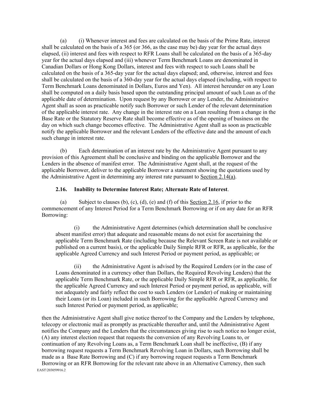 (a) (i) Whenever interest and fees are calculated on the basis of the Prime Rate, interest shall be calculated on the basis of a 365 (or 366, as the case may be) day year for the actual days elapsed, (ii) interest and fees with respect to RFR Loans shall be calculated on the basis of a 365-day year for the actual days elapsed and (iii) whenever Term Benchmark Loans are denominated in Canadian Dollars or Hong Kong Dollars, interest and fees with respect to such Loans shall be calculated on the basis of a 365-day year for the actual days elapsed; and, otherwise, interest and fees shall be calculated on the basis of a 360-day year for the actual days elapsed (including, with respect to Term Benchmark Loans denominated in Dollars, Euros and Yen). All interest hereunder on any Loan shall be computed on a daily basis based upon the outstanding principal amount of such Loan as of the applicable date of determination. Upon request by any Borrower or any Lender, the Administrative Agent shall as soon as practicable notify such Borrower or such Lender of the relevant determination of the applicable interest rate. Any change in the interest rate on a Loan resulting from a change in the Base Rate or the Statutory Reserve Rate shall become effective as of the opening of business on the day on which such change becomes effective. The Administrative Agent shall as soon as practicable notify the applicable Borrower and the relevant Lenders of the effective date and the amount of each such change in interest rate. (b) Each determination of an interest rate by the Administrative Agent pursuant to any provision of this Agreement shall be conclusive and binding on the applicable Borrower and the Lenders in the absence of manifest error. The Administrative Agent shall, at the request of the applicable Borrower, deliver to the applicable Borrower a statement showing the quotations used by the Administrative Agent in determining any interest rate pursuant to Section 2.14(a). 2.16. Inability to Determine Interest Rate; Alternate Rate of Interest. (a) Subject to clauses (b), (c), (d), (e) and (f) of this Section 2.16, if prior to the commencement of any Interest Period for a Term Benchmark Borrowing or if on any date for an RFR Borrowing: (i) the Administrative Agent determines (which determination shall be conclusive absent manifest error) that adequate and reasonable means do not exist for ascertaining the applicable Term Benchmark Rate (including because the Relevant Screen Rate is not available or published on a current basis), or the applicable Daily Simple RFR or RFR, as applicable, for the applicable Agreed Currency and such Interest Period or payment period, as applicable; or (ii) the Administrative Agent is advised by the Required Lenders (or in the case of Loans denominated in a currency other than Dollars, the Required Revolving Lenders) that the applicable Term Benchmark Rate, or the applicable Daily Simple RFR or RFR, as applicable, for the applicable Agreed Currency and such Interest Period or payment period, as applicable, will not adequately and fairly reflect the cost to such Lenders (or Lender) of making or maintaining their Loans (or its Loan) included in such Borrowing for the applicable Agreed Currency and such Interest Period or payment period, as applicable; then the Administrative Agent shall give notice thereof to the Company and the Lenders by telephone, telecopy or electronic mail as promptly as practicable thereafter and, until the Administrative Agent notifies the Company and the Lenders that the circumstances giving rise to such notice no longer exist, (A) any interest election request that requests the conversion of any Revolving Loans to, or continuation of any Revolving Loans as, a Term Benchmark Loan shall be ineffective, (B) if any borrowing request requests a Term Benchmark Revolving Loan in Dollars, such Borrowing shall be made as a Base Rate Borrowing and (C) if any borrowing request requests a Term Benchmark Borrowing or an RFR Borrowing for the relevant rate above in an Alternative Currency, then such EAST\203059916.2