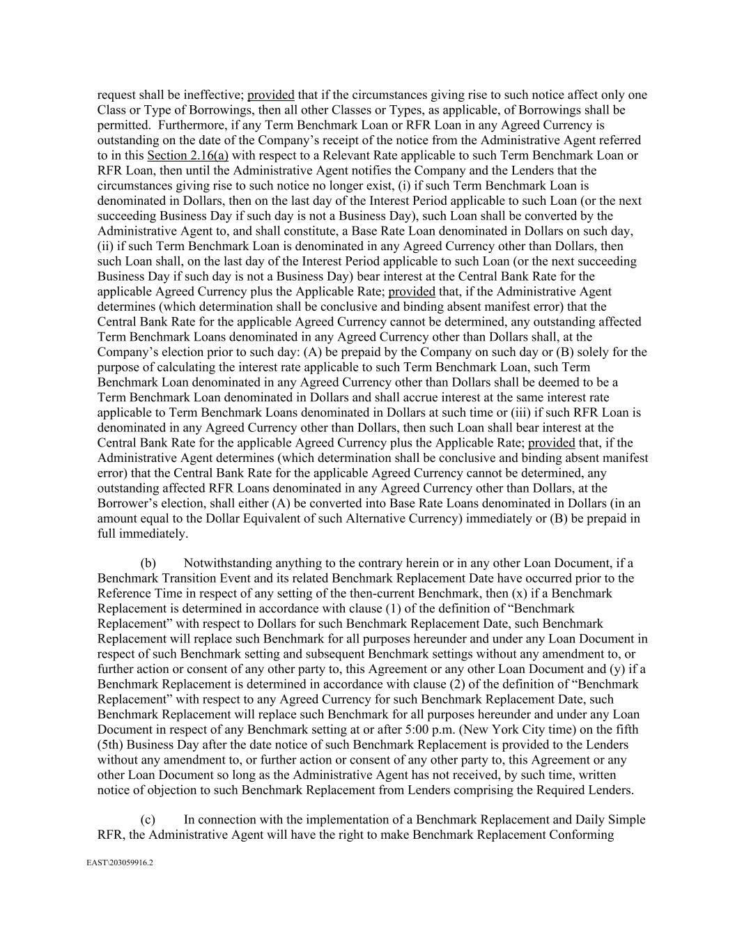 request shall be ineffective; provided that if the circumstances giving rise to such notice affect only one Class or Type of Borrowings, then all other Classes or Types, as applicable, of Borrowings shall be permitted. Furthermore, if any Term Benchmark Loan or RFR Loan in any Agreed Currency is outstanding on the date of the Company’s receipt of the notice from the Administrative Agent referred to in this Section 2.16(a) with respect to a Relevant Rate applicable to such Term Benchmark Loan or RFR Loan, then until the Administrative Agent notifies the Company and the Lenders that the circumstances giving rise to such notice no longer exist, (i) if such Term Benchmark Loan is denominated in Dollars, then on the last day of the Interest Period applicable to such Loan (or the next succeeding Business Day if such day is not a Business Day), such Loan shall be converted by the Administrative Agent to, and shall constitute, a Base Rate Loan denominated in Dollars on such day, (ii) if such Term Benchmark Loan is denominated in any Agreed Currency other than Dollars, then such Loan shall, on the last day of the Interest Period applicable to such Loan (or the next succeeding Business Day if such day is not a Business Day) bear interest at the Central Bank Rate for the applicable Agreed Currency plus the Applicable Rate; provided that, if the Administrative Agent determines (which determination shall be conclusive and binding absent manifest error) that the Central Bank Rate for the applicable Agreed Currency cannot be determined, any outstanding affected Term Benchmark Loans denominated in any Agreed Currency other than Dollars shall, at the Company’s election prior to such day: (A) be prepaid by the Company on such day or (B) solely for the purpose of calculating the interest rate applicable to such Term Benchmark Loan, such Term Benchmark Loan denominated in any Agreed Currency other than Dollars shall be deemed to be a Term Benchmark Loan denominated in Dollars and shall accrue interest at the same interest rate applicable to Term Benchmark Loans denominated in Dollars at such time or (iii) if such RFR Loan is denominated in any Agreed Currency other than Dollars, then such Loan shall bear interest at the Central Bank Rate for the applicable Agreed Currency plus the Applicable Rate; provided that, if the Administrative Agent determines (which determination shall be conclusive and binding absent manifest error) that the Central Bank Rate for the applicable Agreed Currency cannot be determined, any outstanding affected RFR Loans denominated in any Agreed Currency other than Dollars, at the Borrower’s election, shall either (A) be converted into Base Rate Loans denominated in Dollars (in an amount equal to the Dollar Equivalent of such Alternative Currency) immediately or (B) be prepaid in full immediately. (b) Notwithstanding anything to the contrary herein or in any other Loan Document, if a Benchmark Transition Event and its related Benchmark Replacement Date have occurred prior to the Reference Time in respect of any setting of the then-current Benchmark, then (x) if a Benchmark Replacement is determined in accordance with clause (1) of the definition of “Benchmark Replacement” with respect to Dollars for such Benchmark Replacement Date, such Benchmark Replacement will replace such Benchmark for all purposes hereunder and under any Loan Document in respect of such Benchmark setting and subsequent Benchmark settings without any amendment to, or further action or consent of any other party to, this Agreement or any other Loan Document and (y) if a Benchmark Replacement is determined in accordance with clause (2) of the definition of “Benchmark Replacement” with respect to any Agreed Currency for such Benchmark Replacement Date, such Benchmark Replacement will replace such Benchmark for all purposes hereunder and under any Loan Document in respect of any Benchmark setting at or after 5:00 p.m. (New York City time) on the fifth (5th) Business Day after the date notice of such Benchmark Replacement is provided to the Lenders without any amendment to, or further action or consent of any other party to, this Agreement or any other Loan Document so long as the Administrative Agent has not received, by such time, written notice of objection to such Benchmark Replacement from Lenders comprising the Required Lenders. (c) In connection with the implementation of a Benchmark Replacement and Daily Simple RFR, the Administrative Agent will have the right to make Benchmark Replacement Conforming EAST\203059916.2