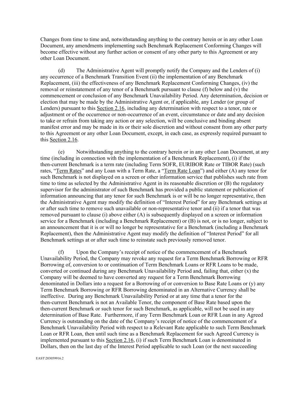 Changes from time to time and, notwithstanding anything to the contrary herein or in any other Loan Document, any amendments implementing such Benchmark Replacement Conforming Changes will become effective without any further action or consent of any other party to this Agreement or any other Loan Document. (d) The Administrative Agent will promptly notify the Company and the Lenders of (i) any occurrence of a Benchmark Transition Event (ii) the implementation of any Benchmark Replacement, (iii) the effectiveness of any Benchmark Replacement Conforming Changes, (iv) the removal or reinstatement of any tenor of a Benchmark pursuant to clause (f) below and (v) the commencement or conclusion of any Benchmark Unavailability Period. Any determination, decision or election that may be made by the Administrative Agent or, if applicable, any Lender (or group of Lenders) pursuant to this Section 2.16, including any determination with respect to a tenor, rate or adjustment or of the occurrence or non-occurrence of an event, circumstance or date and any decision to take or refrain from taking any action or any selection, will be conclusive and binding absent manifest error and may be made in its or their sole discretion and without consent from any other party to this Agreement or any other Loan Document, except, in each case, as expressly required pursuant to this Section 2.16. (e) Notwithstanding anything to the contrary herein or in any other Loan Document, at any time (including in connection with the implementation of a Benchmark Replacement), (i) if the then-current Benchmark is a term rate (including Term SOFR, EURIBOR Rate or TIBOR Rate) (such rates, “Term Rates” and any Loan with a Term Rate, a “Term Rate Loan”) and either (A) any tenor for such Benchmark is not displayed on a screen or other information service that publishes such rate from time to time as selected by the Administrative Agent in its reasonable discretion or (B) the regulatory supervisor for the administrator of such Benchmark has provided a public statement or publication of information announcing that any tenor for such Benchmark is or will be no longer representative, then the Administrative Agent may modify the definition of “Interest Period” for any Benchmark settings at or after such time to remove such unavailable or non-representative tenor and (ii) if a tenor that was removed pursuant to clause (i) above either (A) is subsequently displayed on a screen or information service for a Benchmark (including a Benchmark Replacement) or (B) is not, or is no longer, subject to an announcement that it is or will no longer be representative for a Benchmark (including a Benchmark Replacement), then the Administrative Agent may modify the definition of “Interest Period” for all Benchmark settings at or after such time to reinstate such previously removed tenor. (f) Upon the Company’s receipt of notice of the commencement of a Benchmark Unavailability Period, the Company may revoke any request for a Term Benchmark Borrowing or RFR Borrowing of, conversion to or continuation of Term Benchmark Loans or RFR Loans to be made, converted or continued during any Benchmark Unavailability Period and, failing that, either (x) the Company will be deemed to have converted any request for a Term Benchmark Borrowing denominated in Dollars into a request for a Borrowing of or conversion to Base Rate Loans or (y) any Term Benchmark Borrowing or RFR Borrowing denominated in an Alternative Currency shall be ineffective. During any Benchmark Unavailability Period or at any time that a tenor for the then-current Benchmark is not an Available Tenor, the component of Base Rate based upon the then-current Benchmark or such tenor for such Benchmark, as applicable, will not be used in any determination of Base Rate. Furthermore, if any Term Benchmark Loan or RFR Loan in any Agreed Currency is outstanding on the date of the Company’s receipt of notice of the commencement of a Benchmark Unavailability Period with respect to a Relevant Rate applicable to such Term Benchmark Loan or RFR Loan, then until such time as a Benchmark Replacement for such Agreed Currency is implemented pursuant to this Section 2.16, (i) if such Term Benchmark Loan is denominated in Dollars, then on the last day of the Interest Period applicable to such Loan (or the next succeeding EAST\203059916.2