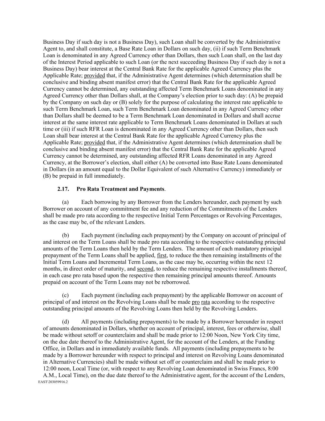 Business Day if such day is not a Business Day), such Loan shall be converted by the Administrative Agent to, and shall constitute, a Base Rate Loan in Dollars on such day, (ii) if such Term Benchmark Loan is denominated in any Agreed Currency other than Dollars, then such Loan shall, on the last day of the Interest Period applicable to such Loan (or the next succeeding Business Day if such day is not a Business Day) bear interest at the Central Bank Rate for the applicable Agreed Currency plus the Applicable Rate; provided that, if the Administrative Agent determines (which determination shall be conclusive and binding absent manifest error) that the Central Bank Rate for the applicable Agreed Currency cannot be determined, any outstanding affected Term Benchmark Loans denominated in any Agreed Currency other than Dollars shall, at the Company’s election prior to such day: (A) be prepaid by the Company on such day or (B) solely for the purpose of calculating the interest rate applicable to such Term Benchmark Loan, such Term Benchmark Loan denominated in any Agreed Currency other than Dollars shall be deemed to be a Term Benchmark Loan denominated in Dollars and shall accrue interest at the same interest rate applicable to Term Benchmark Loans denominated in Dollars at such time or (iii) if such RFR Loan is denominated in any Agreed Currency other than Dollars, then such Loan shall bear interest at the Central Bank Rate for the applicable Agreed Currency plus the Applicable Rate; provided that, if the Administrative Agent determines (which determination shall be conclusive and binding absent manifest error) that the Central Bank Rate for the applicable Agreed Currency cannot be determined, any outstanding affected RFR Loans denominated in any Agreed Currency, at the Borrower’s election, shall either (A) be converted into Base Rate Loans denominated in Dollars (in an amount equal to the Dollar Equivalent of such Alternative Currency) immediately or (B) be prepaid in full immediately. 2.17. Pro Rata Treatment and Payments. (a) Each borrowing by any Borrower from the Lenders hereunder, each payment by such Borrower on account of any commitment fee and any reduction of the Commitments of the Lenders shall be made pro rata according to the respective Initial Term Percentages or Revolving Percentages, as the case may be, of the relevant Lenders. (b) Each payment (including each prepayment) by the Company on account of principal of and interest on the Term Loans shall be made pro rata according to the respective outstanding principal amounts of the Term Loans then held by the Term Lenders. The amount of each mandatory principal prepayment of the Term Loans shall be applied, first, to reduce the then remaining installments of the Initial Term Loans and Incremental Term Loans, as the case may be, occurring within the next 12 months, in direct order of maturity, and second, to reduce the remaining respective installments thereof, in each case pro rata based upon the respective then remaining principal amounts thereof. Amounts prepaid on account of the Term Loans may not be reborrowed. (c) Each payment (including each prepayment) by the applicable Borrower on account of principal of and interest on the Revolving Loans shall be made pro rata according to the respective outstanding principal amounts of the Revolving Loans then held by the Revolving Lenders. (d) All payments (including prepayments) to be made by a Borrower hereunder in respect of amounts denominated in Dollars, whether on account of principal, interest, fees or otherwise, shall be made without setoff or counterclaim and shall be made prior to 12:00 Noon, New York City time, on the due date thereof to the Administrative Agent, for the account of the Lenders, at the Funding Office, in Dollars and in immediately available funds. All payments (including prepayments to be made by a Borrower hereunder with respect to principal and interest on Revolving Loans denominated in Alternative Currencies) shall be made without set off or counterclaim and shall be made prior to 12:00 noon, Local Time (or, with respect to any Revolving Loan denominated in Swiss Francs, 8:00 A.M., Local Time), on the due date thereof to the Administrative agent, for the account of the Lenders, EAST\203059916.2