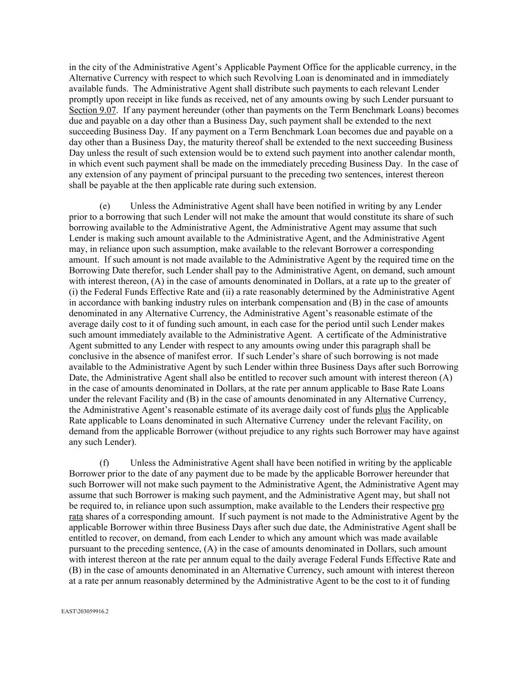 in the city of the Administrative Agent’s Applicable Payment Office for the applicable currency, in the Alternative Currency with respect to which such Revolving Loan is denominated and in immediately available funds. The Administrative Agent shall distribute such payments to each relevant Lender promptly upon receipt in like funds as received, net of any amounts owing by such Lender pursuant to Section 9.07. If any payment hereunder (other than payments on the Term Benchmark Loans) becomes due and payable on a day other than a Business Day, such payment shall be extended to the next succeeding Business Day. If any payment on a Term Benchmark Loan becomes due and payable on a day other than a Business Day, the maturity thereof shall be extended to the next succeeding Business Day unless the result of such extension would be to extend such payment into another calendar month, in which event such payment shall be made on the immediately preceding Business Day. In the case of any extension of any payment of principal pursuant to the preceding two sentences, interest thereon shall be payable at the then applicable rate during such extension. (e) Unless the Administrative Agent shall have been notified in writing by any Lender prior to a borrowing that such Lender will not make the amount that would constitute its share of such borrowing available to the Administrative Agent, the Administrative Agent may assume that such Lender is making such amount available to the Administrative Agent, and the Administrative Agent may, in reliance upon such assumption, make available to the relevant Borrower a corresponding amount. If such amount is not made available to the Administrative Agent by the required time on the Borrowing Date therefor, such Lender shall pay to the Administrative Agent, on demand, such amount with interest thereon, (A) in the case of amounts denominated in Dollars, at a rate up to the greater of (i) the Federal Funds Effective Rate and (ii) a rate reasonably determined by the Administrative Agent in accordance with banking industry rules on interbank compensation and (B) in the case of amounts denominated in any Alternative Currency, the Administrative Agent’s reasonable estimate of the average daily cost to it of funding such amount, in each case for the period until such Lender makes such amount immediately available to the Administrative Agent. A certificate of the Administrative Agent submitted to any Lender with respect to any amounts owing under this paragraph shall be conclusive in the absence of manifest error. If such Lender’s share of such borrowing is not made available to the Administrative Agent by such Lender within three Business Days after such Borrowing Date, the Administrative Agent shall also be entitled to recover such amount with interest thereon (A) in the case of amounts denominated in Dollars, at the rate per annum applicable to Base Rate Loans under the relevant Facility and (B) in the case of amounts denominated in any Alternative Currency, the Administrative Agent’s reasonable estimate of its average daily cost of funds plus the Applicable Rate applicable to Loans denominated in such Alternative Currency under the relevant Facility, on demand from the applicable Borrower (without prejudice to any rights such Borrower may have against any such Lender). (f) Unless the Administrative Agent shall have been notified in writing by the applicable Borrower prior to the date of any payment due to be made by the applicable Borrower hereunder that such Borrower will not make such payment to the Administrative Agent, the Administrative Agent may assume that such Borrower is making such payment, and the Administrative Agent may, but shall not be required to, in reliance upon such assumption, make available to the Lenders their respective pro rata shares of a corresponding amount. If such payment is not made to the Administrative Agent by the applicable Borrower within three Business Days after such due date, the Administrative Agent shall be entitled to recover, on demand, from each Lender to which any amount which was made available pursuant to the preceding sentence, (A) in the case of amounts denominated in Dollars, such amount with interest thereon at the rate per annum equal to the daily average Federal Funds Effective Rate and (B) in the case of amounts denominated in an Alternative Currency, such amount with interest thereon at a rate per annum reasonably determined by the Administrative Agent to be the cost to it of funding EAST\203059916.2