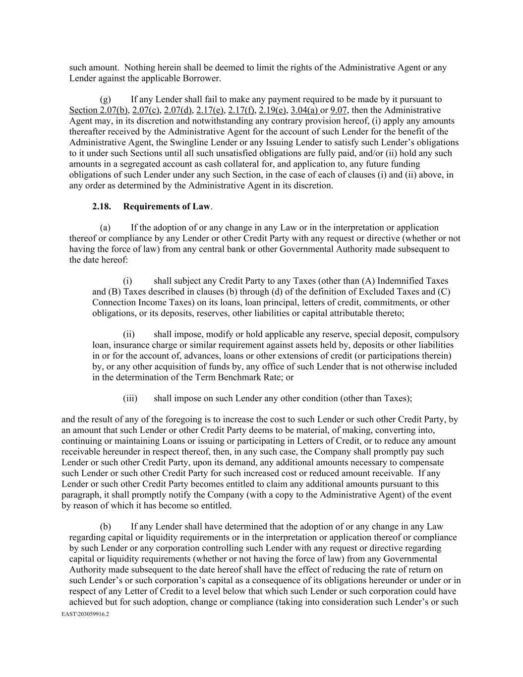 such amount. Nothing herein shall be deemed to limit the rights of the Administrative Agent or any Lender against the applicable Borrower. (g) If any Lender shall fail to make any payment required to be made by it pursuant to Section 2.07(b), 2.07(c), 2.07(d), 2.17(e), 2.17(f), 2.19(e), 3.04(a) or 9.07, then the Administrative Agent may, in its discretion and notwithstanding any contrary provision hereof, (i) apply any amounts thereafter received by the Administrative Agent for the account of such Lender for the benefit of the Administrative Agent, the Swingline Lender or any Issuing Lender to satisfy such Lender’s obligations to it under such Sections until all such unsatisfied obligations are fully paid, and/or (ii) hold any such amounts in a segregated account as cash collateral for, and application to, any future funding obligations of such Lender under any such Section, in the case of each of clauses (i) and (ii) above, in any order as determined by the Administrative Agent in its discretion. 2.18. Requirements of Law. (a) If the adoption of or any change in any Law or in the interpretation or application thereof or compliance by any Lender or other Credit Party with any request or directive (whether or not having the force of law) from any central bank or other Governmental Authority made subsequent to the date hereof: (i) shall subject any Credit Party to any Taxes (other than (A) Indemnified Taxes and (B) Taxes described in clauses (b) through (d) of the definition of Excluded Taxes and (C) Connection Income Taxes) on its loans, loan principal, letters of credit, commitments, or other obligations, or its deposits, reserves, other liabilities or capital attributable thereto; (ii) shall impose, modify or hold applicable any reserve, special deposit, compulsory loan, insurance charge or similar requirement against assets held by, deposits or other liabilities in or for the account of, advances, loans or other extensions of credit (or participations therein) by, or any other acquisition of funds by, any office of such Lender that is not otherwise included in the determination of the Term Benchmark Rate; or (iii) shall impose on such Lender any other condition (other than Taxes); and the result of any of the foregoing is to increase the cost to such Lender or such other Credit Party, by an amount that such Lender or other Credit Party deems to be material, of making, converting into, continuing or maintaining Loans or issuing or participating in Letters of Credit, or to reduce any amount receivable hereunder in respect thereof, then, in any such case, the Company shall promptly pay such Lender or such other Credit Party, upon its demand, any additional amounts necessary to compensate such Lender or such other Credit Party for such increased cost or reduced amount receivable. If any Lender or such other Credit Party becomes entitled to claim any additional amounts pursuant to this paragraph, it shall promptly notify the Company (with a copy to the Administrative Agent) of the event by reason of which it has become so entitled. (b) If any Lender shall have determined that the adoption of or any change in any Law regarding capital or liquidity requirements or in the interpretation or application thereof or compliance by such Lender or any corporation controlling such Lender with any request or directive regarding capital or liquidity requirements (whether or not having the force of law) from any Governmental Authority made subsequent to the date hereof shall have the effect of reducing the rate of return on such Lender’s or such corporation’s capital as a consequence of its obligations hereunder or under or in respect of any Letter of Credit to a level below that which such Lender or such corporation could have achieved but for such adoption, change or compliance (taking into consideration such Lender’s or such EAST\203059916.2