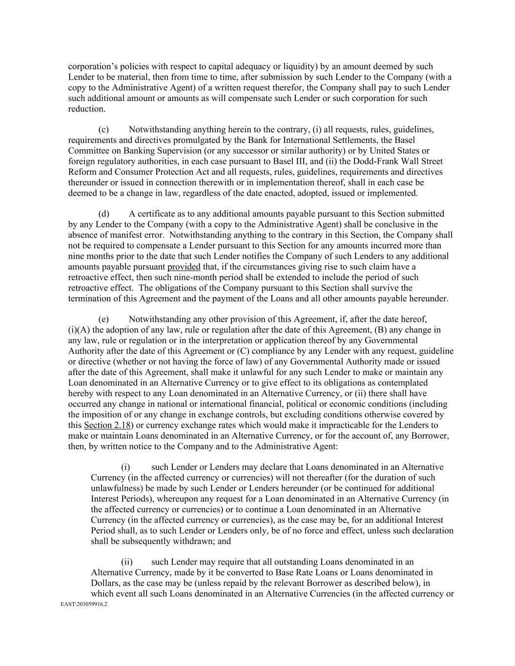 corporation’s policies with respect to capital adequacy or liquidity) by an amount deemed by such Lender to be material, then from time to time, after submission by such Lender to the Company (with a copy to the Administrative Agent) of a written request therefor, the Company shall pay to such Lender such additional amount or amounts as will compensate such Lender or such corporation for such reduction. (c) Notwithstanding anything herein to the contrary, (i) all requests, rules, guidelines, requirements and directives promulgated by the Bank for International Settlements, the Basel Committee on Banking Supervision (or any successor or similar authority) or by United States or foreign regulatory authorities, in each case pursuant to Basel III, and (ii) the Dodd-Frank Wall Street Reform and Consumer Protection Act and all requests, rules, guidelines, requirements and directives thereunder or issued in connection therewith or in implementation thereof, shall in each case be deemed to be a change in law, regardless of the date enacted, adopted, issued or implemented. (d) A certificate as to any additional amounts payable pursuant to this Section submitted by any Lender to the Company (with a copy to the Administrative Agent) shall be conclusive in the absence of manifest error. Notwithstanding anything to the contrary in this Section, the Company shall not be required to compensate a Lender pursuant to this Section for any amounts incurred more than nine months prior to the date that such Lender notifies the Company of such Lenders to any additional amounts payable pursuant provided that, if the circumstances giving rise to such claim have a retroactive effect, then such nine-month period shall be extended to include the period of such retroactive effect. The obligations of the Company pursuant to this Section shall survive the termination of this Agreement and the payment of the Loans and all other amounts payable hereunder. (e) Notwithstanding any other provision of this Agreement, if, after the date hereof, (i)(A) the adoption of any law, rule or regulation after the date of this Agreement, (B) any change in any law, rule or regulation or in the interpretation or application thereof by any Governmental Authority after the date of this Agreement or (C) compliance by any Lender with any request, guideline or directive (whether or not having the force of law) of any Governmental Authority made or issued after the date of this Agreement, shall make it unlawful for any such Lender to make or maintain any Loan denominated in an Alternative Currency or to give effect to its obligations as contemplated hereby with respect to any Loan denominated in an Alternative Currency, or (ii) there shall have occurred any change in national or international financial, political or economic conditions (including the imposition of or any change in exchange controls, but excluding conditions otherwise covered by this Section 2.18) or currency exchange rates which would make it impracticable for the Lenders to make or maintain Loans denominated in an Alternative Currency, or for the account of, any Borrower, then, by written notice to the Company and to the Administrative Agent: (i) such Lender or Lenders may declare that Loans denominated in an Alternative Currency (in the affected currency or currencies) will not thereafter (for the duration of such unlawfulness) be made by such Lender or Lenders hereunder (or be continued for additional Interest Periods), whereupon any request for a Loan denominated in an Alternative Currency (in the affected currency or currencies) or to continue a Loan denominated in an Alternative Currency (in the affected currency or currencies), as the case may be, for an additional Interest Period shall, as to such Lender or Lenders only, be of no force and effect, unless such declaration shall be subsequently withdrawn; and (ii) such Lender may require that all outstanding Loans denominated in an Alternative Currency, made by it be converted to Base Rate Loans or Loans denominated in Dollars, as the case may be (unless repaid by the relevant Borrower as described below), in which event all such Loans denominated in an Alternative Currencies (in the affected currency or EAST\203059916.2