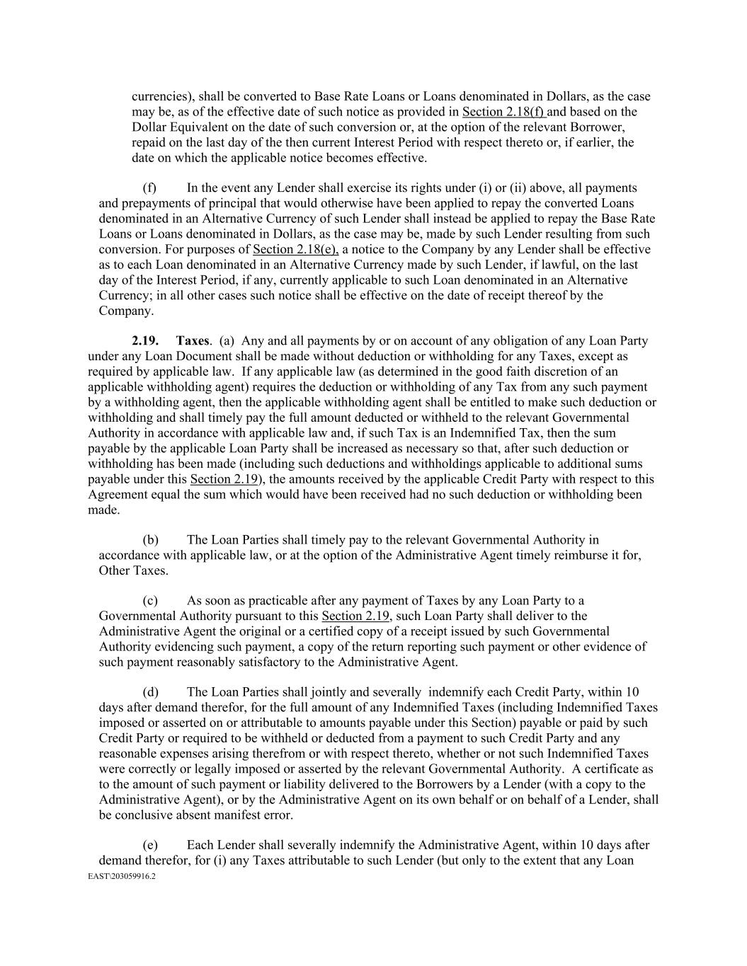 currencies), shall be converted to Base Rate Loans or Loans denominated in Dollars, as the case may be, as of the effective date of such notice as provided in Section 2.18(f) and based on the Dollar Equivalent on the date of such conversion or, at the option of the relevant Borrower, repaid on the last day of the then current Interest Period with respect thereto or, if earlier, the date on which the applicable notice becomes effective. (f) In the event any Lender shall exercise its rights under (i) or (ii) above, all payments and prepayments of principal that would otherwise have been applied to repay the converted Loans denominated in an Alternative Currency of such Lender shall instead be applied to repay the Base Rate Loans or Loans denominated in Dollars, as the case may be, made by such Lender resulting from such conversion. For purposes of Section 2.18(e), a notice to the Company by any Lender shall be effective as to each Loan denominated in an Alternative Currency made by such Lender, if lawful, on the last day of the Interest Period, if any, currently applicable to such Loan denominated in an Alternative Currency; in all other cases such notice shall be effective on the date of receipt thereof by the Company. 2.19. Taxes. (a) Any and all payments by or on account of any obligation of any Loan Party under any Loan Document shall be made without deduction or withholding for any Taxes, except as required by applicable law. If any applicable law (as determined in the good faith discretion of an applicable withholding agent) requires the deduction or withholding of any Tax from any such payment by a withholding agent, then the applicable withholding agent shall be entitled to make such deduction or withholding and shall timely pay the full amount deducted or withheld to the relevant Governmental Authority in accordance with applicable law and, if such Tax is an Indemnified Tax, then the sum payable by the applicable Loan Party shall be increased as necessary so that, after such deduction or withholding has been made (including such deductions and withholdings applicable to additional sums payable under this Section 2.19), the amounts received by the applicable Credit Party with respect to this Agreement equal the sum which would have been received had no such deduction or withholding been made. (b) The Loan Parties shall timely pay to the relevant Governmental Authority in accordance with applicable law, or at the option of the Administrative Agent timely reimburse it for, Other Taxes. (c) As soon as practicable after any payment of Taxes by any Loan Party to a Governmental Authority pursuant to this Section 2.19, such Loan Party shall deliver to the Administrative Agent the original or a certified copy of a receipt issued by such Governmental Authority evidencing such payment, a copy of the return reporting such payment or other evidence of such payment reasonably satisfactory to the Administrative Agent. (d) The Loan Parties shall jointly and severally indemnify each Credit Party, within 10 days after demand therefor, for the full amount of any Indemnified Taxes (including Indemnified Taxes imposed or asserted on or attributable to amounts payable under this Section) payable or paid by such Credit Party or required to be withheld or deducted from a payment to such Credit Party and any reasonable expenses arising therefrom or with respect thereto, whether or not such Indemnified Taxes were correctly or legally imposed or asserted by the relevant Governmental Authority. A certificate as to the amount of such payment or liability delivered to the Borrowers by a Lender (with a copy to the Administrative Agent), or by the Administrative Agent on its own behalf or on behalf of a Lender, shall be conclusive absent manifest error. (e) Each Lender shall severally indemnify the Administrative Agent, within 10 days after demand therefor, for (i) any Taxes attributable to such Lender (but only to the extent that any Loan EAST\203059916.2