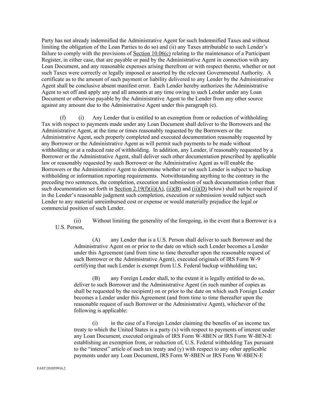 Party has not already indemnified the Administrative Agent for such Indemnified Taxes and without limiting the obligation of the Loan Parties to do so) and (ii) any Taxes attributable to such Lender’s failure to comply with the provisions of Section 10.06(c) relating to the maintenance of a Participant Register, in either case, that are payable or paid by the Administrative Agent in connection with any Loan Document, and any reasonable expenses arising therefrom or with respect thereto, whether or not such Taxes were correctly or legally imposed or asserted by the relevant Governmental Authority. A certificate as to the amount of such payment or liability delivered to any Lender by the Administrative Agent shall be conclusive absent manifest error. Each Lender hereby authorizes the Administrative Agent to set off and apply any and all amounts at any time owing to such Lender under any Loan Document or otherwise payable by the Administrative Agent to the Lender from any other source against any amount due to the Administrative Agent under this paragraph (e). (f) (i) Any Lender that is entitled to an exemption from or reduction of withholding Tax with respect to payments made under any Loan Document shall deliver to the Borrowers and the Administrative Agent, at the time or times reasonably requested by the Borrowers or the Administrative Agent, such properly completed and executed documentation reasonably requested by any Borrower or the Administrative Agent as will permit such payments to be made without withholding or at a reduced rate of withholding. In addition, any Lender, if reasonably requested by a Borrower or the Administrative Agent, shall deliver such other documentation prescribed by applicable law or reasonably requested by such Borrower or the Administrative Agent as will enable the Borrowers or the Administrative Agent to determine whether or not such Lender is subject to backup withholding or information reporting requirements. Notwithstanding anything to the contrary in the preceding two sentences, the completion, execution and submission of such documentation (other than such documentation set forth in Section 2.19(f)(ii)(A), (ii)(B) and (ii)(D) below) shall not be required if in the Lender’s reasonable judgment such completion, execution or submission would subject such Lender to any material unreimbursed cost or expense or would materially prejudice the legal or commercial position of such Lender. (ii) Without limiting the generality of the foregoing, in the event that a Borrower is a U.S. Person, (A) any Lender that is a U.S. Person shall deliver to such Borrower and the Administrative Agent on or prior to the date on which such Lender becomes a Lender under this Agreement (and from time to time thereafter upon the reasonable request of such Borrower or the Administrative Agent), executed originals of IRS Form W-9 certifying that such Lender is exempt from U.S. Federal backup withholding tax; (B) any Foreign Lender shall, to the extent it is legally entitled to do so, deliver to such Borrower and the Administrative Agent (in such number of copies as shall be requested by the recipient) on or prior to the date on which such Foreign Lender becomes a Lender under this Agreement (and from time to time thereafter upon the reasonable request of such Borrower or the Administrative Agent), whichever of the following is applicable: (i) in the case of a Foreign Lender claiming the benefits of an income tax treaty to which the United States is a party (x) with respect to payments of interest under any Loan Document, executed originals of IRS Form W-8BEN or IRS Form W-BEN-E establishing an exemption from, or reduction of, U.S. Federal withholding Tax pursuant to the “interest” article of such tax treaty and (y) with respect to any other applicable payments under any Loan Document, IRS Form W-8BEN or IRS Form W-8BEN-E EAST\203059916.2