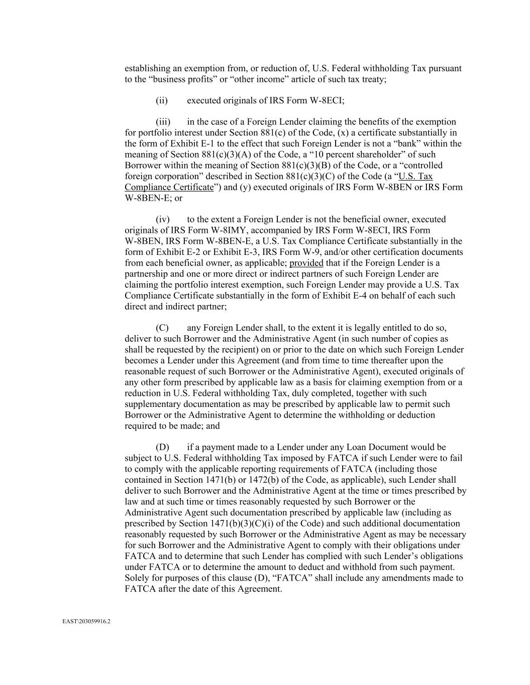 establishing an exemption from, or reduction of, U.S. Federal withholding Tax pursuant to the “business profits” or “other income” article of such tax treaty; (ii) executed originals of IRS Form W-8ECI; (iii) in the case of a Foreign Lender claiming the benefits of the exemption for portfolio interest under Section 881(c) of the Code, (x) a certificate substantially in the form of Exhibit E-1 to the effect that such Foreign Lender is not a “bank” within the meaning of Section 881(c)(3)(A) of the Code, a “10 percent shareholder” of such Borrower within the meaning of Section 881(c)(3)(B) of the Code, or a “controlled foreign corporation” described in Section 881(c)(3)(C) of the Code (a “U.S. Tax Compliance Certificate”) and (y) executed originals of IRS Form W-8BEN or IRS Form W-8BEN-E; or (iv) to the extent a Foreign Lender is not the beneficial owner, executed originals of IRS Form W-8IMY, accompanied by IRS Form W-8ECI, IRS Form W-8BEN, IRS Form W-8BEN-E, a U.S. Tax Compliance Certificate substantially in the form of Exhibit E-2 or Exhibit E-3, IRS Form W-9, and/or other certification documents from each beneficial owner, as applicable; provided that if the Foreign Lender is a partnership and one or more direct or indirect partners of such Foreign Lender are claiming the portfolio interest exemption, such Foreign Lender may provide a U.S. Tax Compliance Certificate substantially in the form of Exhibit E-4 on behalf of each such direct and indirect partner; (C) any Foreign Lender shall, to the extent it is legally entitled to do so, deliver to such Borrower and the Administrative Agent (in such number of copies as shall be requested by the recipient) on or prior to the date on which such Foreign Lender becomes a Lender under this Agreement (and from time to time thereafter upon the reasonable request of such Borrower or the Administrative Agent), executed originals of any other form prescribed by applicable law as a basis for claiming exemption from or a reduction in U.S. Federal withholding Tax, duly completed, together with such supplementary documentation as may be prescribed by applicable law to permit such Borrower or the Administrative Agent to determine the withholding or deduction required to be made; and (D) if a payment made to a Lender under any Loan Document would be subject to U.S. Federal withholding Tax imposed by FATCA if such Lender were to fail to comply with the applicable reporting requirements of FATCA (including those contained in Section 1471(b) or 1472(b) of the Code, as applicable), such Lender shall deliver to such Borrower and the Administrative Agent at the time or times prescribed by law and at such time or times reasonably requested by such Borrower or the Administrative Agent such documentation prescribed by applicable law (including as prescribed by Section 1471(b)(3)(C)(i) of the Code) and such additional documentation reasonably requested by such Borrower or the Administrative Agent as may be necessary for such Borrower and the Administrative Agent to comply with their obligations under FATCA and to determine that such Lender has complied with such Lender’s obligations under FATCA or to determine the amount to deduct and withhold from such payment. Solely for purposes of this clause (D), “FATCA” shall include any amendments made to FATCA after the date of this Agreement. EAST\203059916.2