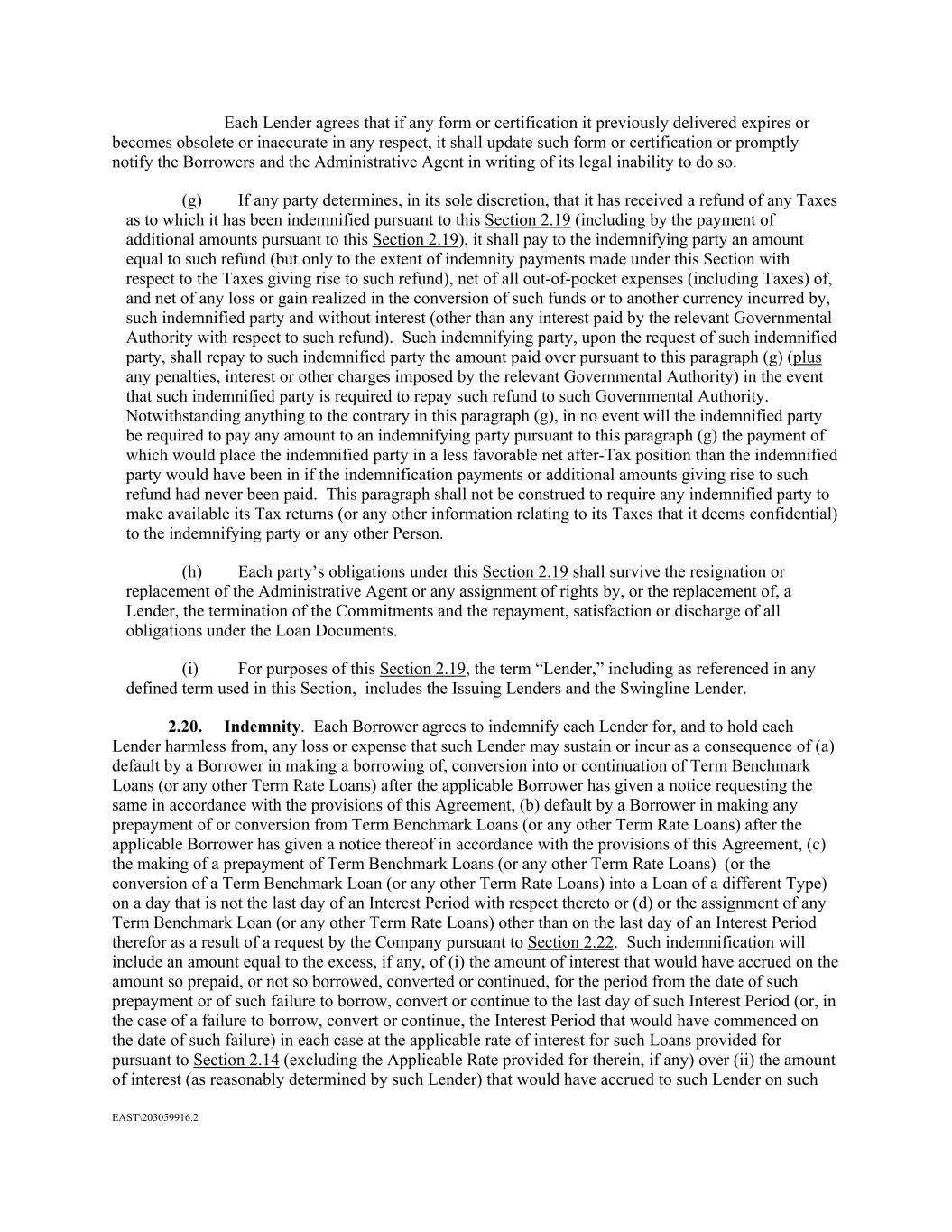 Each Lender agrees that if any form or certification it previously delivered expires or becomes obsolete or inaccurate in any respect, it shall update such form or certification or promptly notify the Borrowers and the Administrative Agent in writing of its legal inability to do so. (g) If any party determines, in its sole discretion, that it has received a refund of any Taxes as to which it has been indemnified pursuant to this Section 2.19 (including by the payment of additional amounts pursuant to this Section 2.19), it shall pay to the indemnifying party an amount equal to such refund (but only to the extent of indemnity payments made under this Section with respect to the Taxes giving rise to such refund), net of all out-of-pocket expenses (including Taxes) of, and net of any loss or gain realized in the conversion of such funds or to another currency incurred by, such indemnified party and without interest (other than any interest paid by the relevant Governmental Authority with respect to such refund). Such indemnifying party, upon the request of such indemnified party, shall repay to such indemnified party the amount paid over pursuant to this paragraph (g) (plus any penalties, interest or other charges imposed by the relevant Governmental Authority) in the event that such indemnified party is required to repay such refund to such Governmental Authority. Notwithstanding anything to the contrary in this paragraph (g), in no event will the indemnified party be required to pay any amount to an indemnifying party pursuant to this paragraph (g) the payment of which would place the indemnified party in a less favorable net after-Tax position than the indemnified party would have been in if the indemnification payments or additional amounts giving rise to such refund had never been paid. This paragraph shall not be construed to require any indemnified party to make available its Tax returns (or any other information relating to its Taxes that it deems confidential) to the indemnifying party or any other Person. (h) Each party’s obligations under this Section 2.19 shall survive the resignation or replacement of the Administrative Agent or any assignment of rights by, or the replacement of, a Lender, the termination of the Commitments and the repayment, satisfaction or discharge of all obligations under the Loan Documents. (i) For purposes of this Section 2.19, the term “Lender,” including as referenced in any defined term used in this Section, includes the Issuing Lenders and the Swingline Lender. 2.20. Indemnity. Each Borrower agrees to indemnify each Lender for, and to hold each Lender harmless from, any loss or expense that such Lender may sustain or incur as a consequence of (a) default by a Borrower in making a borrowing of, conversion into or continuation of Term Benchmark Loans (or any other Term Rate Loans) after the applicable Borrower has given a notice requesting the same in accordance with the provisions of this Agreement, (b) default by a Borrower in making any prepayment of or conversion from Term Benchmark Loans (or any other Term Rate Loans) after the applicable Borrower has given a notice thereof in accordance with the provisions of this Agreement, (c) the making of a prepayment of Term Benchmark Loans (or any other Term Rate Loans) (or the conversion of a Term Benchmark Loan (or any other Term Rate Loans) into a Loan of a different Type) on a day that is not the last day of an Interest Period with respect thereto or (d) or the assignment of any Term Benchmark Loan (or any other Term Rate Loans) other than on the last day of an Interest Period therefor as a result of a request by the Company pursuant to Section 2.22. Such indemnification will include an amount equal to the excess, if any, of (i) the amount of interest that would have accrued on the amount so prepaid, or not so borrowed, converted or continued, for the period from the date of such prepayment or of such failure to borrow, convert or continue to the last day of such Interest Period (or, in the case of a failure to borrow, convert or continue, the Interest Period that would have commenced on the date of such failure) in each case at the applicable rate of interest for such Loans provided for pursuant to Section 2.14 (excluding the Applicable Rate provided for therein, if any) over (ii) the amount of interest (as reasonably determined by such Lender) that would have accrued to such Lender on such EAST\203059916.2