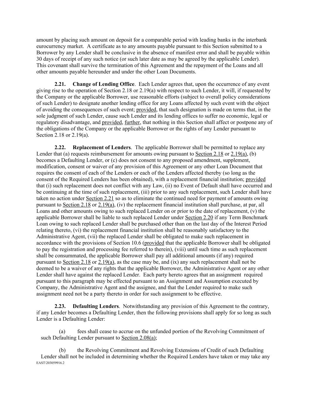 amount by placing such amount on deposit for a comparable period with leading banks in the interbank eurocurrency market. A certificate as to any amounts payable pursuant to this Section submitted to a Borrower by any Lender shall be conclusive in the absence of manifest error and shall be payable within 30 days of receipt of any such notice (or such later date as may be agreed by the applicable Lender). This covenant shall survive the termination of this Agreement and the repayment of the Loans and all other amounts payable hereunder and under the other Loan Documents. 2.21. Change of Lending Office. Each Lender agrees that, upon the occurrence of any event giving rise to the operation of Section 2.18 or 2.19(a) with respect to such Lender, it will, if requested by the Company or the applicable Borrower, use reasonable efforts (subject to overall policy considerations of such Lender) to designate another lending office for any Loans affected by such event with the object of avoiding the consequences of such event; provided, that such designation is made on terms that, in the sole judgment of such Lender, cause such Lender and its lending offices to suffer no economic, legal or regulatory disadvantage, and provided, further, that nothing in this Section shall affect or postpone any of the obligations of the Company or the applicable Borrower or the rights of any Lender pursuant to Section 2.18 or 2.19(a). 2.22. Replacement of Lenders. The applicable Borrower shall be permitted to replace any Lender that (a) requests reimbursement for amounts owing pursuant to Section 2.18 or 2.19(a), (b) becomes a Defaulting Lender, or (c) does not consent to any proposed amendment, supplement, modification, consent or waiver of any provision of this Agreement or any other Loan Document that requires the consent of each of the Lenders or each of the Lenders affected thereby (so long as the consent of the Required Lenders has been obtained), with a replacement financial institution; provided that (i) such replacement does not conflict with any Law, (ii) no Event of Default shall have occurred and be continuing at the time of such replacement, (iii) prior to any such replacement, such Lender shall have taken no action under Section 2.21 so as to eliminate the continued need for payment of amounts owing pursuant to Section 2.18 or 2.19(a), (iv) the replacement financial institution shall purchase, at par, all Loans and other amounts owing to such replaced Lender on or prior to the date of replacement, (v) the applicable Borrower shall be liable to such replaced Lender under Section 2.20 if any Term Benchmark Loan owing to such replaced Lender shall be purchased other than on the last day of the Interest Period relating thereto, (vi) the replacement financial institution shall be reasonably satisfactory to the Administrative Agent, (vii) the replaced Lender shall be obligated to make such replacement in accordance with the provisions of Section 10.6 (provided that the applicable Borrower shall be obligated to pay the registration and processing fee referred to therein), (viii) until such time as such replacement shall be consummated, the applicable Borrower shall pay all additional amounts (if any) required pursuant to Section 2.18 or 2.19(a), as the case may be, and (ix) any such replacement shall not be deemed to be a waiver of any rights that the applicable Borrower, the Administrative Agent or any other Lender shall have against the replaced Lender. Each party hereto agrees that an assignment required pursuant to this paragraph may be effected pursuant to an Assignment and Assumption executed by Company, the Administrative Agent and the assignee, and that the Lender required to make such assignment need not be a party thereto in order for such assignment to be effective. 2.23. Defaulting Lenders. Notwithstanding any provision of this Agreement to the contrary, if any Lender becomes a Defaulting Lender, then the following provisions shall apply for so long as such Lender is a Defaulting Lender: (a) fees shall cease to accrue on the unfunded portion of the Revolving Commitment of such Defaulting Lender pursuant to Section 2.08(a); (b) the Revolving Commitment and Revolving Extensions of Credit of such Defaulting Lender shall not be included in determining whether the Required Lenders have taken or may take any EAST\203059916.2