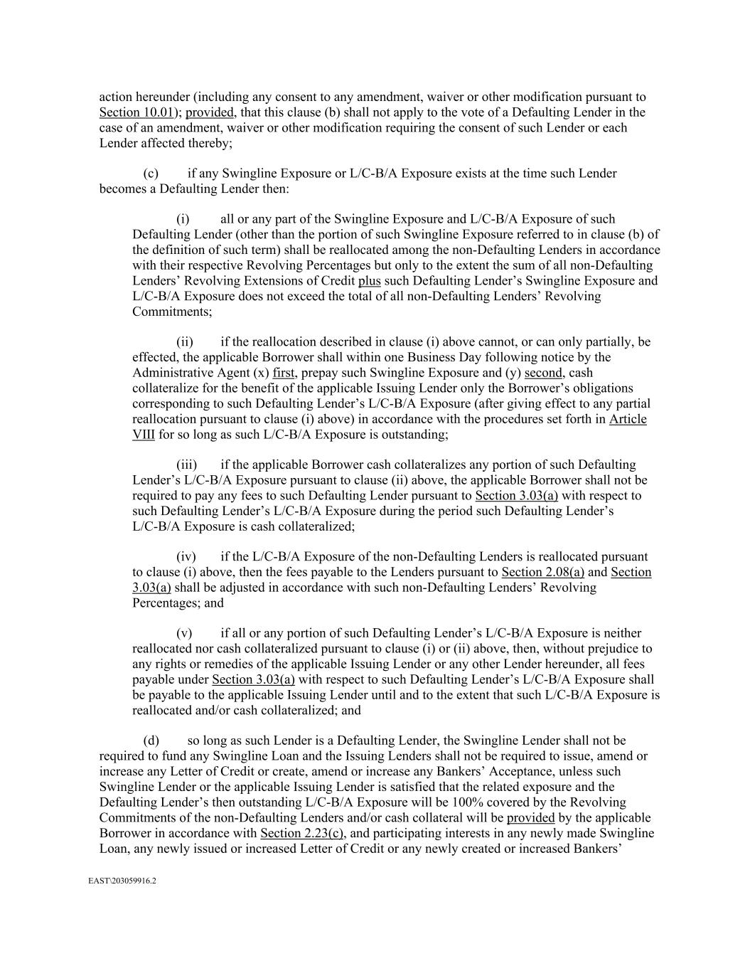 action hereunder (including any consent to any amendment, waiver or other modification pursuant to Section 10.01); provided, that this clause (b) shall not apply to the vote of a Defaulting Lender in the case of an amendment, waiver or other modification requiring the consent of such Lender or each Lender affected thereby; (c) if any Swingline Exposure or L/C-B/A Exposure exists at the time such Lender becomes a Defaulting Lender then: (i) all or any part of the Swingline Exposure and L/C-B/A Exposure of such Defaulting Lender (other than the portion of such Swingline Exposure referred to in clause (b) of the definition of such term) shall be reallocated among the non-Defaulting Lenders in accordance with their respective Revolving Percentages but only to the extent the sum of all non-Defaulting Lenders’ Revolving Extensions of Credit plus such Defaulting Lender’s Swingline Exposure and L/C-B/A Exposure does not exceed the total of all non-Defaulting Lenders’ Revolving Commitments; (ii) if the reallocation described in clause (i) above cannot, or can only partially, be effected, the applicable Borrower shall within one Business Day following notice by the Administrative Agent (x) first, prepay such Swingline Exposure and (y) second, cash collateralize for the benefit of the applicable Issuing Lender only the Borrower’s obligations corresponding to such Defaulting Lender’s L/C-B/A Exposure (after giving effect to any partial reallocation pursuant to clause (i) above) in accordance with the procedures set forth in Article VIII for so long as such L/C-B/A Exposure is outstanding; (iii) if the applicable Borrower cash collateralizes any portion of such Defaulting Lender’s L/C-B/A Exposure pursuant to clause (ii) above, the applicable Borrower shall not be required to pay any fees to such Defaulting Lender pursuant to Section 3.03(a) with respect to such Defaulting Lender’s L/C-B/A Exposure during the period such Defaulting Lender’s L/C-B/A Exposure is cash collateralized; (iv) if the L/C-B/A Exposure of the non-Defaulting Lenders is reallocated pursuant to clause (i) above, then the fees payable to the Lenders pursuant to Section 2.08(a) and Section 3.03(a) shall be adjusted in accordance with such non-Defaulting Lenders’ Revolving Percentages; and (v) if all or any portion of such Defaulting Lender’s L/C-B/A Exposure is neither reallocated nor cash collateralized pursuant to clause (i) or (ii) above, then, without prejudice to any rights or remedies of the applicable Issuing Lender or any other Lender hereunder, all fees payable under Section 3.03(a) with respect to such Defaulting Lender’s L/C-B/A Exposure shall be payable to the applicable Issuing Lender until and to the extent that such L/C-B/A Exposure is reallocated and/or cash collateralized; and (d) so long as such Lender is a Defaulting Lender, the Swingline Lender shall not be required to fund any Swingline Loan and the Issuing Lenders shall not be required to issue, amend or increase any Letter of Credit or create, amend or increase any Bankers’ Acceptance, unless such Swingline Lender or the applicable Issuing Lender is satisfied that the related exposure and the Defaulting Lender’s then outstanding L/C-B/A Exposure will be 100% covered by the Revolving Commitments of the non-Defaulting Lenders and/or cash collateral will be provided by the applicable Borrower in accordance with Section 2.23(c), and participating interests in any newly made Swingline Loan, any newly issued or increased Letter of Credit or any newly created or increased Bankers’ EAST\203059916.2