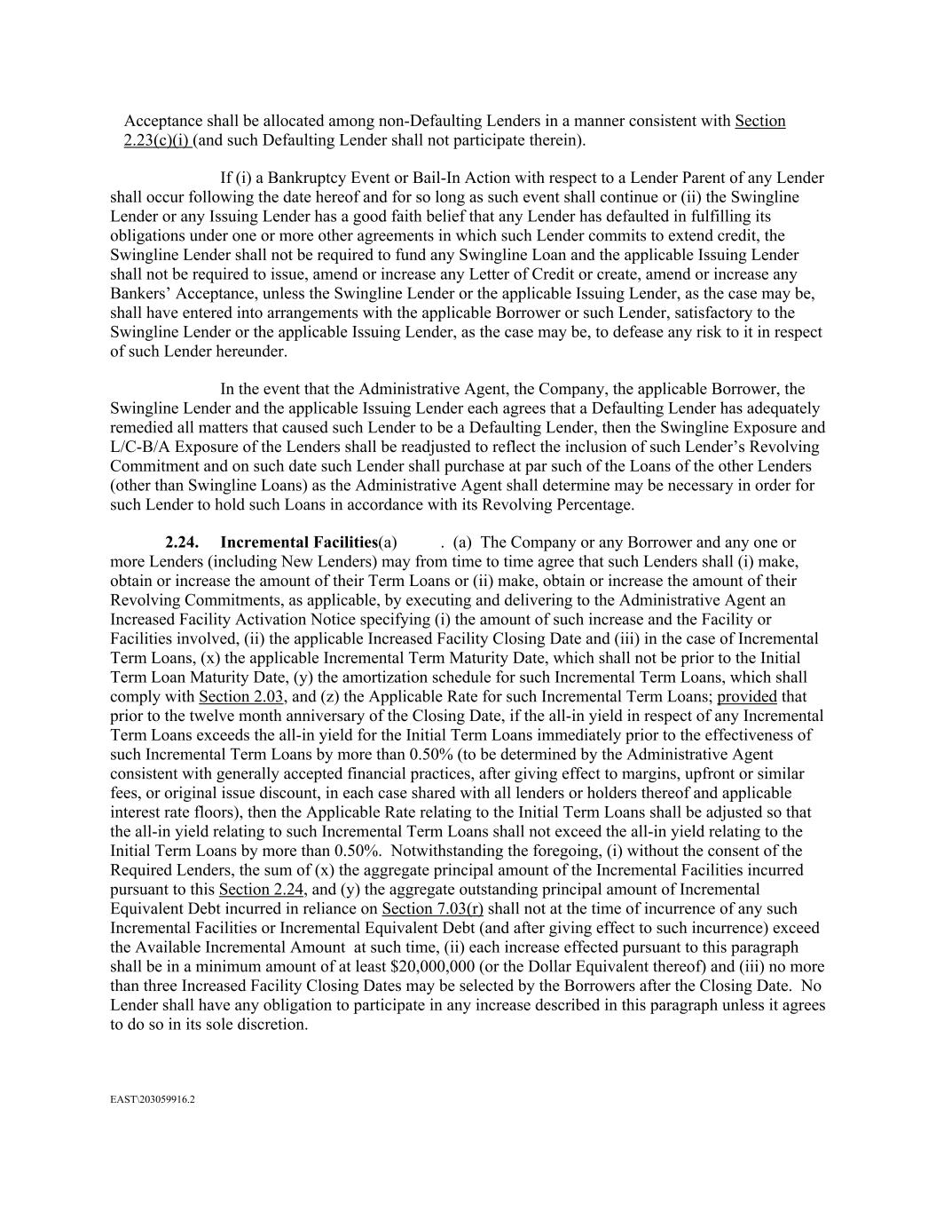 Acceptance shall be allocated among non-Defaulting Lenders in a manner consistent with Section 2.23(c)(i) (and such Defaulting Lender shall not participate therein). If (i) a Bankruptcy Event or Bail-In Action with respect to a Lender Parent of any Lender shall occur following the date hereof and for so long as such event shall continue or (ii) the Swingline Lender or any Issuing Lender has a good faith belief that any Lender has defaulted in fulfilling its obligations under one or more other agreements in which such Lender commits to extend credit, the Swingline Lender shall not be required to fund any Swingline Loan and the applicable Issuing Lender shall not be required to issue, amend or increase any Letter of Credit or create, amend or increase any Bankers’ Acceptance, unless the Swingline Lender or the applicable Issuing Lender, as the case may be, shall have entered into arrangements with the applicable Borrower or such Lender, satisfactory to the Swingline Lender or the applicable Issuing Lender, as the case may be, to defease any risk to it in respect of such Lender hereunder. In the event that the Administrative Agent, the Company, the applicable Borrower, the Swingline Lender and the applicable Issuing Lender each agrees that a Defaulting Lender has adequately remedied all matters that caused such Lender to be a Defaulting Lender, then the Swingline Exposure and L/C-B/A Exposure of the Lenders shall be readjusted to reflect the inclusion of such Lender’s Revolving Commitment and on such date such Lender shall purchase at par such of the Loans of the other Lenders (other than Swingline Loans) as the Administrative Agent shall determine may be necessary in order for such Lender to hold such Loans in accordance with its Revolving Percentage. 2.24. Incremental Facilities(a) . (a) The Company or any Borrower and any one or more Lenders (including New Lenders) may from time to time agree that such Lenders shall (i) make, obtain or increase the amount of their Term Loans or (ii) make, obtain or increase the amount of their Revolving Commitments, as applicable, by executing and delivering to the Administrative Agent an Increased Facility Activation Notice specifying (i) the amount of such increase and the Facility or Facilities involved, (ii) the applicable Increased Facility Closing Date and (iii) in the case of Incremental Term Loans, (x) the applicable Incremental Term Maturity Date, which shall not be prior to the Initial Term Loan Maturity Date, (y) the amortization schedule for such Incremental Term Loans, which shall comply with Section 2.03, and (z) the Applicable Rate for such Incremental Term Loans; provided that prior to the twelve month anniversary of the Closing Date, if the all-in yield in respect of any Incremental Term Loans exceeds the all-in yield for the Initial Term Loans immediately prior to the effectiveness of such Incremental Term Loans by more than 0.50% (to be determined by the Administrative Agent consistent with generally accepted financial practices, after giving effect to margins, upfront or similar fees, or original issue discount, in each case shared with all lenders or holders thereof and applicable interest rate floors), then the Applicable Rate relating to the Initial Term Loans shall be adjusted so that the all-in yield relating to such Incremental Term Loans shall not exceed the all-in yield relating to the Initial Term Loans by more than 0.50%. Notwithstanding the foregoing, (i) without the consent of the Required Lenders, the sum of (x) the aggregate principal amount of the Incremental Facilities incurred pursuant to this Section 2.24, and (y) the aggregate outstanding principal amount of Incremental Equivalent Debt incurred in reliance on Section 7.03(r) shall not at the time of incurrence of any such Incremental Facilities or Incremental Equivalent Debt (and after giving effect to such incurrence) exceed the Available Incremental Amount at such time, (ii) each increase effected pursuant to this paragraph shall be in a minimum amount of at least $20,000,000 (or the Dollar Equivalent thereof) and (iii) no more than three Increased Facility Closing Dates may be selected by the Borrowers after the Closing Date. No Lender shall have any obligation to participate in any increase described in this paragraph unless it agrees to do so in its sole discretion. EAST\203059916.2
