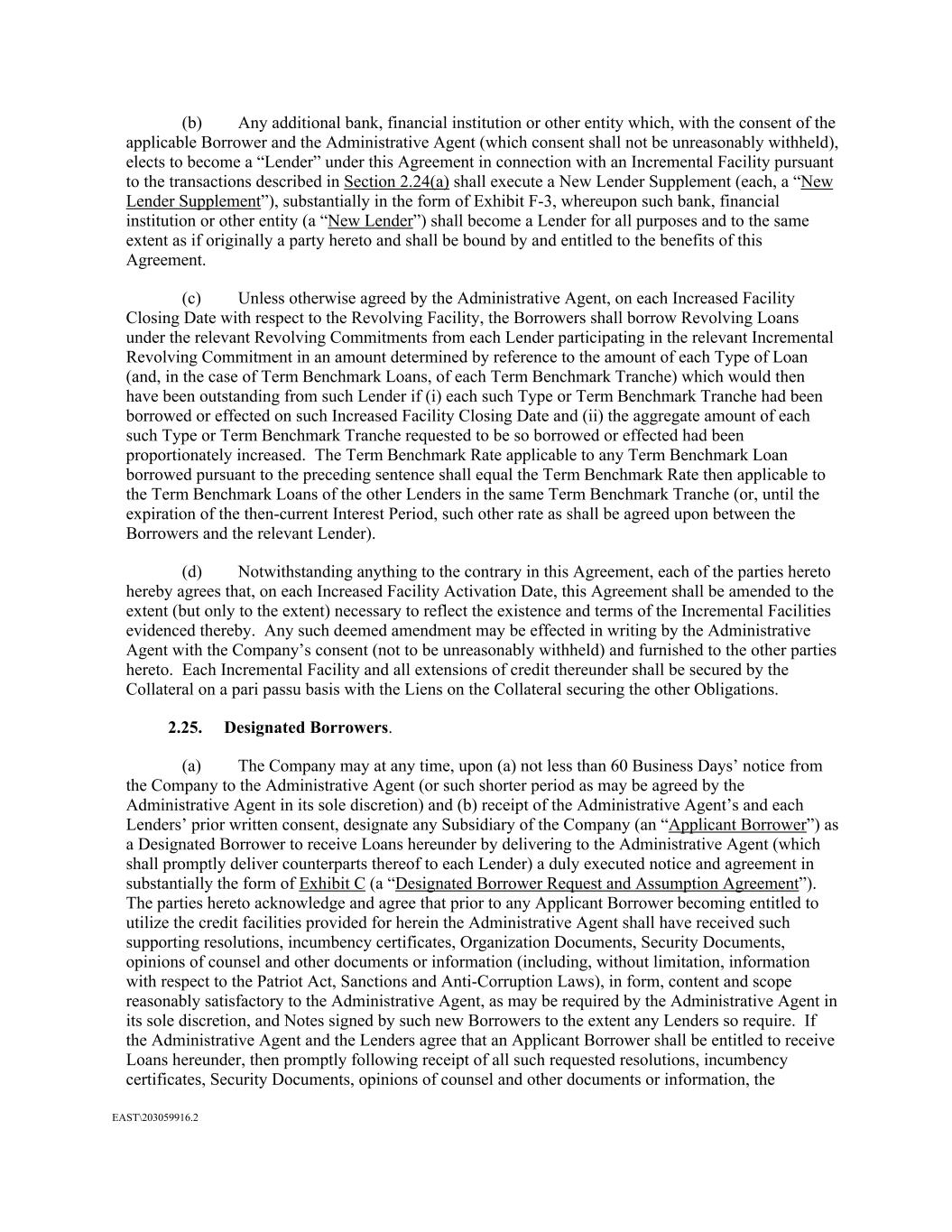 (b) Any additional bank, financial institution or other entity which, with the consent of the applicable Borrower and the Administrative Agent (which consent shall not be unreasonably withheld), elects to become a “Lender” under this Agreement in connection with an Incremental Facility pursuant to the transactions described in Section 2.24(a) shall execute a New Lender Supplement (each, a “New Lender Supplement”), substantially in the form of Exhibit F-3, whereupon such bank, financial institution or other entity (a “New Lender”) shall become a Lender for all purposes and to the same extent as if originally a party hereto and shall be bound by and entitled to the benefits of this Agreement. (c) Unless otherwise agreed by the Administrative Agent, on each Increased Facility Closing Date with respect to the Revolving Facility, the Borrowers shall borrow Revolving Loans under the relevant Revolving Commitments from each Lender participating in the relevant Incremental Revolving Commitment in an amount determined by reference to the amount of each Type of Loan (and, in the case of Term Benchmark Loans, of each Term Benchmark Tranche) which would then have been outstanding from such Lender if (i) each such Type or Term Benchmark Tranche had been borrowed or effected on such Increased Facility Closing Date and (ii) the aggregate amount of each such Type or Term Benchmark Tranche requested to be so borrowed or effected had been proportionately increased. The Term Benchmark Rate applicable to any Term Benchmark Loan borrowed pursuant to the preceding sentence shall equal the Term Benchmark Rate then applicable to the Term Benchmark Loans of the other Lenders in the same Term Benchmark Tranche (or, until the expiration of the then-current Interest Period, such other rate as shall be agreed upon between the Borrowers and the relevant Lender). (d) Notwithstanding anything to the contrary in this Agreement, each of the parties hereto hereby agrees that, on each Increased Facility Activation Date, this Agreement shall be amended to the extent (but only to the extent) necessary to reflect the existence and terms of the Incremental Facilities evidenced thereby. Any such deemed amendment may be effected in writing by the Administrative Agent with the Company’s consent (not to be unreasonably withheld) and furnished to the other parties hereto. Each Incremental Facility and all extensions of credit thereunder shall be secured by the Collateral on a pari passu basis with the Liens on the Collateral securing the other Obligations. 2.25. Designated Borrowers. (a) The Company may at any time, upon (a) not less than 60 Business Days’ notice from the Company to the Administrative Agent (or such shorter period as may be agreed by the Administrative Agent in its sole discretion) and (b) receipt of the Administrative Agent’s and each Lenders’ prior written consent, designate any Subsidiary of the Company (an “Applicant Borrower”) as a Designated Borrower to receive Loans hereunder by delivering to the Administrative Agent (which shall promptly deliver counterparts thereof to each Lender) a duly executed notice and agreement in substantially the form of Exhibit C (a “Designated Borrower Request and Assumption Agreement”). The parties hereto acknowledge and agree that prior to any Applicant Borrower becoming entitled to utilize the credit facilities provided for herein the Administrative Agent shall have received such supporting resolutions, incumbency certificates, Organization Documents, Security Documents, opinions of counsel and other documents or information (including, without limitation, information with respect to the Patriot Act, Sanctions and Anti-Corruption Laws), in form, content and scope reasonably satisfactory to the Administrative Agent, as may be required by the Administrative Agent in its sole discretion, and Notes signed by such new Borrowers to the extent any Lenders so require. If the Administrative Agent and the Lenders agree that an Applicant Borrower shall be entitled to receive Loans hereunder, then promptly following receipt of all such requested resolutions, incumbency certificates, Security Documents, opinions of counsel and other documents or information, the EAST\203059916.2