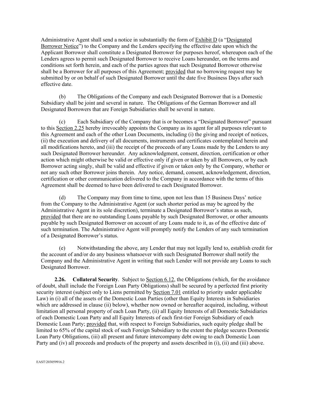 Administrative Agent shall send a notice in substantially the form of Exhibit D (a “Designated Borrower Notice”) to the Company and the Lenders specifying the effective date upon which the Applicant Borrower shall constitute a Designated Borrower for purposes hereof, whereupon each of the Lenders agrees to permit such Designated Borrower to receive Loans hereunder, on the terms and conditions set forth herein, and each of the parties agrees that such Designated Borrower otherwise shall be a Borrower for all purposes of this Agreement; provided that no borrowing request may be submitted by or on behalf of such Designated Borrower until the date five Business Days after such effective date. (b) The Obligations of the Company and each Designated Borrower that is a Domestic Subsidiary shall be joint and several in nature. The Obligations of the German Borrower and all Designated Borrowers that are Foreign Subsidiaries shall be several in nature. (c) Each Subsidiary of the Company that is or becomes a “Designated Borrower” pursuant to this Section 2.25 hereby irrevocably appoints the Company as its agent for all purposes relevant to this Agreement and each of the other Loan Documents, including (i) the giving and receipt of notices, (ii) the execution and delivery of all documents, instruments and certificates contemplated herein and all modifications hereto, and (iii) the receipt of the proceeds of any Loans made by the Lenders to any such Designated Borrower hereunder. Any acknowledgment, consent, direction, certification or other action which might otherwise be valid or effective only if given or taken by all Borrowers, or by each Borrower acting singly, shall be valid and effective if given or taken only by the Company, whether or not any such other Borrower joins therein. Any notice, demand, consent, acknowledgement, direction, certification or other communication delivered to the Company in accordance with the terms of this Agreement shall be deemed to have been delivered to each Designated Borrower. (d) The Company may from time to time, upon not less than 15 Business Days’ notice from the Company to the Administrative Agent (or such shorter period as may be agreed by the Administrative Agent in its sole discretion), terminate a Designated Borrower’s status as such, provided that there are no outstanding Loans payable by such Designated Borrower, or other amounts payable by such Designated Borrower on account of any Loans made to it, as of the effective date of such termination. The Administrative Agent will promptly notify the Lenders of any such termination of a Designated Borrower’s status. (e) Notwithstanding the above, any Lender that may not legally lend to, establish credit for the account of and/or do any business whatsoever with such Designated Borrower shall notify the Company and the Administrative Agent in writing that such Lender will not provide any Loans to such Designated Borrower. 2.26. Collateral Security. Subject to Section 6.12, the Obligations (which, for the avoidance of doubt, shall include the Foreign Loan Party Obligations) shall be secured by a perfected first priority security interest (subject only to Liens permitted by Section 7.01 entitled to priority under applicable Law) in (i) all of the assets of the Domestic Loan Parties (other than Equity Interests in Subsidiaries which are addressed in clause (ii) below), whether now owned or hereafter acquired, including, without limitation all personal property of each Loan Party, (ii) all Equity Interests of all Domestic Subsidiaries of each Domestic Loan Party and all Equity Interests of each first-tier Foreign Subsidiary of each Domestic Loan Party; provided that, with respect to Foreign Subsidiaries, such equity pledge shall be limited to 65% of the capital stock of such Foreign Subsidiary to the extent the pledge secures Domestic Loan Party Obligations, (iii) all present and future intercompany debt owing to each Domestic Loan Party and (iv) all proceeds and products of the property and assets described in (i), (ii) and (iii) above. EAST\203059916.2