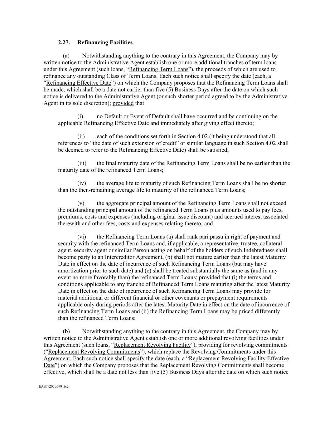 2.27. Refinancing Facilities. (a) Notwithstanding anything to the contrary in this Agreement, the Company may by written notice to the Administrative Agent establish one or more additional tranches of term loans under this Agreement (such loans, “Refinancing Term Loans”), the proceeds of which are used to refinance any outstanding Class of Term Loans. Each such notice shall specify the date (each, a “Refinancing Effective Date”) on which the Company proposes that the Refinancing Term Loans shall be made, which shall be a date not earlier than five (5) Business Days after the date on which such notice is delivered to the Administrative Agent (or such shorter period agreed to by the Administrative Agent in its sole discretion); provided that (i) no Default or Event of Default shall have occurred and be continuing on the applicable Refinancing Effective Date and immediately after giving effect thereto; (ii) each of the conditions set forth in Section 4.02 (it being understood that all references to “the date of such extension of credit” or similar language in such Section 4.02 shall be deemed to refer to the Refinancing Effective Date) shall be satisfied; (iii) the final maturity date of the Refinancing Term Loans shall be no earlier than the maturity date of the refinanced Term Loans; (iv) the average life to maturity of such Refinancing Term Loans shall be no shorter than the then-remaining average life to maturity of the refinanced Term Loans; (v) the aggregate principal amount of the Refinancing Term Loans shall not exceed the outstanding principal amount of the refinanced Term Loans plus amounts used to pay fees, premiums, costs and expenses (including original issue discount) and accrued interest associated therewith and other fees, costs and expenses relating thereto; and (vi) the Refinancing Term Loans (a) shall rank pari passu in right of payment and security with the refinanced Term Loans and, if applicable, a representative, trustee, collateral agent, security agent or similar Person acting on behalf of the holders of such Indebtedness shall become party to an Intercreditor Agreement, (b) shall not mature earlier than the latest Maturity Date in effect on the date of incurrence of such Refinancing Term Loans (but may have amortization prior to such date) and (c) shall be treated substantially the same as (and in any event no more favorably than) the refinanced Term Loans; provided that (i) the terms and conditions applicable to any tranche of Refinanced Term Loans maturing after the latest Maturity Date in effect on the date of incurrence of such Refinancing Term Loans may provide for material additional or different financial or other covenants or prepayment requirements applicable only during periods after the latest Maturity Date in effect on the date of incurrence of such Refinancing Term Loans and (ii) the Refinancing Term Loans may be priced differently than the refinanced Term Loans; (b) Notwithstanding anything to the contrary in this Agreement, the Company may by written notice to the Administrative Agent establish one or more additional revolving facilities under this Agreement (such loans, “Replacement Revolving Facility”), providing for revolving commitments (“Replacement Revolving Commitments”), which replace the Revolving Commitments under this Agreement. Each such notice shall specify the date (each, a “Replacement Revolving Facility Effective Date”) on which the Company proposes that the Replacement Revolving Commitments shall become effective, which shall be a date not less than five (5) Business Days after the date on which such notice EAST\203059916.2
