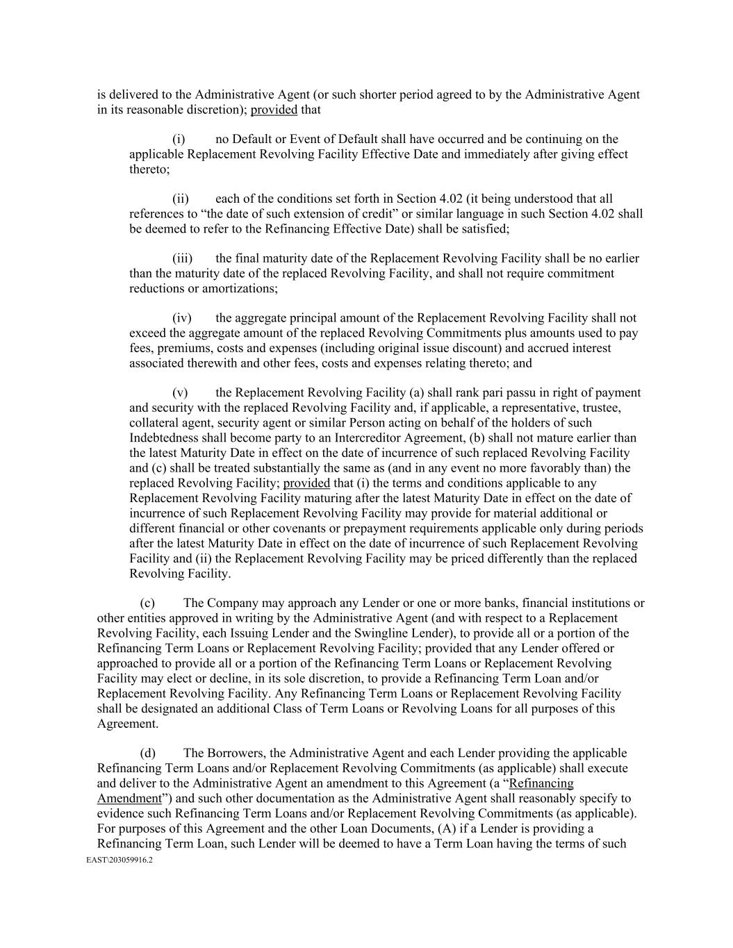 is delivered to the Administrative Agent (or such shorter period agreed to by the Administrative Agent in its reasonable discretion); provided that (i) no Default or Event of Default shall have occurred and be continuing on the applicable Replacement Revolving Facility Effective Date and immediately after giving effect thereto; (ii) each of the conditions set forth in Section 4.02 (it being understood that all references to “the date of such extension of credit” or similar language in such Section 4.02 shall be deemed to refer to the Refinancing Effective Date) shall be satisfied; (iii) the final maturity date of the Replacement Revolving Facility shall be no earlier than the maturity date of the replaced Revolving Facility, and shall not require commitment reductions or amortizations; (iv) the aggregate principal amount of the Replacement Revolving Facility shall not exceed the aggregate amount of the replaced Revolving Commitments plus amounts used to pay fees, premiums, costs and expenses (including original issue discount) and accrued interest associated therewith and other fees, costs and expenses relating thereto; and (v) the Replacement Revolving Facility (a) shall rank pari passu in right of payment and security with the replaced Revolving Facility and, if applicable, a representative, trustee, collateral agent, security agent or similar Person acting on behalf of the holders of such Indebtedness shall become party to an Intercreditor Agreement, (b) shall not mature earlier than the latest Maturity Date in effect on the date of incurrence of such replaced Revolving Facility and (c) shall be treated substantially the same as (and in any event no more favorably than) the replaced Revolving Facility; provided that (i) the terms and conditions applicable to any Replacement Revolving Facility maturing after the latest Maturity Date in effect on the date of incurrence of such Replacement Revolving Facility may provide for material additional or different financial or other covenants or prepayment requirements applicable only during periods after the latest Maturity Date in effect on the date of incurrence of such Replacement Revolving Facility and (ii) the Replacement Revolving Facility may be priced differently than the replaced Revolving Facility. (c) The Company may approach any Lender or one or more banks, financial institutions or other entities approved in writing by the Administrative Agent (and with respect to a Replacement Revolving Facility, each Issuing Lender and the Swingline Lender), to provide all or a portion of the Refinancing Term Loans or Replacement Revolving Facility; provided that any Lender offered or approached to provide all or a portion of the Refinancing Term Loans or Replacement Revolving Facility may elect or decline, in its sole discretion, to provide a Refinancing Term Loan and/or Replacement Revolving Facility. Any Refinancing Term Loans or Replacement Revolving Facility shall be designated an additional Class of Term Loans or Revolving Loans for all purposes of this Agreement. (d) The Borrowers, the Administrative Agent and each Lender providing the applicable Refinancing Term Loans and/or Replacement Revolving Commitments (as applicable) shall execute and deliver to the Administrative Agent an amendment to this Agreement (a “Refinancing Amendment”) and such other documentation as the Administrative Agent shall reasonably specify to evidence such Refinancing Term Loans and/or Replacement Revolving Commitments (as applicable). For purposes of this Agreement and the other Loan Documents, (A) if a Lender is providing a Refinancing Term Loan, such Lender will be deemed to have a Term Loan having the terms of such EAST\203059916.2