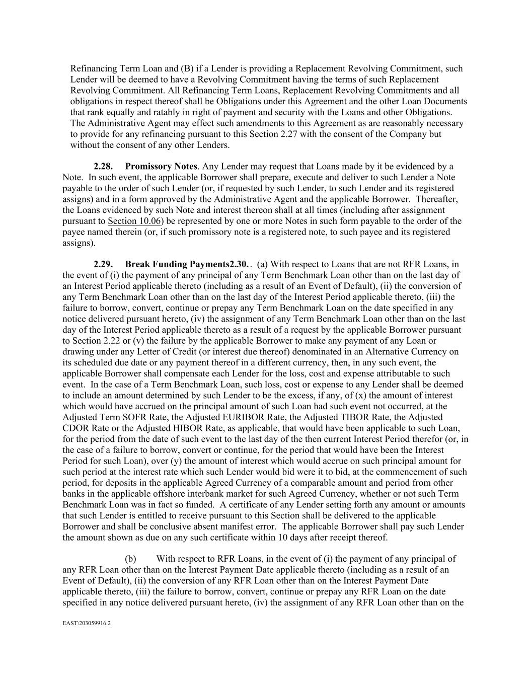 Refinancing Term Loan and (B) if a Lender is providing a Replacement Revolving Commitment, such Lender will be deemed to have a Revolving Commitment having the terms of such Replacement Revolving Commitment. All Refinancing Term Loans, Replacement Revolving Commitments and all obligations in respect thereof shall be Obligations under this Agreement and the other Loan Documents that rank equally and ratably in right of payment and security with the Loans and other Obligations. The Administrative Agent may effect such amendments to this Agreement as are reasonably necessary to provide for any refinancing pursuant to this Section 2.27 with the consent of the Company but without the consent of any other Lenders. 2.28. Promissory Notes. Any Lender may request that Loans made by it be evidenced by a Note. In such event, the applicable Borrower shall prepare, execute and deliver to such Lender a Note payable to the order of such Lender (or, if requested by such Lender, to such Lender and its registered assigns) and in a form approved by the Administrative Agent and the applicable Borrower. Thereafter, the Loans evidenced by such Note and interest thereon shall at all times (including after assignment pursuant to Section 10.06) be represented by one or more Notes in such form payable to the order of the payee named therein (or, if such promissory note is a registered note, to such payee and its registered assigns). 2.29. Break Funding Payments2.30. . (a) With respect to Loans that are not RFR Loans, in the event of (i) the payment of any principal of any Term Benchmark Loan other than on the last day of an Interest Period applicable thereto (including as a result of an Event of Default), (ii) the conversion of any Term Benchmark Loan other than on the last day of the Interest Period applicable thereto, (iii) the failure to borrow, convert, continue or prepay any Term Benchmark Loan on the date specified in any notice delivered pursuant hereto, (iv) the assignment of any Term Benchmark Loan other than on the last day of the Interest Period applicable thereto as a result of a request by the applicable Borrower pursuant to Section 2.22 or (v) the failure by the applicable Borrower to make any payment of any Loan or drawing under any Letter of Credit (or interest due thereof) denominated in an Alternative Currency on its scheduled due date or any payment thereof in a different currency, then, in any such event, the applicable Borrower shall compensate each Lender for the loss, cost and expense attributable to such event. In the case of a Term Benchmark Loan, such loss, cost or expense to any Lender shall be deemed to include an amount determined by such Lender to be the excess, if any, of (x) the amount of interest which would have accrued on the principal amount of such Loan had such event not occurred, at the Adjusted Term SOFR Rate, the Adjusted EURIBOR Rate, the Adjusted TIBOR Rate, the Adjusted CDOR Rate or the Adjusted HIBOR Rate, as applicable, that would have been applicable to such Loan, for the period from the date of such event to the last day of the then current Interest Period therefor (or, in the case of a failure to borrow, convert or continue, for the period that would have been the Interest Period for such Loan), over (y) the amount of interest which would accrue on such principal amount for such period at the interest rate which such Lender would bid were it to bid, at the commencement of such period, for deposits in the applicable Agreed Currency of a comparable amount and period from other banks in the applicable offshore interbank market for such Agreed Currency, whether or not such Term Benchmark Loan was in fact so funded. A certificate of any Lender setting forth any amount or amounts that such Lender is entitled to receive pursuant to this Section shall be delivered to the applicable Borrower and shall be conclusive absent manifest error. The applicable Borrower shall pay such Lender the amount shown as due on any such certificate within 10 days after receipt thereof. (b) With respect to RFR Loans, in the event of (i) the payment of any principal of any RFR Loan other than on the Interest Payment Date applicable thereto (including as a result of an Event of Default), (ii) the conversion of any RFR Loan other than on the Interest Payment Date applicable thereto, (iii) the failure to borrow, convert, continue or prepay any RFR Loan on the date specified in any notice delivered pursuant hereto, (iv) the assignment of any RFR Loan other than on the EAST\203059916.2