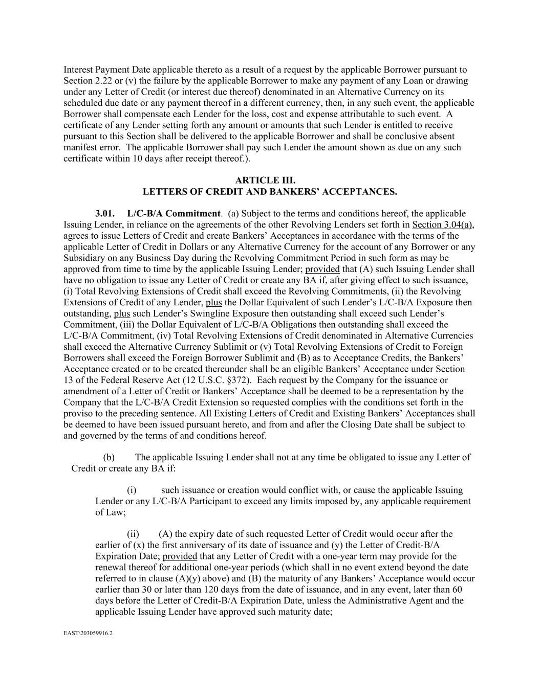 Interest Payment Date applicable thereto as a result of a request by the applicable Borrower pursuant to Section 2.22 or (v) the failure by the applicable Borrower to make any payment of any Loan or drawing under any Letter of Credit (or interest due thereof) denominated in an Alternative Currency on its scheduled due date or any payment thereof in a different currency, then, in any such event, the applicable Borrower shall compensate each Lender for the loss, cost and expense attributable to such event. A certificate of any Lender setting forth any amount or amounts that such Lender is entitled to receive pursuant to this Section shall be delivered to the applicable Borrower and shall be conclusive absent manifest error. The applicable Borrower shall pay such Lender the amount shown as due on any such certificate within 10 days after receipt thereof.). ARTICLE III. LETTERS OF CREDIT AND BANKERS’ ACCEPTANCES. 3.01. L/C-B/A Commitment. (a) Subject to the terms and conditions hereof, the applicable Issuing Lender, in reliance on the agreements of the other Revolving Lenders set forth in Section 3.04(a), agrees to issue Letters of Credit and create Bankers’ Acceptances in accordance with the terms of the applicable Letter of Credit in Dollars or any Alternative Currency for the account of any Borrower or any Subsidiary on any Business Day during the Revolving Commitment Period in such form as may be approved from time to time by the applicable Issuing Lender; provided that (A) such Issuing Lender shall have no obligation to issue any Letter of Credit or create any BA if, after giving effect to such issuance, (i) Total Revolving Extensions of Credit shall exceed the Revolving Commitments, (ii) the Revolving Extensions of Credit of any Lender, plus the Dollar Equivalent of such Lender’s L/C-B/A Exposure then outstanding, plus such Lender’s Swingline Exposure then outstanding shall exceed such Lender’s Commitment, (iii) the Dollar Equivalent of L/C-B/A Obligations then outstanding shall exceed the L/C-B/A Commitment, (iv) Total Revolving Extensions of Credit denominated in Alternative Currencies shall exceed the Alternative Currency Sublimit or (v) Total Revolving Extensions of Credit to Foreign Borrowers shall exceed the Foreign Borrower Sublimit and (B) as to Acceptance Credits, the Bankers’ Acceptance created or to be created thereunder shall be an eligible Bankers’ Acceptance under Section 13 of the Federal Reserve Act (12 U.S.C. §372). Each request by the Company for the issuance or amendment of a Letter of Credit or Bankers’ Acceptance shall be deemed to be a representation by the Company that the L/C-B/A Credit Extension so requested complies with the conditions set forth in the proviso to the preceding sentence. All Existing Letters of Credit and Existing Bankers’ Acceptances shall be deemed to have been issued pursuant hereto, and from and after the Closing Date shall be subject to and governed by the terms of and conditions hereof. (b) The applicable Issuing Lender shall not at any time be obligated to issue any Letter of Credit or create any BA if: (i) such issuance or creation would conflict with, or cause the applicable Issuing Lender or any L/C-B/A Participant to exceed any limits imposed by, any applicable requirement of Law; (ii) (A) the expiry date of such requested Letter of Credit would occur after the earlier of (x) the first anniversary of its date of issuance and (y) the Letter of Credit-B/A Expiration Date; provided that any Letter of Credit with a one-year term may provide for the renewal thereof for additional one-year periods (which shall in no event extend beyond the date referred to in clause (A)(y) above) and (B) the maturity of any Bankers’ Acceptance would occur earlier than 30 or later than 120 days from the date of issuance, and in any event, later than 60 days before the Letter of Credit-B/A Expiration Date, unless the Administrative Agent and the applicable Issuing Lender have approved such maturity date; EAST\203059916.2