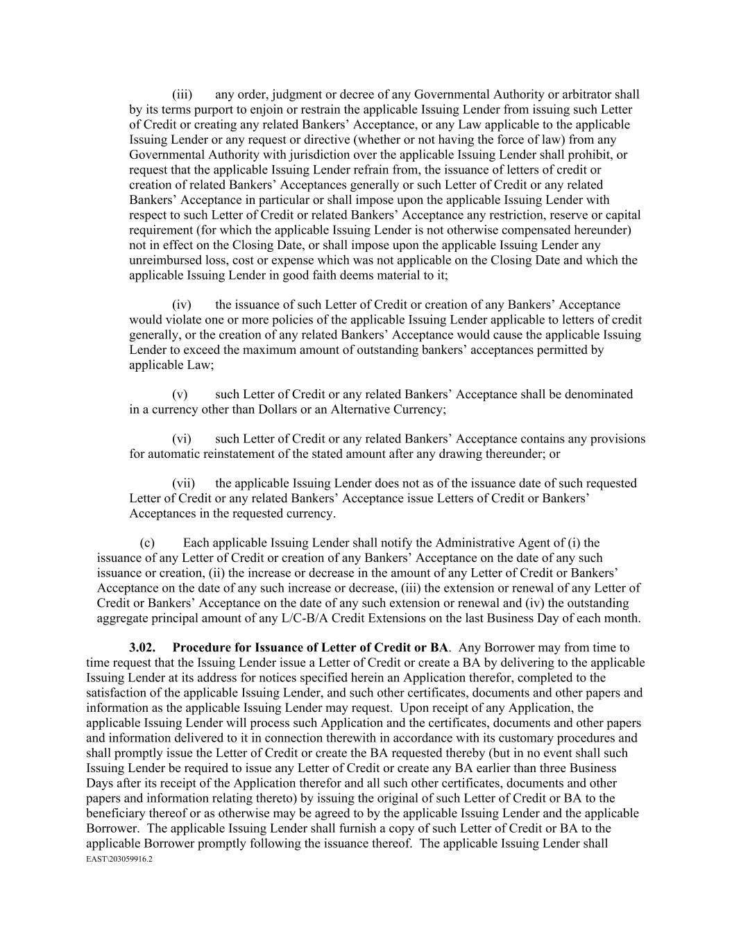 (iii) any order, judgment or decree of any Governmental Authority or arbitrator shall by its terms purport to enjoin or restrain the applicable Issuing Lender from issuing such Letter of Credit or creating any related Bankers’ Acceptance, or any Law applicable to the applicable Issuing Lender or any request or directive (whether or not having the force of law) from any Governmental Authority with jurisdiction over the applicable Issuing Lender shall prohibit, or request that the applicable Issuing Lender refrain from, the issuance of letters of credit or creation of related Bankers’ Acceptances generally or such Letter of Credit or any related Bankers’ Acceptance in particular or shall impose upon the applicable Issuing Lender with respect to such Letter of Credit or related Bankers’ Acceptance any restriction, reserve or capital requirement (for which the applicable Issuing Lender is not otherwise compensated hereunder) not in effect on the Closing Date, or shall impose upon the applicable Issuing Lender any unreimbursed loss, cost or expense which was not applicable on the Closing Date and which the applicable Issuing Lender in good faith deems material to it; (iv) the issuance of such Letter of Credit or creation of any Bankers’ Acceptance would violate one or more policies of the applicable Issuing Lender applicable to letters of credit generally, or the creation of any related Bankers’ Acceptance would cause the applicable Issuing Lender to exceed the maximum amount of outstanding bankers’ acceptances permitted by applicable Law; (v) such Letter of Credit or any related Bankers’ Acceptance shall be denominated in a currency other than Dollars or an Alternative Currency; (vi) such Letter of Credit or any related Bankers’ Acceptance contains any provisions for automatic reinstatement of the stated amount after any drawing thereunder; or (vii) the applicable Issuing Lender does not as of the issuance date of such requested Letter of Credit or any related Bankers’ Acceptance issue Letters of Credit or Bankers’ Acceptances in the requested currency. (c) Each applicable Issuing Lender shall notify the Administrative Agent of (i) the issuance of any Letter of Credit or creation of any Bankers’ Acceptance on the date of any such issuance or creation, (ii) the increase or decrease in the amount of any Letter of Credit or Bankers’ Acceptance on the date of any such increase or decrease, (iii) the extension or renewal of any Letter of Credit or Bankers’ Acceptance on the date of any such extension or renewal and (iv) the outstanding aggregate principal amount of any L/C-B/A Credit Extensions on the last Business Day of each month. 3.02. Procedure for Issuance of Letter of Credit or BA. Any Borrower may from time to time request that the Issuing Lender issue a Letter of Credit or create a BA by delivering to the applicable Issuing Lender at its address for notices specified herein an Application therefor, completed to the satisfaction of the applicable Issuing Lender, and such other certificates, documents and other papers and information as the applicable Issuing Lender may request. Upon receipt of any Application, the applicable Issuing Lender will process such Application and the certificates, documents and other papers and information delivered to it in connection therewith in accordance with its customary procedures and shall promptly issue the Letter of Credit or create the BA requested thereby (but in no event shall such Issuing Lender be required to issue any Letter of Credit or create any BA earlier than three Business Days after its receipt of the Application therefor and all such other certificates, documents and other papers and information relating thereto) by issuing the original of such Letter of Credit or BA to the beneficiary thereof or as otherwise may be agreed to by the applicable Issuing Lender and the applicable Borrower. The applicable Issuing Lender shall furnish a copy of such Letter of Credit or BA to the applicable Borrower promptly following the issuance thereof. The applicable Issuing Lender shall EAST\203059916.2