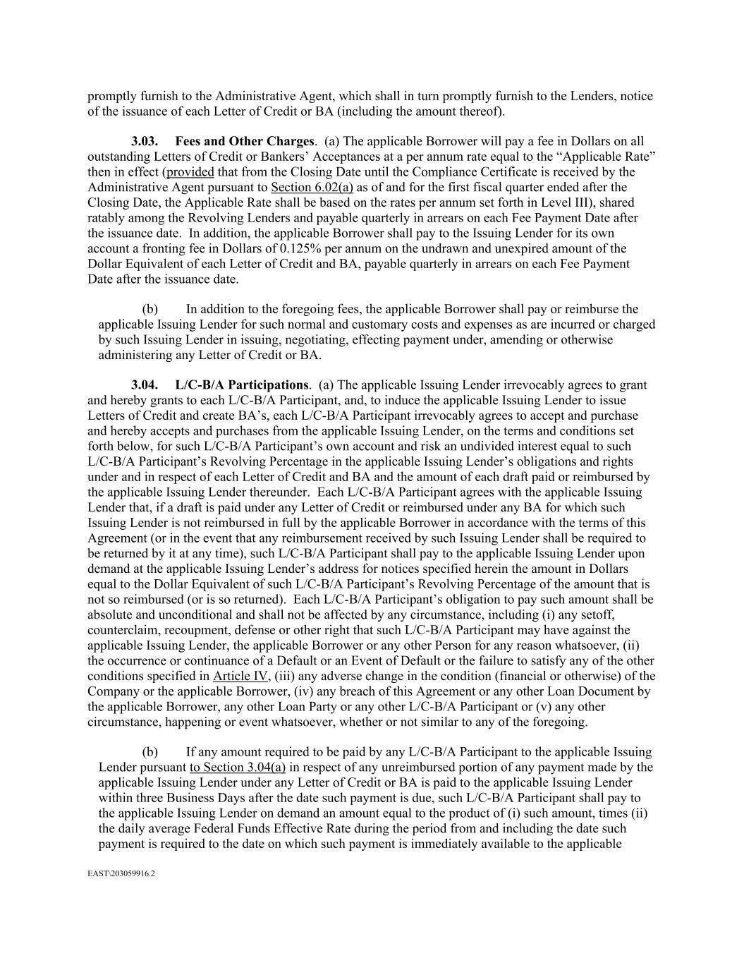 promptly furnish to the Administrative Agent, which shall in turn promptly furnish to the Lenders, notice of the issuance of each Letter of Credit or BA (including the amount thereof). 3.03. Fees and Other Charges. (a) The applicable Borrower will pay a fee in Dollars on all outstanding Letters of Credit or Bankers’ Acceptances at a per annum rate equal to the “Applicable Rate” then in effect (provided that from the Closing Date until the Compliance Certificate is received by the Administrative Agent pursuant to Section 6.02(a) as of and for the first fiscal quarter ended after the Closing Date, the Applicable Rate shall be based on the rates per annum set forth in Level III), shared ratably among the Revolving Lenders and payable quarterly in arrears on each Fee Payment Date after the issuance date. In addition, the applicable Borrower shall pay to the Issuing Lender for its own account a fronting fee in Dollars of 0.125% per annum on the undrawn and unexpired amount of the Dollar Equivalent of each Letter of Credit and BA, payable quarterly in arrears on each Fee Payment Date after the issuance date. (b) In addition to the foregoing fees, the applicable Borrower shall pay or reimburse the applicable Issuing Lender for such normal and customary costs and expenses as are incurred or charged by such Issuing Lender in issuing, negotiating, effecting payment under, amending or otherwise administering any Letter of Credit or BA. 3.04. L/C-B/A Participations. (a) The applicable Issuing Lender irrevocably agrees to grant and hereby grants to each L/C-B/A Participant, and, to induce the applicable Issuing Lender to issue Letters of Credit and create BA’s, each L/C-B/A Participant irrevocably agrees to accept and purchase and hereby accepts and purchases from the applicable Issuing Lender, on the terms and conditions set forth below, for such L/C-B/A Participant’s own account and risk an undivided interest equal to such L/C-B/A Participant’s Revolving Percentage in the applicable Issuing Lender’s obligations and rights under and in respect of each Letter of Credit and BA and the amount of each draft paid or reimbursed by the applicable Issuing Lender thereunder. Each L/C-B/A Participant agrees with the applicable Issuing Lender that, if a draft is paid under any Letter of Credit or reimbursed under any BA for which such Issuing Lender is not reimbursed in full by the applicable Borrower in accordance with the terms of this Agreement (or in the event that any reimbursement received by such Issuing Lender shall be required to be returned by it at any time), such L/C-B/A Participant shall pay to the applicable Issuing Lender upon demand at the applicable Issuing Lender’s address for notices specified herein the amount in Dollars equal to the Dollar Equivalent of such L/C-B/A Participant’s Revolving Percentage of the amount that is not so reimbursed (or is so returned). Each L/C-B/A Participant’s obligation to pay such amount shall be absolute and unconditional and shall not be affected by any circumstance, including (i) any setoff, counterclaim, recoupment, defense or other right that such L/C-B/A Participant may have against the applicable Issuing Lender, the applicable Borrower or any other Person for any reason whatsoever, (ii) the occurrence or continuance of a Default or an Event of Default or the failure to satisfy any of the other conditions specified in Article IV, (iii) any adverse change in the condition (financial or otherwise) of the Company or the applicable Borrower, (iv) any breach of this Agreement or any other Loan Document by the applicable Borrower, any other Loan Party or any other L/C-B/A Participant or (v) any other circumstance, happening or event whatsoever, whether or not similar to any of the foregoing. (b) If any amount required to be paid by any L/C-B/A Participant to the applicable Issuing Lender pursuant to Section 3.04(a) in respect of any unreimbursed portion of any payment made by the applicable Issuing Lender under any Letter of Credit or BA is paid to the applicable Issuing Lender within three Business Days after the date such payment is due, such L/C-B/A Participant shall pay to the applicable Issuing Lender on demand an amount equal to the product of (i) such amount, times (ii) the daily average Federal Funds Effective Rate during the period from and including the date such payment is required to the date on which such payment is immediately available to the applicable EAST\203059916.2