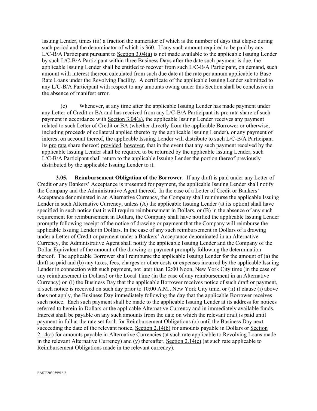 Issuing Lender, times (iii) a fraction the numerator of which is the number of days that elapse during such period and the denominator of which is 360. If any such amount required to be paid by any L/C-B/A Participant pursuant to Section 3.04(a) is not made available to the applicable Issuing Lender by such L/C-B/A Participant within three Business Days after the date such payment is due, the applicable Issuing Lender shall be entitled to recover from such L/C-B/A Participant, on demand, such amount with interest thereon calculated from such due date at the rate per annum applicable to Base Rate Loans under the Revolving Facility. A certificate of the applicable Issuing Lender submitted to any L/C-B/A Participant with respect to any amounts owing under this Section shall be conclusive in the absence of manifest error. (c) Whenever, at any time after the applicable Issuing Lender has made payment under any Letter of Credit or BA and has received from any L/C-B/A Participant its pro rata share of such payment in accordance with Section 3.04(a), the applicable Issuing Lender receives any payment related to such Letter of Credit or BA (whether directly from the applicable Borrower or otherwise, including proceeds of collateral applied thereto by the applicable Issuing Lender), or any payment of interest on account thereof, the applicable Issuing Lender will distribute to such L/C-B/A Participant its pro rata share thereof; provided, however, that in the event that any such payment received by the applicable Issuing Lender shall be required to be returned by the applicable Issuing Lender, such L/C-B/A Participant shall return to the applicable Issuing Lender the portion thereof previously distributed by the applicable Issuing Lender to it. 3.05. Reimbursement Obligation of the Borrower. If any draft is paid under any Letter of Credit or any Bankers’ Acceptance is presented for payment, the applicable Issuing Lender shall notify the Company and the Administrative Agent thereof. In the case of a Letter of Credit or Bankers’ Acceptance denominated in an Alternative Currency, the Company shall reimburse the applicable Issuing Lender in such Alternative Currency, unless (A) the applicable Issuing Lender (at its option) shall have specified in such notice that it will require reimbursement in Dollars, or (B) in the absence of any such requirement for reimbursement in Dollars, the Company shall have notified the applicable Issuing Lender promptly following receipt of the notice of drawing or payment that the Company will reimburse the applicable Issuing Lender in Dollars. In the case of any such reimbursement in Dollars of a drawing under a Letter of Credit or payment under a Bankers’ Acceptance denominated in an Alternative Currency, the Administrative Agent shall notify the applicable Issuing Lender and the Company of the Dollar Equivalent of the amount of the drawing or payment promptly following the determination thereof. The applicable Borrower shall reimburse the applicable Issuing Lender for the amount of (a) the draft so paid and (b) any taxes, fees, charges or other costs or expenses incurred by the applicable Issuing Lender in connection with such payment, not later than 12:00 Noon, New York City time (in the case of any reimbursement in Dollars) or the Local Time (in the case of any reimbursement in an Alternative Currency) on (i) the Business Day that the applicable Borrower receives notice of such draft or payment, if such notice is received on such day prior to 10:00 A.M., New York City time, or (ii) if clause (i) above does not apply, the Business Day immediately following the day that the applicable Borrower receives such notice. Each such payment shall be made to the applicable Issuing Lender at its address for notices referred to herein in Dollars or the applicable Alternative Currency and in immediately available funds. Interest shall be payable on any such amounts from the date on which the relevant draft is paid until payment in full at the rate set forth for Reimbursement Obligations (x) until the Business Day next succeeding the date of the relevant notice, Section 2.14(b) for amounts payable in Dollars or Section 2.14(a) for amounts payable in Alternative Currencies (at such rate applicable to Revolving Loans made in the relevant Alternative Currency) and (y) thereafter, Section 2.14(c) (at such rate applicable to Reimbursement Obligations made in the relevant currency). EAST\203059916.2