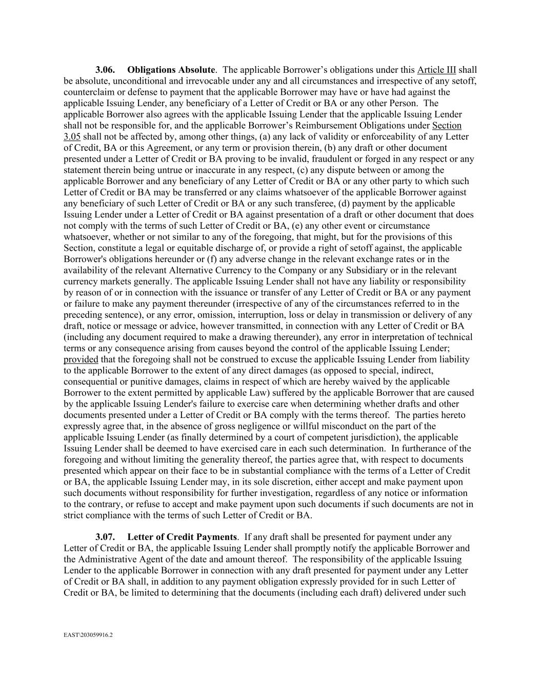 3.06. Obligations Absolute. The applicable Borrower’s obligations under this Article III shall be absolute, unconditional and irrevocable under any and all circumstances and irrespective of any setoff, counterclaim or defense to payment that the applicable Borrower may have or have had against the applicable Issuing Lender, any beneficiary of a Letter of Credit or BA or any other Person. The applicable Borrower also agrees with the applicable Issuing Lender that the applicable Issuing Lender shall not be responsible for, and the applicable Borrower’s Reimbursement Obligations under Section 3.05 shall not be affected by, among other things, (a) any lack of validity or enforceability of any Letter of Credit, BA or this Agreement, or any term or provision therein, (b) any draft or other document presented under a Letter of Credit or BA proving to be invalid, fraudulent or forged in any respect or any statement therein being untrue or inaccurate in any respect, (c) any dispute between or among the applicable Borrower and any beneficiary of any Letter of Credit or BA or any other party to which such Letter of Credit or BA may be transferred or any claims whatsoever of the applicable Borrower against any beneficiary of such Letter of Credit or BA or any such transferee, (d) payment by the applicable Issuing Lender under a Letter of Credit or BA against presentation of a draft or other document that does not comply with the terms of such Letter of Credit or BA, (e) any other event or circumstance whatsoever, whether or not similar to any of the foregoing, that might, but for the provisions of this Section, constitute a legal or equitable discharge of, or provide a right of setoff against, the applicable Borrower's obligations hereunder or (f) any adverse change in the relevant exchange rates or in the availability of the relevant Alternative Currency to the Company or any Subsidiary or in the relevant currency markets generally. The applicable Issuing Lender shall not have any liability or responsibility by reason of or in connection with the issuance or transfer of any Letter of Credit or BA or any payment or failure to make any payment thereunder (irrespective of any of the circumstances referred to in the preceding sentence), or any error, omission, interruption, loss or delay in transmission or delivery of any draft, notice or message or advice, however transmitted, in connection with any Letter of Credit or BA (including any document required to make a drawing thereunder), any error in interpretation of technical terms or any consequence arising from causes beyond the control of the applicable Issuing Lender; provided that the foregoing shall not be construed to excuse the applicable Issuing Lender from liability to the applicable Borrower to the extent of any direct damages (as opposed to special, indirect, consequential or punitive damages, claims in respect of which are hereby waived by the applicable Borrower to the extent permitted by applicable Law) suffered by the applicable Borrower that are caused by the applicable Issuing Lender's failure to exercise care when determining whether drafts and other documents presented under a Letter of Credit or BA comply with the terms thereof. The parties hereto expressly agree that, in the absence of gross negligence or willful misconduct on the part of the applicable Issuing Lender (as finally determined by a court of competent jurisdiction), the applicable Issuing Lender shall be deemed to have exercised care in each such determination. In furtherance of the foregoing and without limiting the generality thereof, the parties agree that, with respect to documents presented which appear on their face to be in substantial compliance with the terms of a Letter of Credit or BA, the applicable Issuing Lender may, in its sole discretion, either accept and make payment upon such documents without responsibility for further investigation, regardless of any notice or information to the contrary, or refuse to accept and make payment upon such documents if such documents are not in strict compliance with the terms of such Letter of Credit or BA. 3.07. Letter of Credit Payments. If any draft shall be presented for payment under any Letter of Credit or BA, the applicable Issuing Lender shall promptly notify the applicable Borrower and the Administrative Agent of the date and amount thereof. The responsibility of the applicable Issuing Lender to the applicable Borrower in connection with any draft presented for payment under any Letter of Credit or BA shall, in addition to any payment obligation expressly provided for in such Letter of Credit or BA, be limited to determining that the documents (including each draft) delivered under such EAST\203059916.2