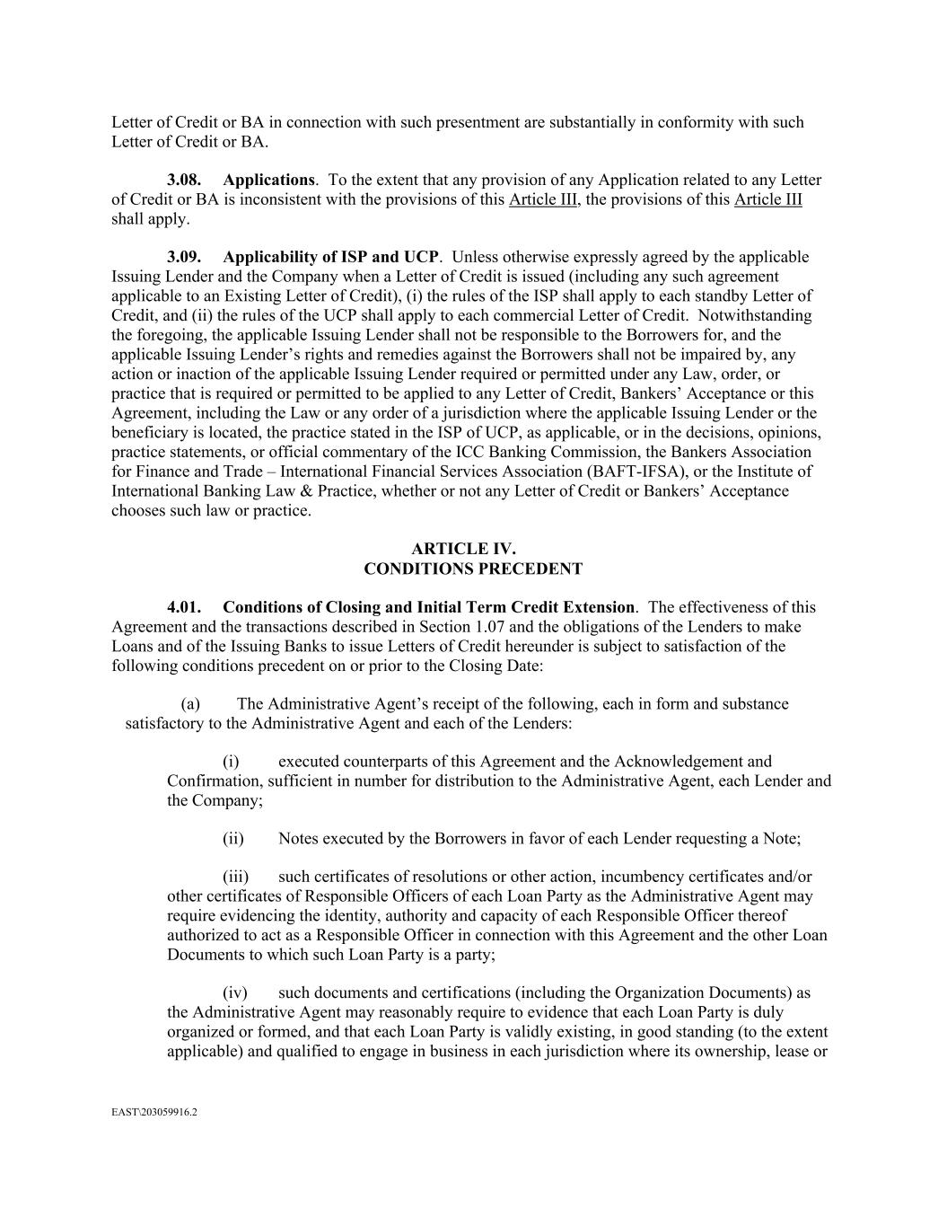 Letter of Credit or BA in connection with such presentment are substantially in conformity with such Letter of Credit or BA. 3.08. Applications. To the extent that any provision of any Application related to any Letter of Credit or BA is inconsistent with the provisions of this Article III, the provisions of this Article III shall apply. 3.09. Applicability of ISP and UCP. Unless otherwise expressly agreed by the applicable Issuing Lender and the Company when a Letter of Credit is issued (including any such agreement applicable to an Existing Letter of Credit), (i) the rules of the ISP shall apply to each standby Letter of Credit, and (ii) the rules of the UCP shall apply to each commercial Letter of Credit. Notwithstanding the foregoing, the applicable Issuing Lender shall not be responsible to the Borrowers for, and the applicable Issuing Lender’s rights and remedies against the Borrowers shall not be impaired by, any action or inaction of the applicable Issuing Lender required or permitted under any Law, order, or practice that is required or permitted to be applied to any Letter of Credit, Bankers’ Acceptance or this Agreement, including the Law or any order of a jurisdiction where the applicable Issuing Lender or the beneficiary is located, the practice stated in the ISP of UCP, as applicable, or in the decisions, opinions, practice statements, or official commentary of the ICC Banking Commission, the Bankers Association for Finance and Trade – International Financial Services Association (BAFT-IFSA), or the Institute of International Banking Law & Practice, whether or not any Letter of Credit or Bankers’ Acceptance chooses such law or practice. ARTICLE IV. CONDITIONS PRECEDENT 4.01. Conditions of Closing and Initial Term Credit Extension. The effectiveness of this Agreement and the transactions described in Section 1.07 and the obligations of the Lenders to make Loans and of the Issuing Banks to issue Letters of Credit hereunder is subject to satisfaction of the following conditions precedent on or prior to the Closing Date: (a) The Administrative Agent’s receipt of the following, each in form and substance satisfactory to the Administrative Agent and each of the Lenders: (i) executed counterparts of this Agreement and the Acknowledgement and Confirmation, sufficient in number for distribution to the Administrative Agent, each Lender and the Company; (ii) Notes executed by the Borrowers in favor of each Lender requesting a Note; (iii) such certificates of resolutions or other action, incumbency certificates and/or other certificates of Responsible Officers of each Loan Party as the Administrative Agent may require evidencing the identity, authority and capacity of each Responsible Officer thereof authorized to act as a Responsible Officer in connection with this Agreement and the other Loan Documents to which such Loan Party is a party; (iv) such documents and certifications (including the Organization Documents) as the Administrative Agent may reasonably require to evidence that each Loan Party is duly organized or formed, and that each Loan Party is validly existing, in good standing (to the extent applicable) and qualified to engage in business in each jurisdiction where its ownership, lease or EAST\203059916.2
