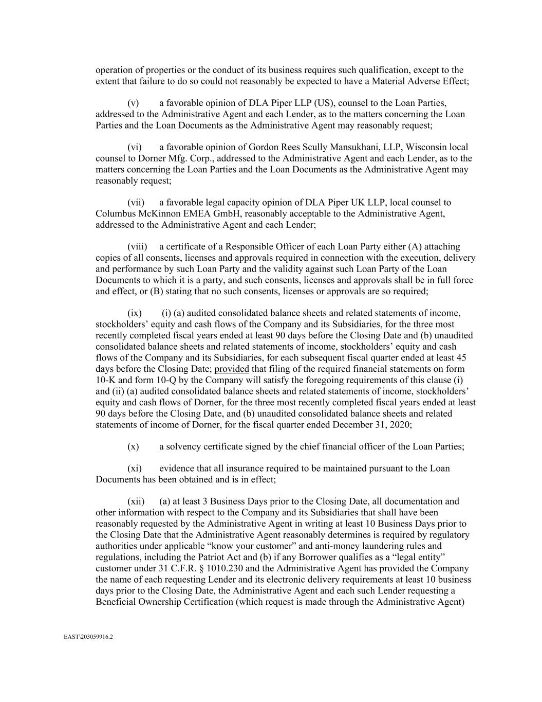 operation of properties or the conduct of its business requires such qualification, except to the extent that failure to do so could not reasonably be expected to have a Material Adverse Effect; (v) a favorable opinion of DLA Piper LLP (US), counsel to the Loan Parties, addressed to the Administrative Agent and each Lender, as to the matters concerning the Loan Parties and the Loan Documents as the Administrative Agent may reasonably request; (vi) a favorable opinion of Gordon Rees Scully Mansukhani, LLP, Wisconsin local counsel to Dorner Mfg. Corp., addressed to the Administrative Agent and each Lender, as to the matters concerning the Loan Parties and the Loan Documents as the Administrative Agent may reasonably request; (vii) a favorable legal capacity opinion of DLA Piper UK LLP, local counsel to Columbus McKinnon EMEA GmbH, reasonably acceptable to the Administrative Agent, addressed to the Administrative Agent and each Lender; (viii) a certificate of a Responsible Officer of each Loan Party either (A) attaching copies of all consents, licenses and approvals required in connection with the execution, delivery and performance by such Loan Party and the validity against such Loan Party of the Loan Documents to which it is a party, and such consents, licenses and approvals shall be in full force and effect, or (B) stating that no such consents, licenses or approvals are so required; (ix) (i) (a) audited consolidated balance sheets and related statements of income, stockholders’ equity and cash flows of the Company and its Subsidiaries, for the three most recently completed fiscal years ended at least 90 days before the Closing Date and (b) unaudited consolidated balance sheets and related statements of income, stockholders’ equity and cash flows of the Company and its Subsidiaries, for each subsequent fiscal quarter ended at least 45 days before the Closing Date; provided that filing of the required financial statements on form 10-K and form 10-Q by the Company will satisfy the foregoing requirements of this clause (i) and (ii) (a) audited consolidated balance sheets and related statements of income, stockholders’ equity and cash flows of Dorner, for the three most recently completed fiscal years ended at least 90 days before the Closing Date, and (b) unaudited consolidated balance sheets and related statements of income of Dorner, for the fiscal quarter ended December 31, 2020; (x) a solvency certificate signed by the chief financial officer of the Loan Parties; (xi) evidence that all insurance required to be maintained pursuant to the Loan Documents has been obtained and is in effect; (xii) (a) at least 3 Business Days prior to the Closing Date, all documentation and other information with respect to the Company and its Subsidiaries that shall have been reasonably requested by the Administrative Agent in writing at least 10 Business Days prior to the Closing Date that the Administrative Agent reasonably determines is required by regulatory authorities under applicable “know your customer” and anti-money laundering rules and regulations, including the Patriot Act and (b) if any Borrower qualifies as a “legal entity” customer under 31 C.F.R. § 1010.230 and the Administrative Agent has provided the Company the name of each requesting Lender and its electronic delivery requirements at least 10 business days prior to the Closing Date, the Administrative Agent and each such Lender requesting a Beneficial Ownership Certification (which request is made through the Administrative Agent) EAST\203059916.2