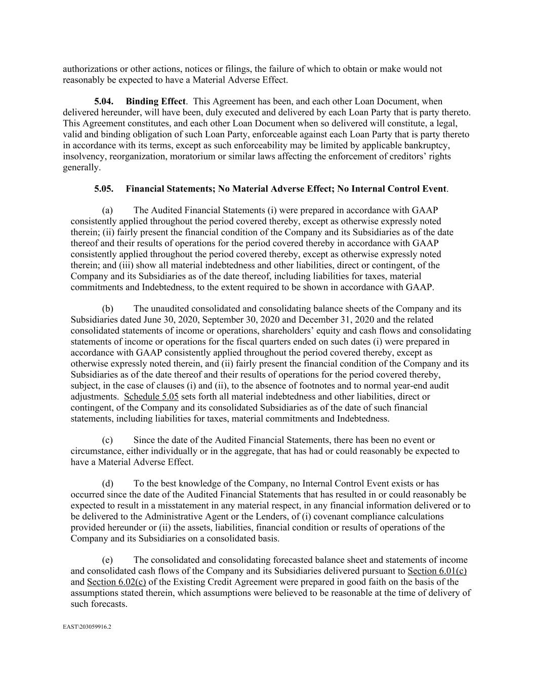 authorizations or other actions, notices or filings, the failure of which to obtain or make would not reasonably be expected to have a Material Adverse Effect. 5.04. Binding Effect. This Agreement has been, and each other Loan Document, when delivered hereunder, will have been, duly executed and delivered by each Loan Party that is party thereto. This Agreement constitutes, and each other Loan Document when so delivered will constitute, a legal, valid and binding obligation of such Loan Party, enforceable against each Loan Party that is party thereto in accordance with its terms, except as such enforceability may be limited by applicable bankruptcy, insolvency, reorganization, moratorium or similar laws affecting the enforcement of creditors’ rights generally. 5.05. Financial Statements; No Material Adverse Effect; No Internal Control Event. (a) The Audited Financial Statements (i) were prepared in accordance with GAAP consistently applied throughout the period covered thereby, except as otherwise expressly noted therein; (ii) fairly present the financial condition of the Company and its Subsidiaries as of the date thereof and their results of operations for the period covered thereby in accordance with GAAP consistently applied throughout the period covered thereby, except as otherwise expressly noted therein; and (iii) show all material indebtedness and other liabilities, direct or contingent, of the Company and its Subsidiaries as of the date thereof, including liabilities for taxes, material commitments and Indebtedness, to the extent required to be shown in accordance with GAAP. (b) The unaudited consolidated and consolidating balance sheets of the Company and its Subsidiaries dated June 30, 2020, September 30, 2020 and December 31, 2020 and the related consolidated statements of income or operations, shareholders’ equity and cash flows and consolidating statements of income or operations for the fiscal quarters ended on such dates (i) were prepared in accordance with GAAP consistently applied throughout the period covered thereby, except as otherwise expressly noted therein, and (ii) fairly present the financial condition of the Company and its Subsidiaries as of the date thereof and their results of operations for the period covered thereby, subject, in the case of clauses (i) and (ii), to the absence of footnotes and to normal year-end audit adjustments. Schedule 5.05 sets forth all material indebtedness and other liabilities, direct or contingent, of the Company and its consolidated Subsidiaries as of the date of such financial statements, including liabilities for taxes, material commitments and Indebtedness. (c) Since the date of the Audited Financial Statements, there has been no event or circumstance, either individually or in the aggregate, that has had or could reasonably be expected to have a Material Adverse Effect. (d) To the best knowledge of the Company, no Internal Control Event exists or has occurred since the date of the Audited Financial Statements that has resulted in or could reasonably be expected to result in a misstatement in any material respect, in any financial information delivered or to be delivered to the Administrative Agent or the Lenders, of (i) covenant compliance calculations provided hereunder or (ii) the assets, liabilities, financial condition or results of operations of the Company and its Subsidiaries on a consolidated basis. (e) The consolidated and consolidating forecasted balance sheet and statements of income and consolidated cash flows of the Company and its Subsidiaries delivered pursuant to Section 6.01(c) and Section 6.02(c) of the Existing Credit Agreement were prepared in good faith on the basis of the assumptions stated therein, which assumptions were believed to be reasonable at the time of delivery of such forecasts. EAST\203059916.2