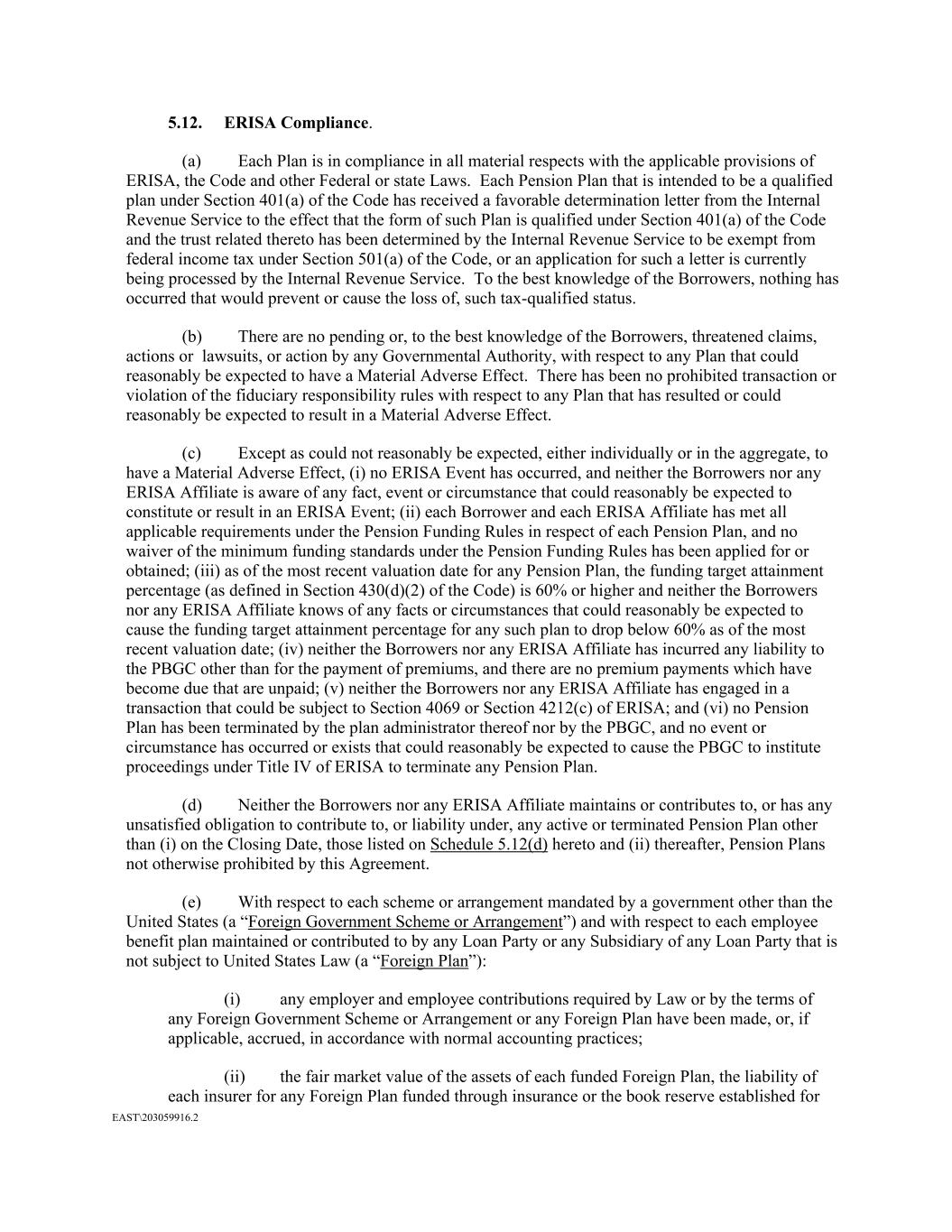 5.12. ERISA Compliance. (a) Each Plan is in compliance in all material respects with the applicable provisions of ERISA, the Code and other Federal or state Laws. Each Pension Plan that is intended to be a qualified plan under Section 401(a) of the Code has received a favorable determination letter from the Internal Revenue Service to the effect that the form of such Plan is qualified under Section 401(a) of the Code and the trust related thereto has been determined by the Internal Revenue Service to be exempt from federal income tax under Section 501(a) of the Code, or an application for such a letter is currently being processed by the Internal Revenue Service. To the best knowledge of the Borrowers, nothing has occurred that would prevent or cause the loss of, such tax-qualified status. (b) There are no pending or, to the best knowledge of the Borrowers, threatened claims, actions or lawsuits, or action by any Governmental Authority, with respect to any Plan that could reasonably be expected to have a Material Adverse Effect. There has been no prohibited transaction or violation of the fiduciary responsibility rules with respect to any Plan that has resulted or could reasonably be expected to result in a Material Adverse Effect. (c) Except as could not reasonably be expected, either individually or in the aggregate, to have a Material Adverse Effect, (i) no ERISA Event has occurred, and neither the Borrowers nor any ERISA Affiliate is aware of any fact, event or circumstance that could reasonably be expected to constitute or result in an ERISA Event; (ii) each Borrower and each ERISA Affiliate has met all applicable requirements under the Pension Funding Rules in respect of each Pension Plan, and no waiver of the minimum funding standards under the Pension Funding Rules has been applied for or obtained; (iii) as of the most recent valuation date for any Pension Plan, the funding target attainment percentage (as defined in Section 430(d)(2) of the Code) is 60% or higher and neither the Borrowers nor any ERISA Affiliate knows of any facts or circumstances that could reasonably be expected to cause the funding target attainment percentage for any such plan to drop below 60% as of the most recent valuation date; (iv) neither the Borrowers nor any ERISA Affiliate has incurred any liability to the PBGC other than for the payment of premiums, and there are no premium payments which have become due that are unpaid; (v) neither the Borrowers nor any ERISA Affiliate has engaged in a transaction that could be subject to Section 4069 or Section 4212(c) of ERISA; and (vi) no Pension Plan has been terminated by the plan administrator thereof nor by the PBGC, and no event or circumstance has occurred or exists that could reasonably be expected to cause the PBGC to institute proceedings under Title IV of ERISA to terminate any Pension Plan. (d) Neither the Borrowers nor any ERISA Affiliate maintains or contributes to, or has any unsatisfied obligation to contribute to, or liability under, any active or terminated Pension Plan other than (i) on the Closing Date, those listed on Schedule 5.12(d) hereto and (ii) thereafter, Pension Plans not otherwise prohibited by this Agreement. (e) With respect to each scheme or arrangement mandated by a government other than the United States (a “Foreign Government Scheme or Arrangement”) and with respect to each employee benefit plan maintained or contributed to by any Loan Party or any Subsidiary of any Loan Party that is not subject to United States Law (a “Foreign Plan”): (i) any employer and employee contributions required by Law or by the terms of any Foreign Government Scheme or Arrangement or any Foreign Plan have been made, or, if applicable, accrued, in accordance with normal accounting practices; (ii) the fair market value of the assets of each funded Foreign Plan, the liability of each insurer for any Foreign Plan funded through insurance or the book reserve established for EAST\203059916.2