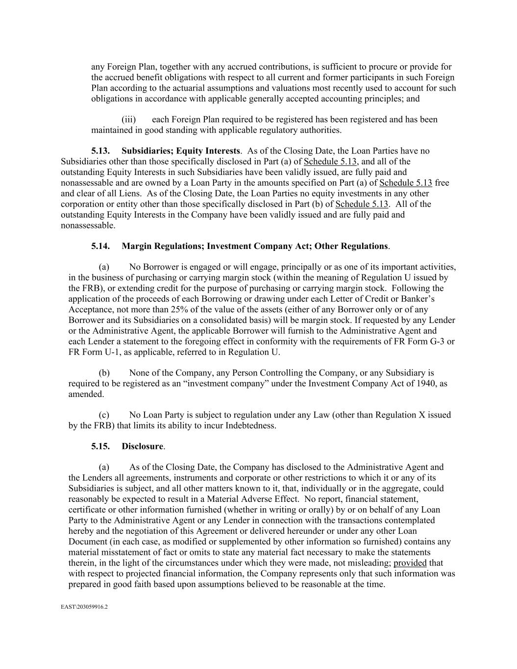 any Foreign Plan, together with any accrued contributions, is sufficient to procure or provide for the accrued benefit obligations with respect to all current and former participants in such Foreign Plan according to the actuarial assumptions and valuations most recently used to account for such obligations in accordance with applicable generally accepted accounting principles; and (iii) each Foreign Plan required to be registered has been registered and has been maintained in good standing with applicable regulatory authorities. 5.13. Subsidiaries; Equity Interests. As of the Closing Date, the Loan Parties have no Subsidiaries other than those specifically disclosed in Part (a) of Schedule 5.13, and all of the outstanding Equity Interests in such Subsidiaries have been validly issued, are fully paid and nonassessable and are owned by a Loan Party in the amounts specified on Part (a) of Schedule 5.13 free and clear of all Liens. As of the Closing Date, the Loan Parties no equity investments in any other corporation or entity other than those specifically disclosed in Part (b) of Schedule 5.13. All of the outstanding Equity Interests in the Company have been validly issued and are fully paid and nonassessable. 5.14. Margin Regulations; Investment Company Act; Other Regulations. (a) No Borrower is engaged or will engage, principally or as one of its important activities, in the business of purchasing or carrying margin stock (within the meaning of Regulation U issued by the FRB), or extending credit for the purpose of purchasing or carrying margin stock. Following the application of the proceeds of each Borrowing or drawing under each Letter of Credit or Banker’s Acceptance, not more than 25% of the value of the assets (either of any Borrower only or of any Borrower and its Subsidiaries on a consolidated basis) will be margin stock. If requested by any Lender or the Administrative Agent, the applicable Borrower will furnish to the Administrative Agent and each Lender a statement to the foregoing effect in conformity with the requirements of FR Form G-3 or FR Form U-1, as applicable, referred to in Regulation U. (b) None of the Company, any Person Controlling the Company, or any Subsidiary is required to be registered as an “investment company” under the Investment Company Act of 1940, as amended. (c) No Loan Party is subject to regulation under any Law (other than Regulation X issued by the FRB) that limits its ability to incur Indebtedness. 5.15. Disclosure. (a) As of the Closing Date, the Company has disclosed to the Administrative Agent and the Lenders all agreements, instruments and corporate or other restrictions to which it or any of its Subsidiaries is subject, and all other matters known to it, that, individually or in the aggregate, could reasonably be expected to result in a Material Adverse Effect. No report, financial statement, certificate or other information furnished (whether in writing or orally) by or on behalf of any Loan Party to the Administrative Agent or any Lender in connection with the transactions contemplated hereby and the negotiation of this Agreement or delivered hereunder or under any other Loan Document (in each case, as modified or supplemented by other information so furnished) contains any material misstatement of fact or omits to state any material fact necessary to make the statements therein, in the light of the circumstances under which they were made, not misleading; provided that with respect to projected financial information, the Company represents only that such information was prepared in good faith based upon assumptions believed to be reasonable at the time. EAST\203059916.2