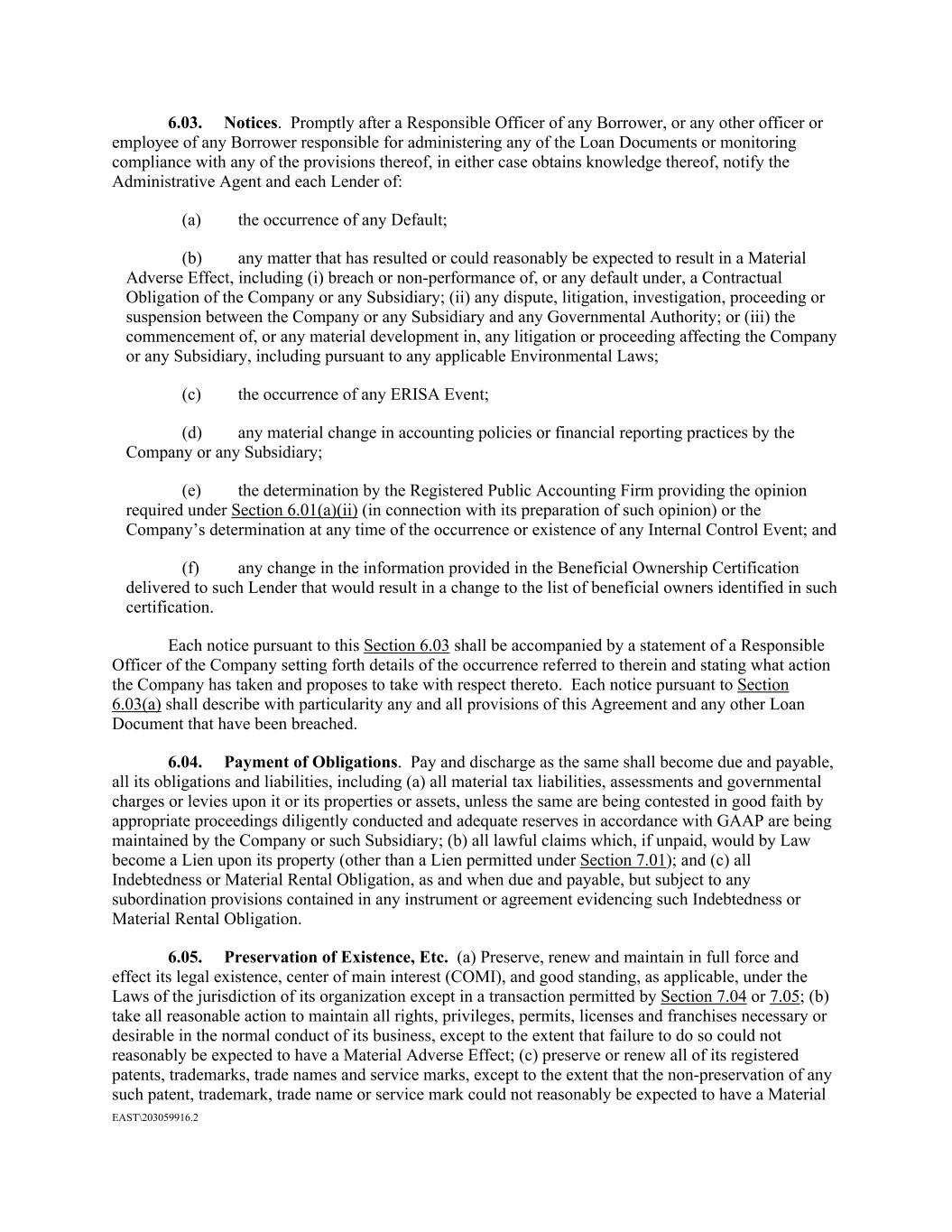 6.03. Notices. Promptly after a Responsible Officer of any Borrower, or any other officer or employee of any Borrower responsible for administering any of the Loan Documents or monitoring compliance with any of the provisions thereof, in either case obtains knowledge thereof, notify the Administrative Agent and each Lender of: (a) the occurrence of any Default; (b) any matter that has resulted or could reasonably be expected to result in a Material Adverse Effect, including (i) breach or non-performance of, or any default under, a Contractual Obligation of the Company or any Subsidiary; (ii) any dispute, litigation, investigation, proceeding or suspension between the Company or any Subsidiary and any Governmental Authority; or (iii) the commencement of, or any material development in, any litigation or proceeding affecting the Company or any Subsidiary, including pursuant to any applicable Environmental Laws; (c) the occurrence of any ERISA Event; (d) any material change in accounting policies or financial reporting practices by the Company or any Subsidiary; (e) the determination by the Registered Public Accounting Firm providing the opinion required under Section 6.01(a)(ii) (in connection with its preparation of such opinion) or the Company’s determination at any time of the occurrence or existence of any Internal Control Event; and (f) any change in the information provided in the Beneficial Ownership Certification delivered to such Lender that would result in a change to the list of beneficial owners identified in such certification. Each notice pursuant to this Section 6.03 shall be accompanied by a statement of a Responsible Officer of the Company setting forth details of the occurrence referred to therein and stating what action the Company has taken and proposes to take with respect thereto. Each notice pursuant to Section 6.03(a) shall describe with particularity any and all provisions of this Agreement and any other Loan Document that have been breached. 6.04. Payment of Obligations. Pay and discharge as the same shall become due and payable, all its obligations and liabilities, including (a) all material tax liabilities, assessments and governmental charges or levies upon it or its properties or assets, unless the same are being contested in good faith by appropriate proceedings diligently conducted and adequate reserves in accordance with GAAP are being maintained by the Company or such Subsidiary; (b) all lawful claims which, if unpaid, would by Law become a Lien upon its property (other than a Lien permitted under Section 7.01); and (c) all Indebtedness or Material Rental Obligation, as and when due and payable, but subject to any subordination provisions contained in any instrument or agreement evidencing such Indebtedness or Material Rental Obligation. 6.05. Preservation of Existence, Etc. (a) Preserve, renew and maintain in full force and effect its legal existence, center of main interest (COMI), and good standing, as applicable, under the Laws of the jurisdiction of its organization except in a transaction permitted by Section 7.04 or 7.05; (b) take all reasonable action to maintain all rights, privileges, permits, licenses and franchises necessary or desirable in the normal conduct of its business, except to the extent that failure to do so could not reasonably be expected to have a Material Adverse Effect; (c) preserve or renew all of its registered patents, trademarks, trade names and service marks, except to the extent that the non-preservation of any such patent, trademark, trade name or service mark could not reasonably be expected to have a Material EAST\203059916.2