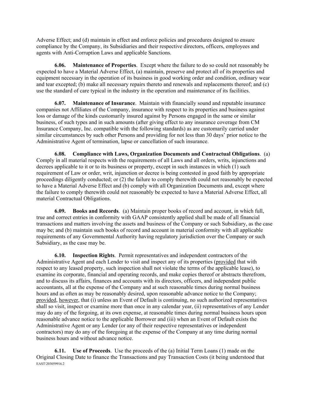 Adverse Effect; and (d) maintain in effect and enforce policies and procedures designed to ensure compliance by the Company, its Subsidiaries and their respective directors, officers, employees and agents with Anti-Corruption Laws and applicable Sanctions. 6.06. Maintenance of Properties. Except where the failure to do so could not reasonably be expected to have a Material Adverse Effect, (a) maintain, preserve and protect all of its properties and equipment necessary in the operation of its business in good working order and condition, ordinary wear and tear excepted; (b) make all necessary repairs thereto and renewals and replacements thereof; and (c) use the standard of care typical in the industry in the operation and maintenance of its facilities. 6.07. Maintenance of Insurance. Maintain with financially sound and reputable insurance companies not Affiliates of the Company, insurance with respect to its properties and business against loss or damage of the kinds customarily insured against by Persons engaged in the same or similar business, of such types and in such amounts (after giving effect to any insurance coverage from CM Insurance Company, Inc. compatible with the following standards) as are customarily carried under similar circumstances by such other Persons and providing for not less than 30 days’ prior notice to the Administrative Agent of termination, lapse or cancellation of such insurance. 6.08. Compliance with Laws, Organization Documents and Contractual Obligations. (a) Comply in all material respects with the requirements of all Laws and all orders, writs, injunctions and decrees applicable to it or to its business or property, except in such instances in which (1) such requirement of Law or order, writ, injunction or decree is being contested in good faith by appropriate proceedings diligently conducted; or (2) the failure to comply therewith could not reasonably be expected to have a Material Adverse Effect and (b) comply with all Organization Documents and, except where the failure to comply therewith could not reasonably be expected to have a Material Adverse Effect, all material Contractual Obligations. 6.09. Books and Records. (a) Maintain proper books of record and account, in which full, true and correct entries in conformity with GAAP consistently applied shall be made of all financial transactions and matters involving the assets and business of the Company or such Subsidiary, as the case may be; and (b) maintain such books of record and account in material conformity with all applicable requirements of any Governmental Authority having regulatory jurisdiction over the Company or such Subsidiary, as the case may be. 6.10. Inspection Rights. Permit representatives and independent contractors of the Administrative Agent and each Lender to visit and inspect any of its properties (provided that with respect to any leased property, such inspection shall not violate the terms of the applicable lease), to examine its corporate, financial and operating records, and make copies thereof or abstracts therefrom, and to discuss its affairs, finances and accounts with its directors, officers, and independent public accountants, all at the expense of the Company and at such reasonable times during normal business hours and as often as may be reasonably desired, upon reasonable advance notice to the Company; provided, however, that (i) unless an Event of Default is continuing, no such authorized representatives shall so visit, inspect or examine more than once in any calendar year, (ii) representatives of any Lender may do any of the forgoing, at its own expense, at reasonable times during normal business hours upon reasonable advance notice to the applicable Borrower and (iii) when an Event of Default exists the Administrative Agent or any Lender (or any of their respective representatives or independent contractors) may do any of the foregoing at the expense of the Company at any time during normal business hours and without advance notice. 6.11. Use of Proceeds. Use the proceeds of the (a) Initial Term Loans (1) made on the Original Closing Date to finance the Transactions and pay Transaction Costs (it being understood that EAST\203059916.2